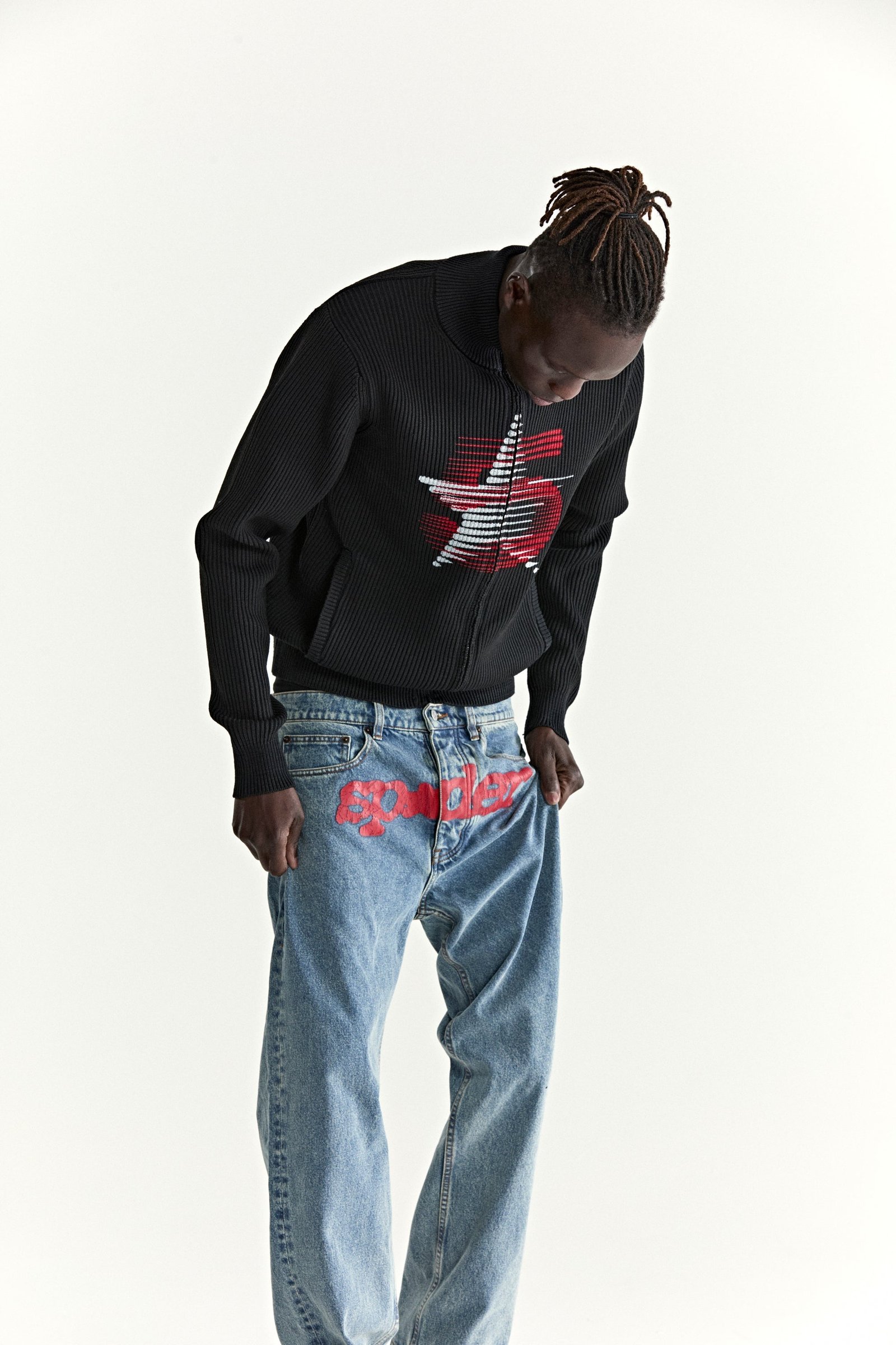 Rib knit wool/cotton blend sweater. Stand collar. Zip closure. Graphic printed at chest.
