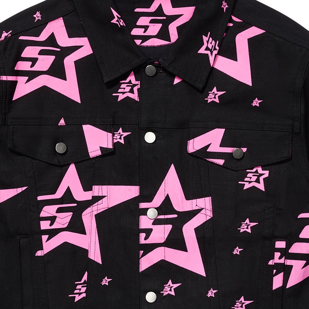 Denim trucker jacket. Pink contrast ‘5 Star’ all over graphic. Silver button closures.