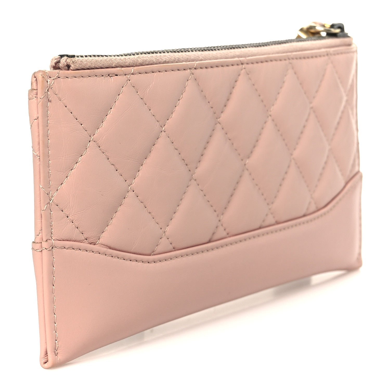 This specific model is crafted from aged calfskin leather in a soft pink, a material prized for its distinctive “wrinkled” or distressed texture that offers a vintage yet luxurious feel. It features the collection’s hallmark diamond quilting (or chevron in some seasonal iterations) across the main body. The signature design element of the Gabrielle line is the dual-structure design, which in this pouch format often translates to a supple, quilted leather upper paired with a smooth calfskin trim or base.