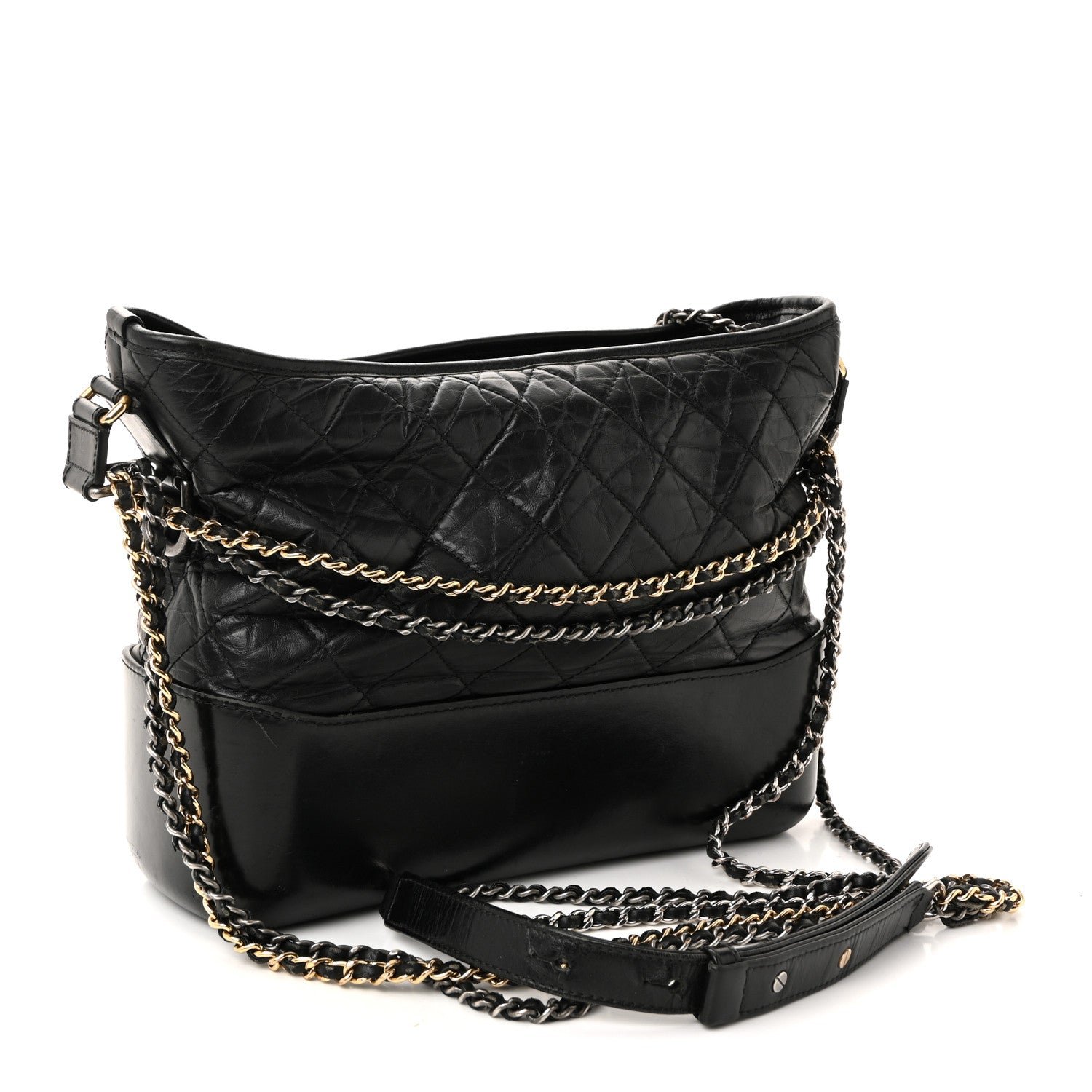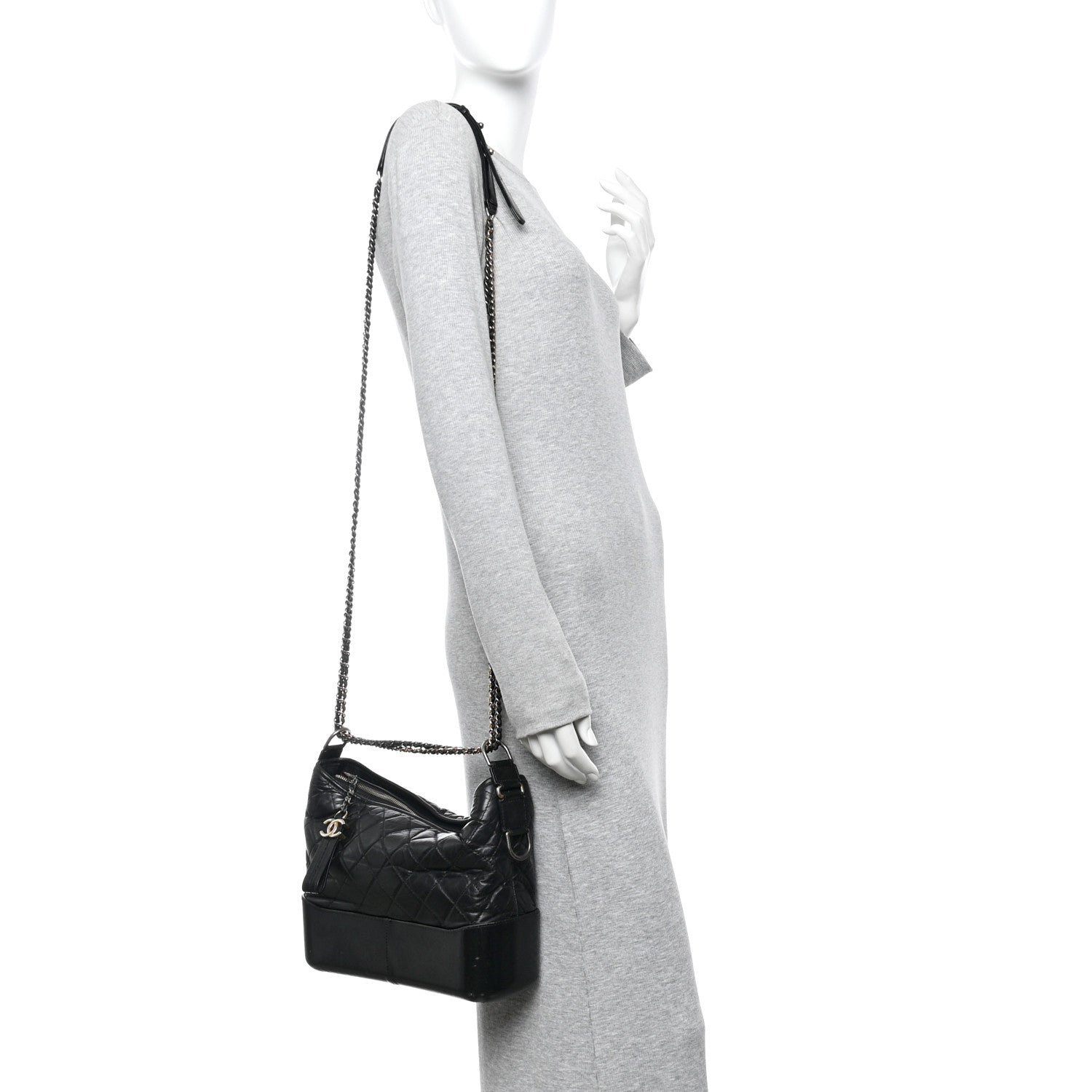 Inspired by the silhouette of vintage binocular cases and designed to be worn in multiple ways, the Gabrielle Hobo reflects a perfect balance of masculine and feminine styles. It is equipped with a unique double interwoven chain strap that allows the bag to be worn on the shoulder, crossbody, or both at once for a contemporary, secure fit. The interior is lined in a signature deep red (burgundy) textile and includes practical organization such as a zip pocket and multiple slip pockets, making it a functional and modern icon of CHANEL’s contemporary range.