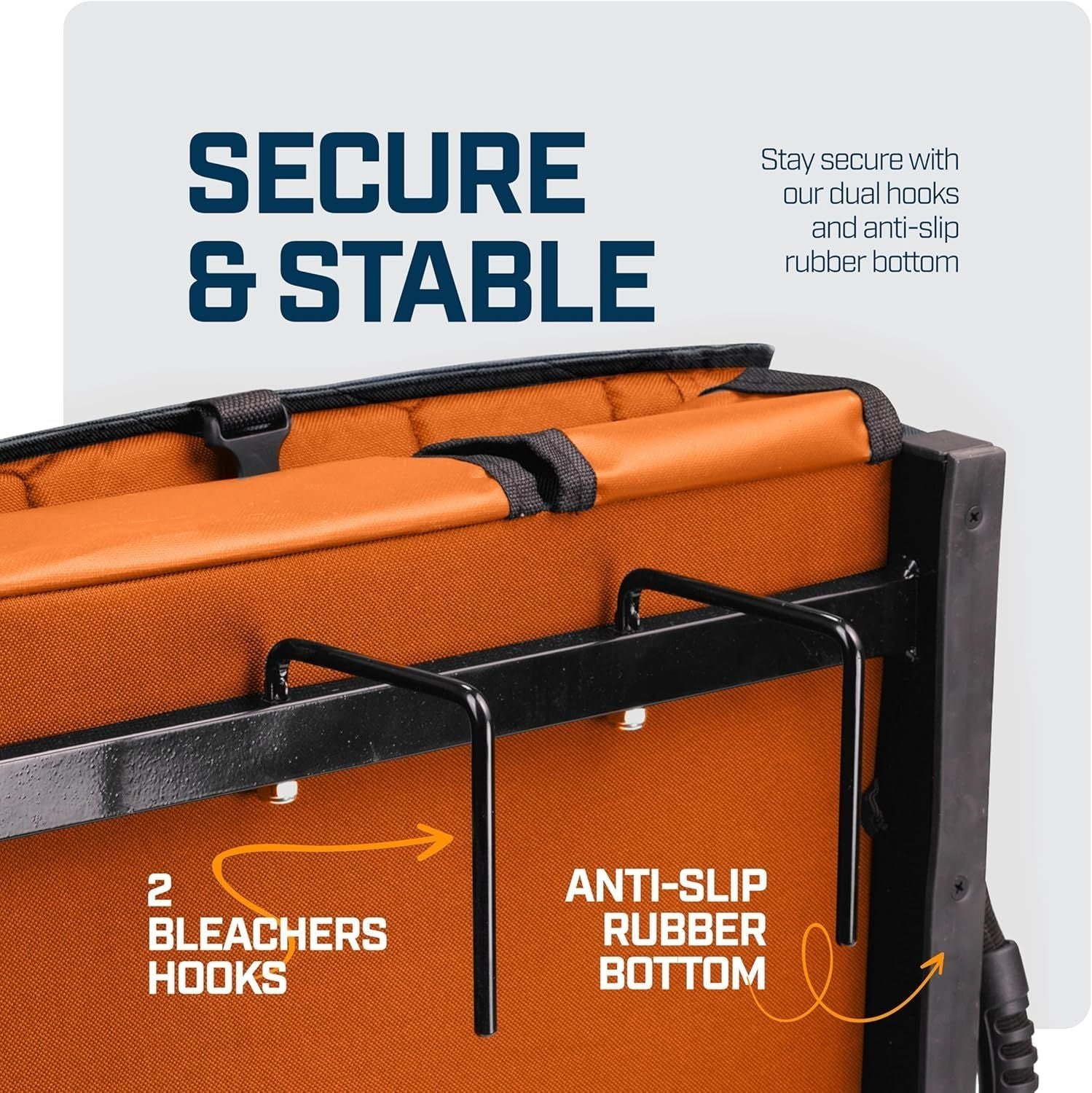 Dual retractable bleacher hooks and an anti-slip rubber base ensure your seat stays in place on bleachers, benches, or other hard surfaces.