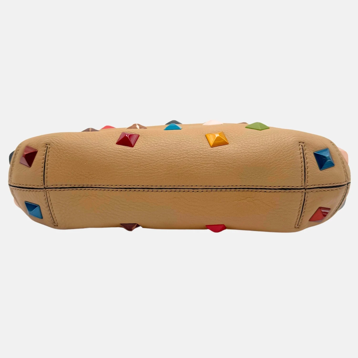 The Fendi B. Fab Studded Bag Small is a bold, statement-making accessory that made waves on the runway and quickly captured the attention of editorial photographers. The bag features a multicolored Pequin striped drawstring pouch inside, complete with a strap for shoulder wear, while the exterior is adorned with vibrant, multicolored lacquered pyramid studs for an edgy and playful design. With a compact, structured shape and detachable chain strap, it offers versatile wear as a shoulder or crossbody bag. The discreet Fendi logo on the front adds a subtle touch of branding. Stylish and functional, this bag covers numerous trends and is sure to be loved for many seasons to come. Retail price: $2840.