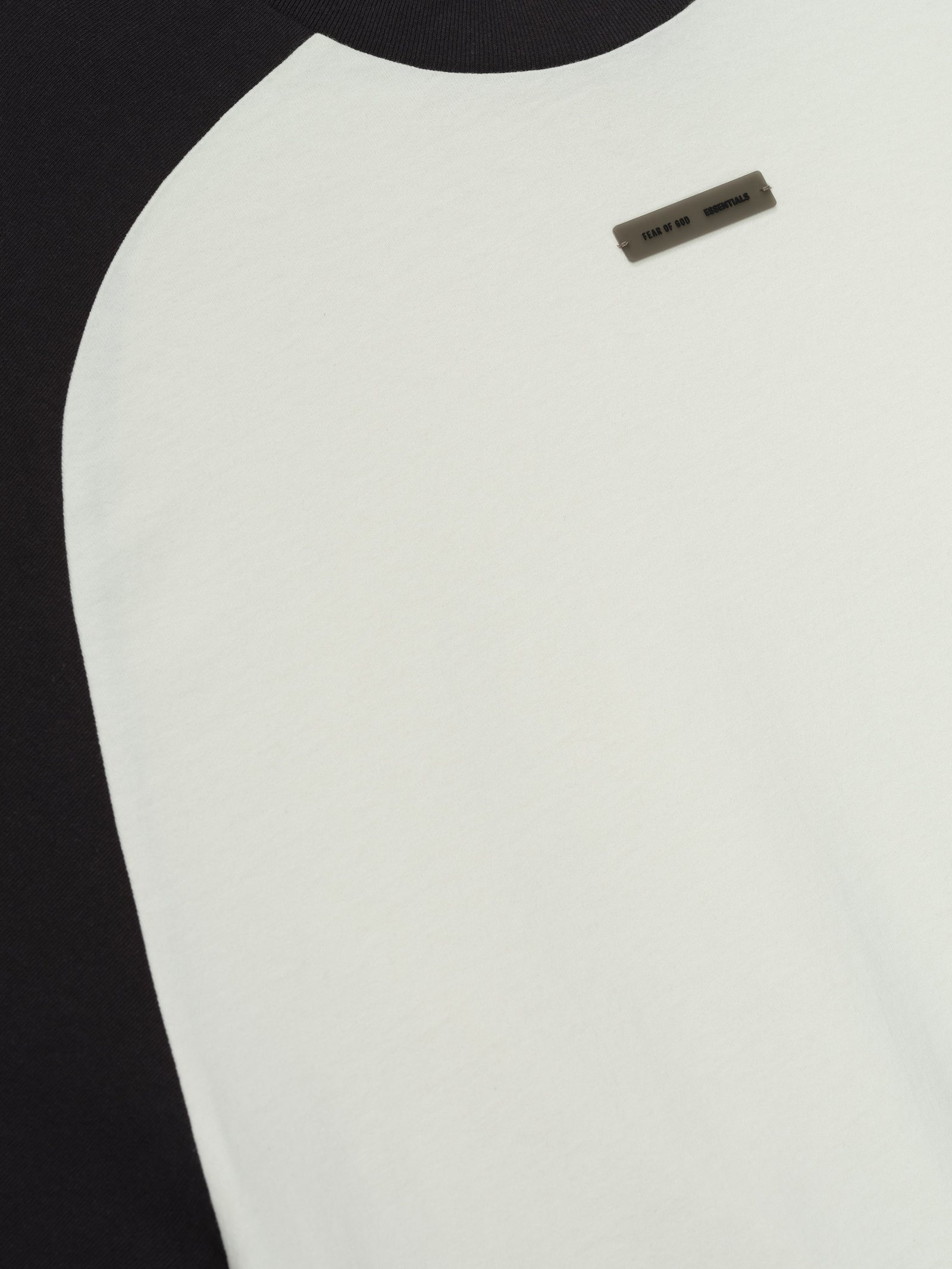 The Baseball Tee is made from medium-weight 100% cotton jersey. The rib-knit crewneck tee features an oversized fit with baseball-inspired 3/4 raglan sleeves that contrast in color. Branding includes the Fear of God Essentials label at the front.