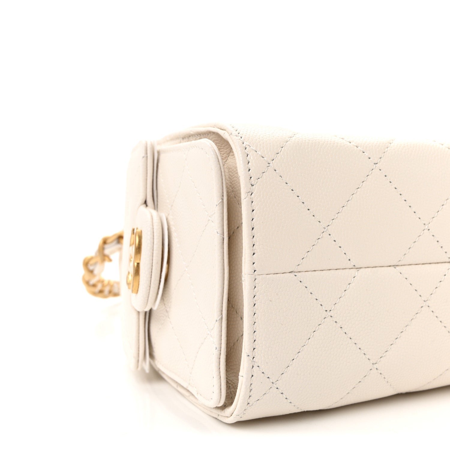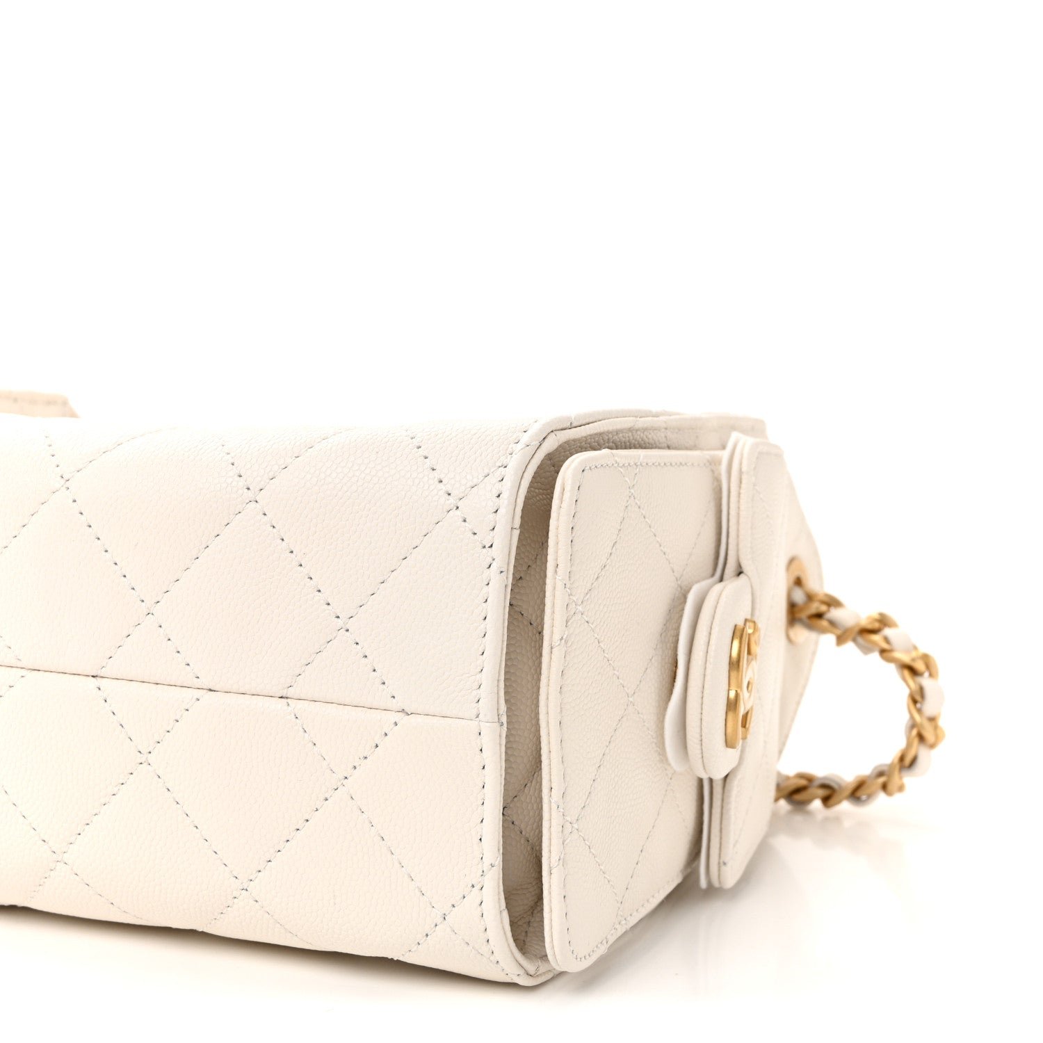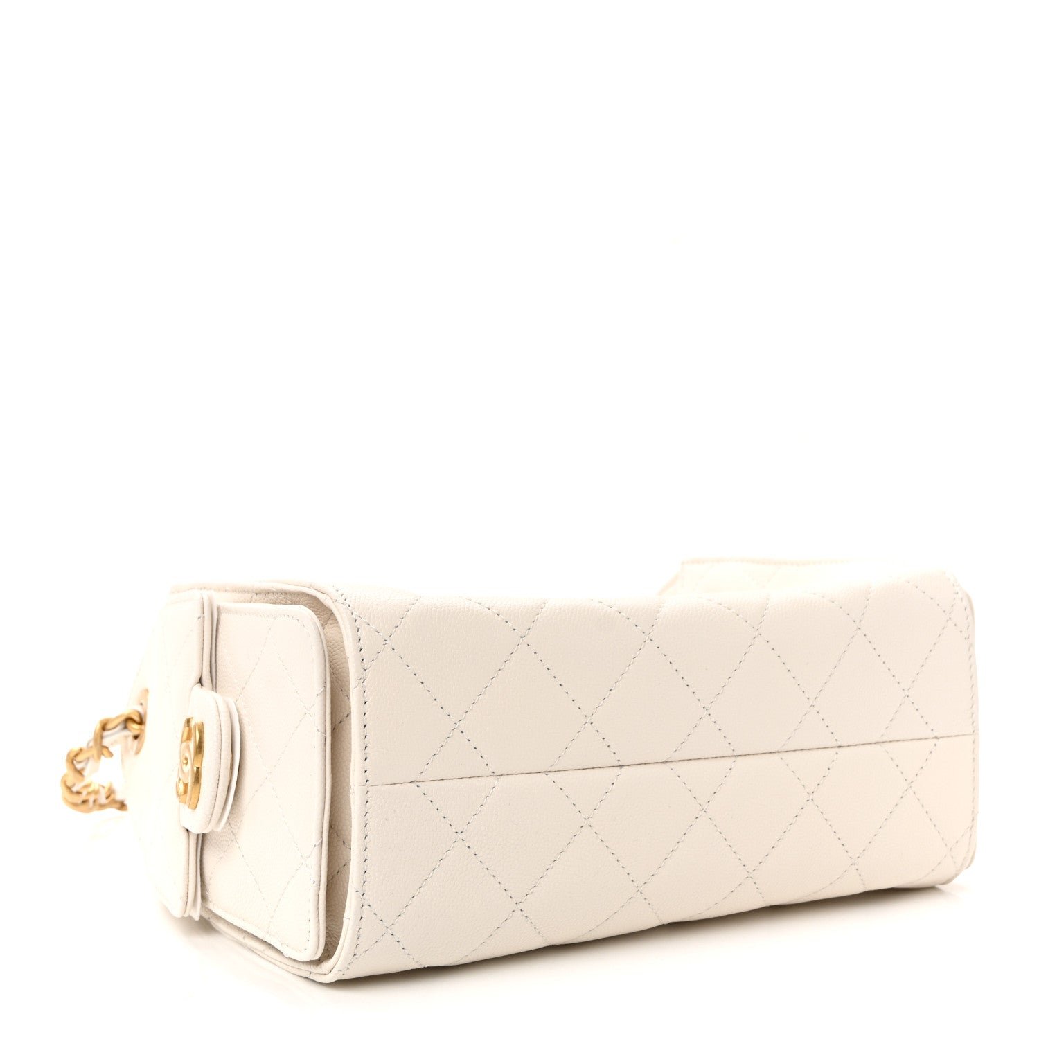 Material: It is crafted from white quilted caviar leather (grained calfskin), a durable and scratch-resistant material prized for its pebbled texture.