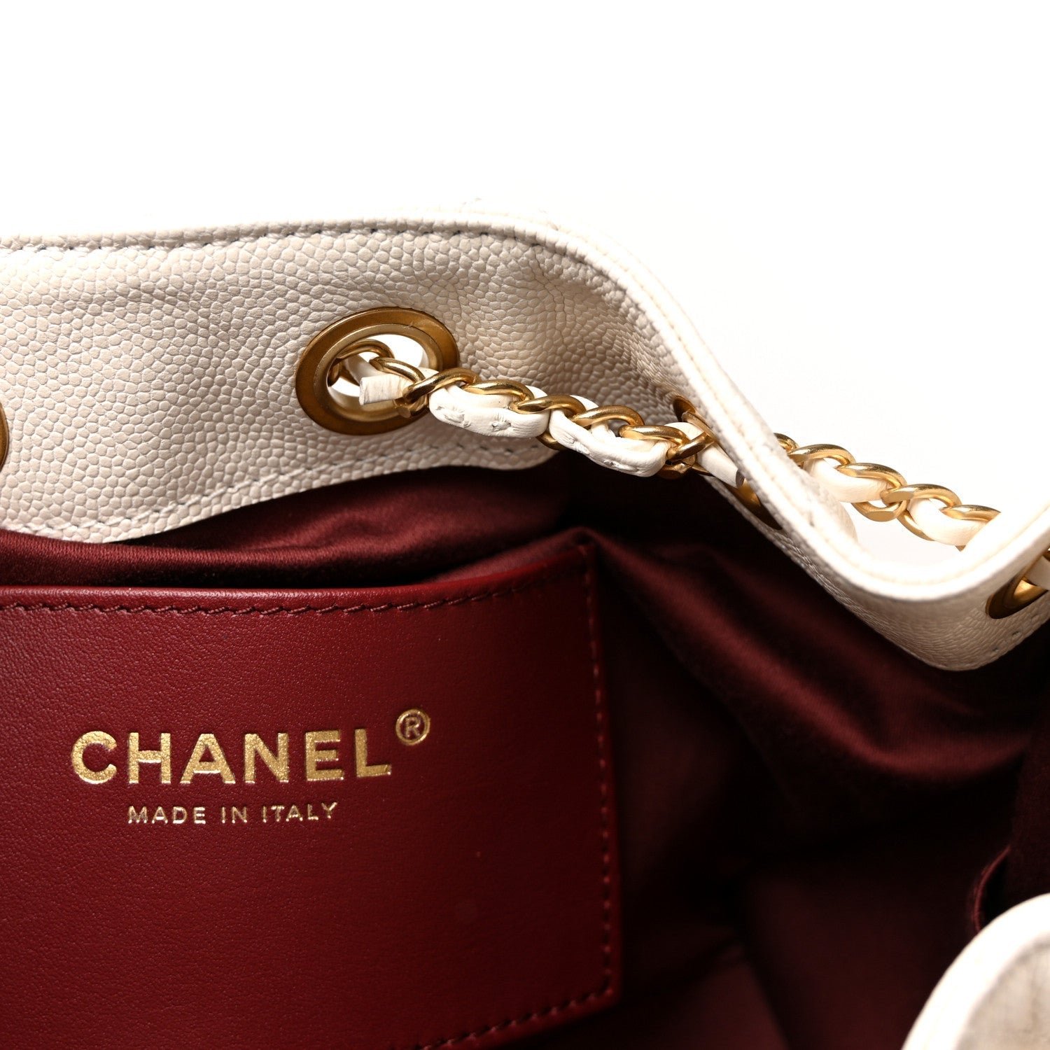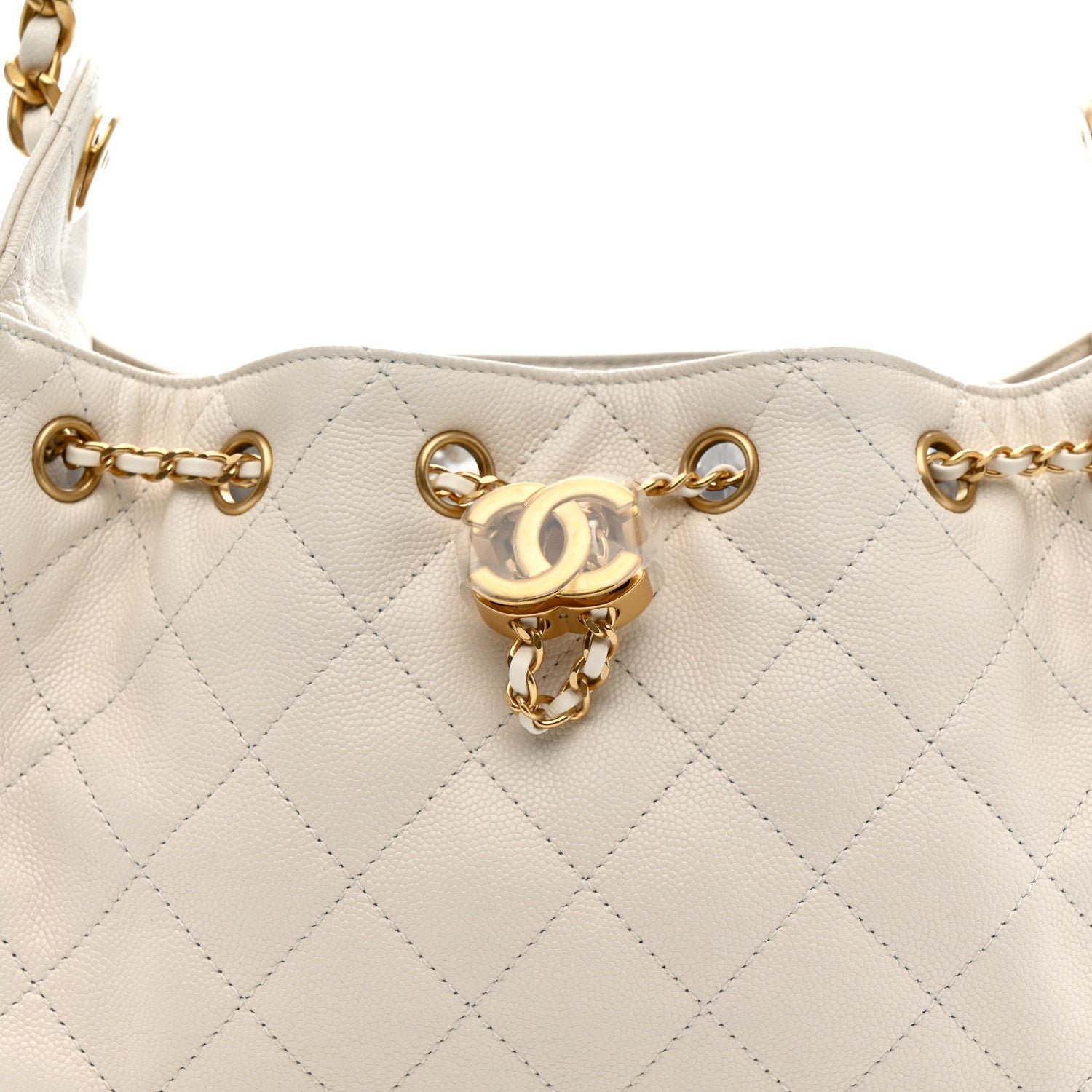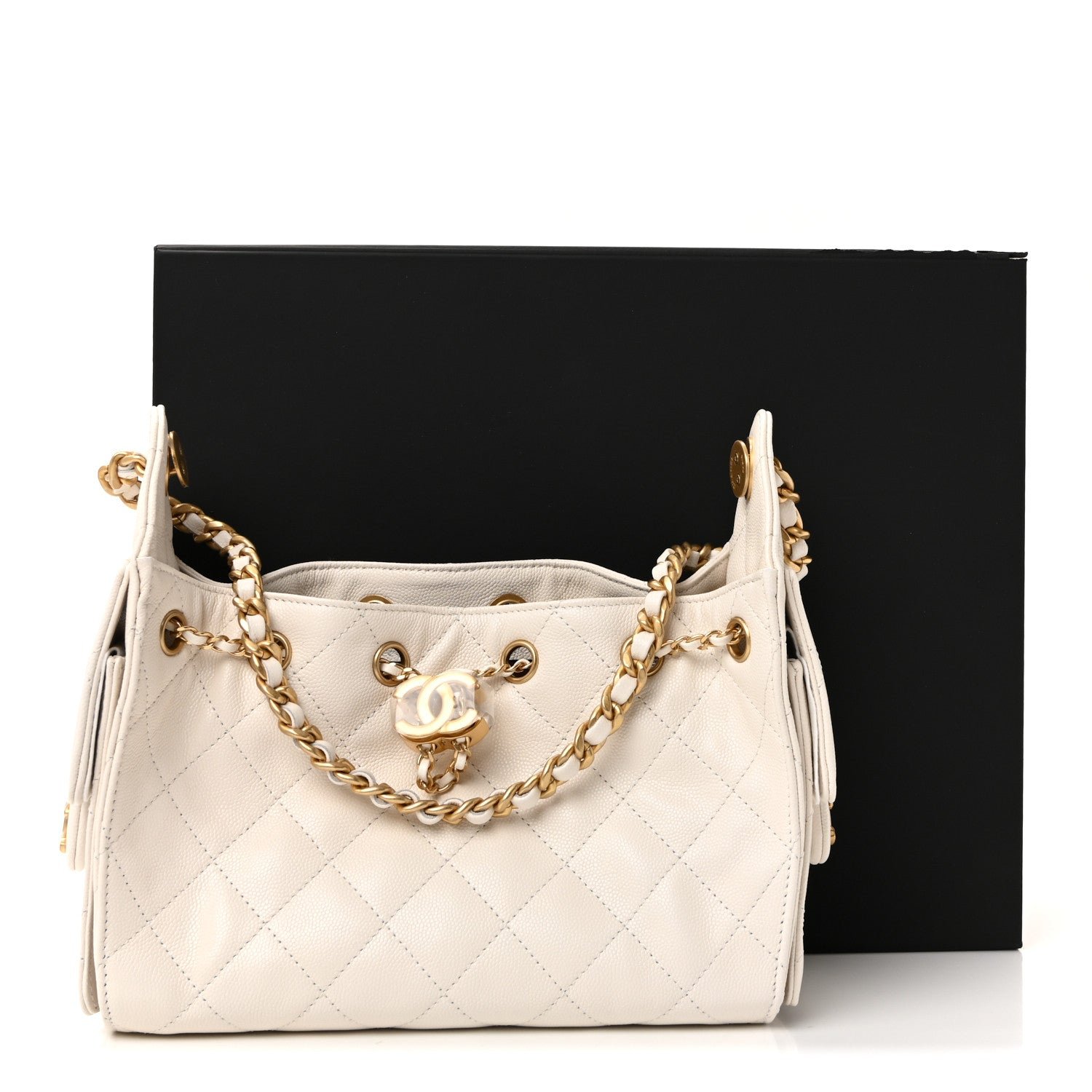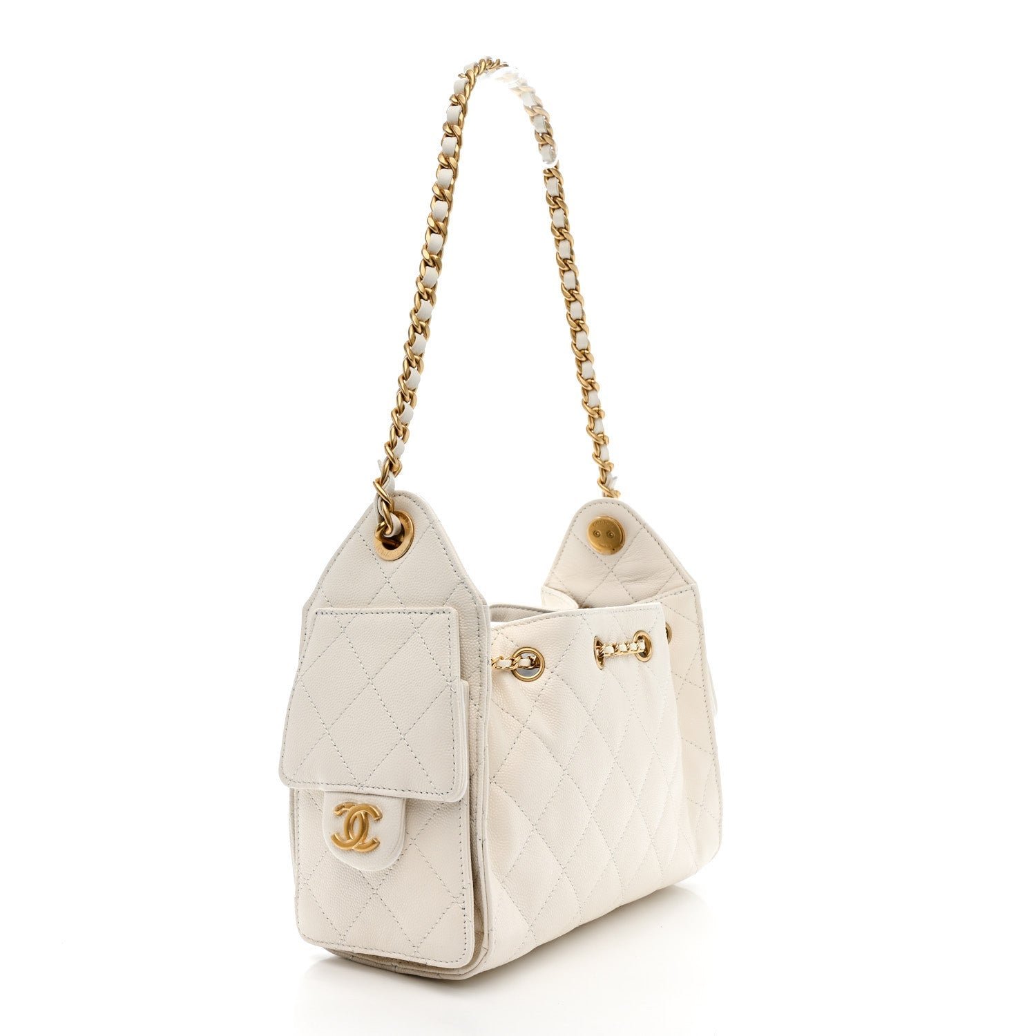 Material: It is crafted from white quilted caviar leather (grained calfskin), a durable and scratch-resistant material prized for its pebbled texture.