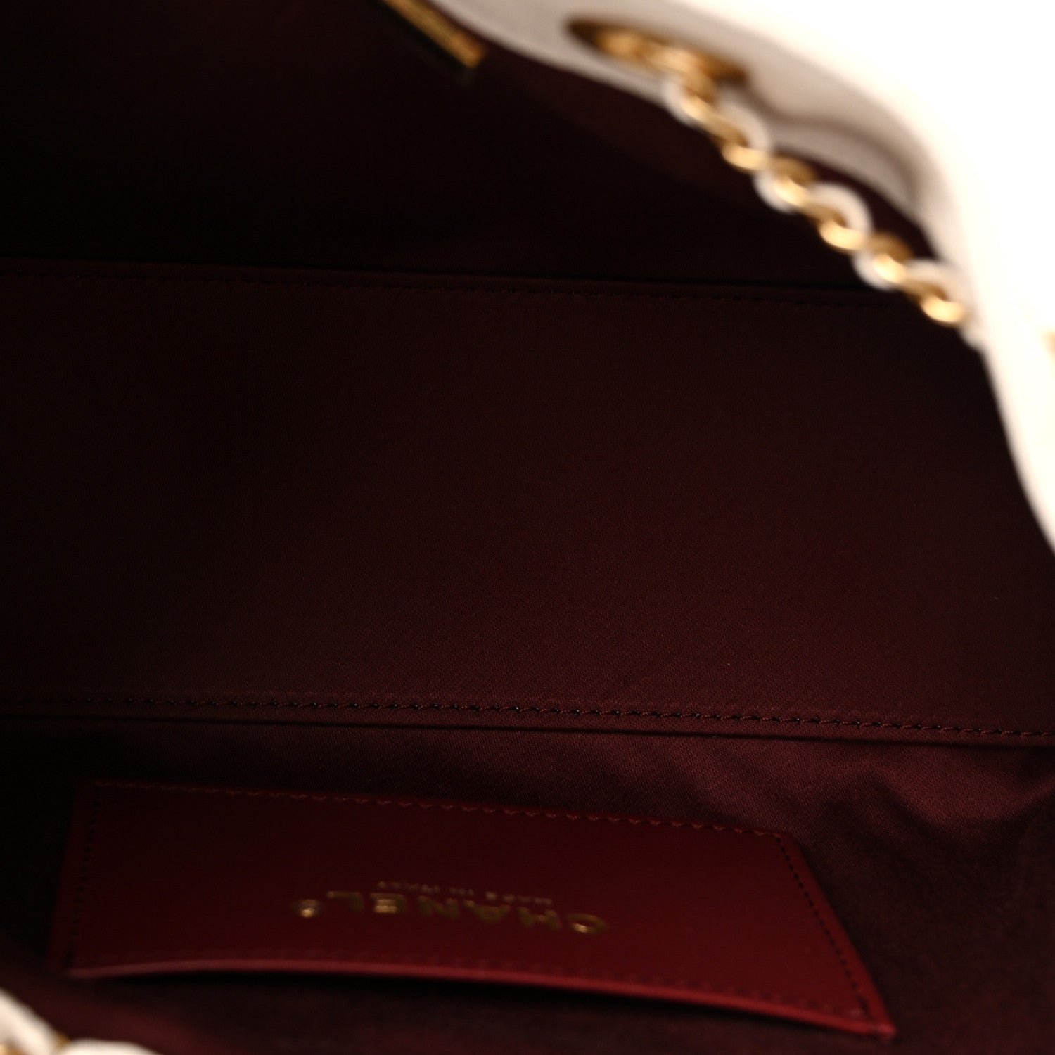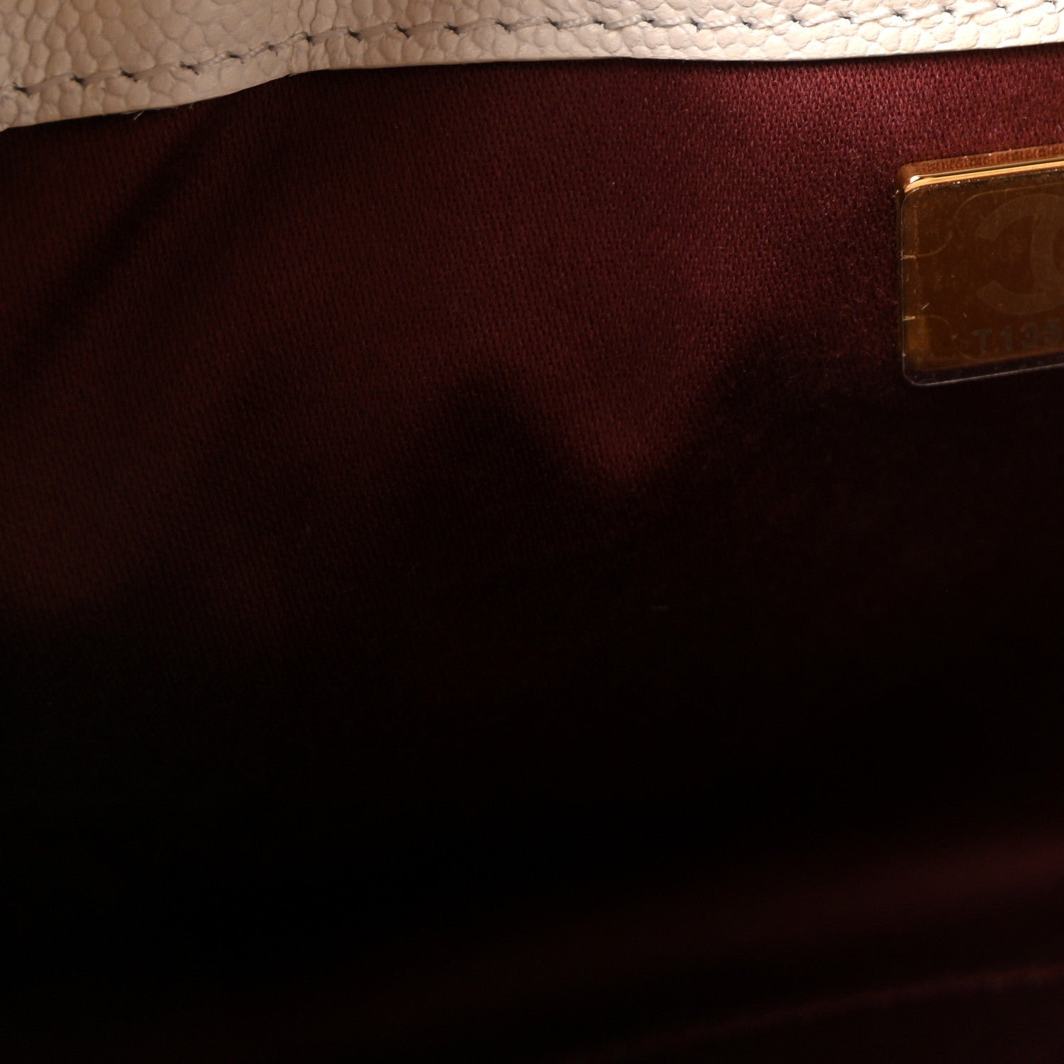 Hardware: It is adorned with polished antique gold-tone hardware, including a signature interlocking CC turn-lock closure on the front.