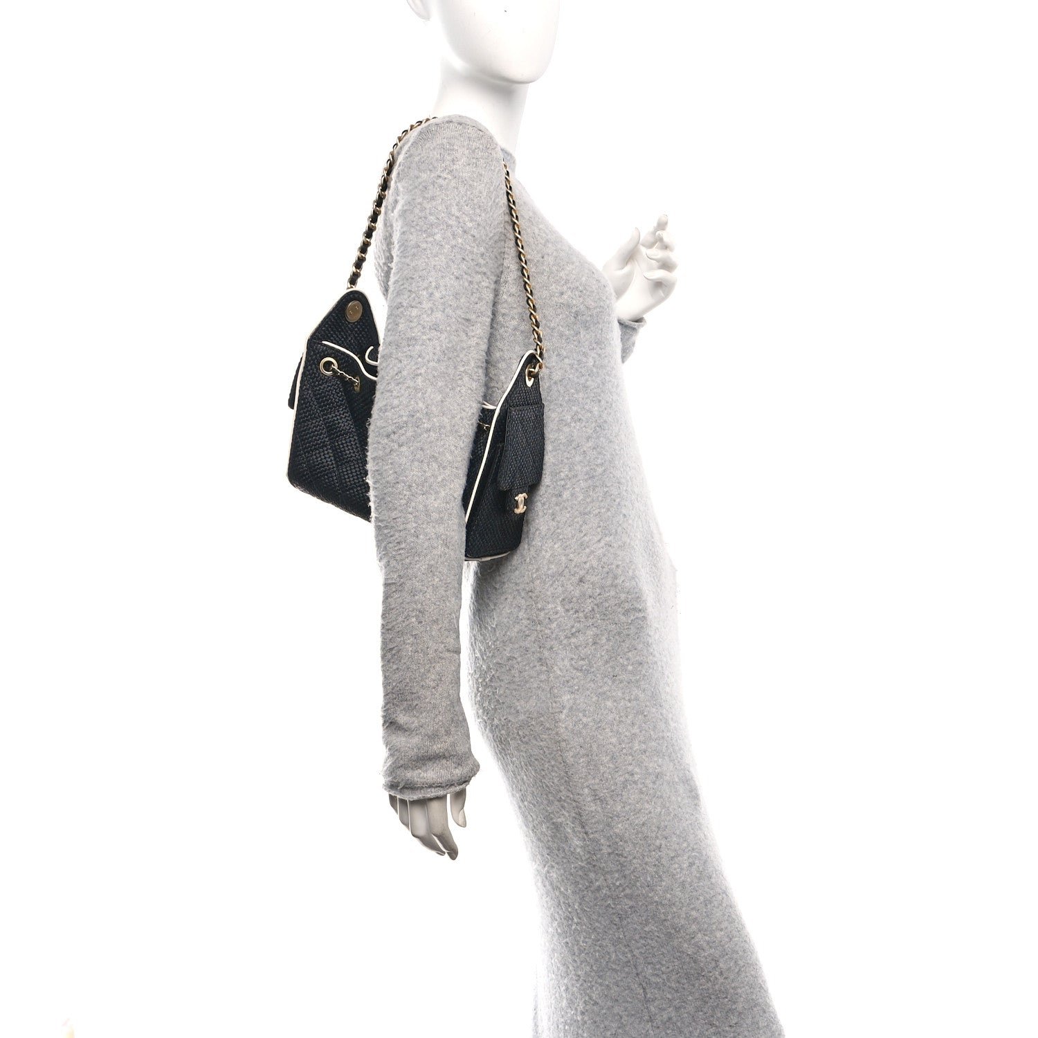 • Design Features: Drawstring closure with push-lock CC, two side pockets, and an interwoven chain-and-leather strap.