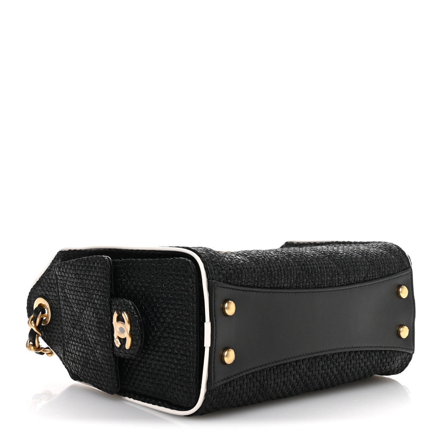 This specific model is crafted from braided raffia-effect canvas and smooth calfskin leather, presenting a refined contrast between organic summer textures and structured luxury. The design features a crisp black and white (or beige and black) palette, with the braided material providing a breathable, “vacation-ready” feel that is elevated by the house’s signature leather craftsmanship.
