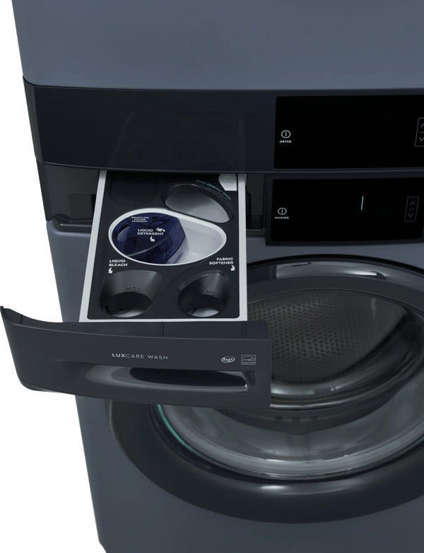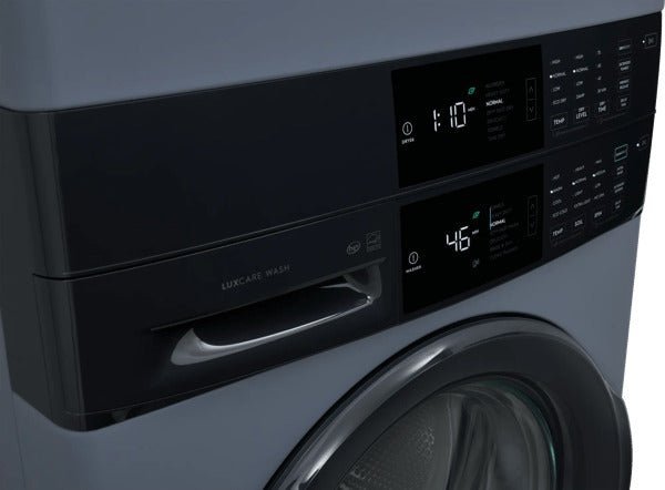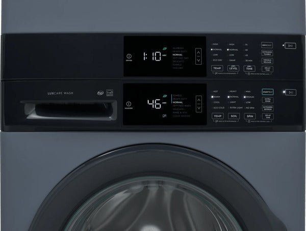 Fully integrated vertical layout takes up half the floor space of a traditional washer/dryer for greater laundry room flexibility. Features a full-sized washer on bottom, a full-sized dryer on the top, and a control panel in the middle for easy access.