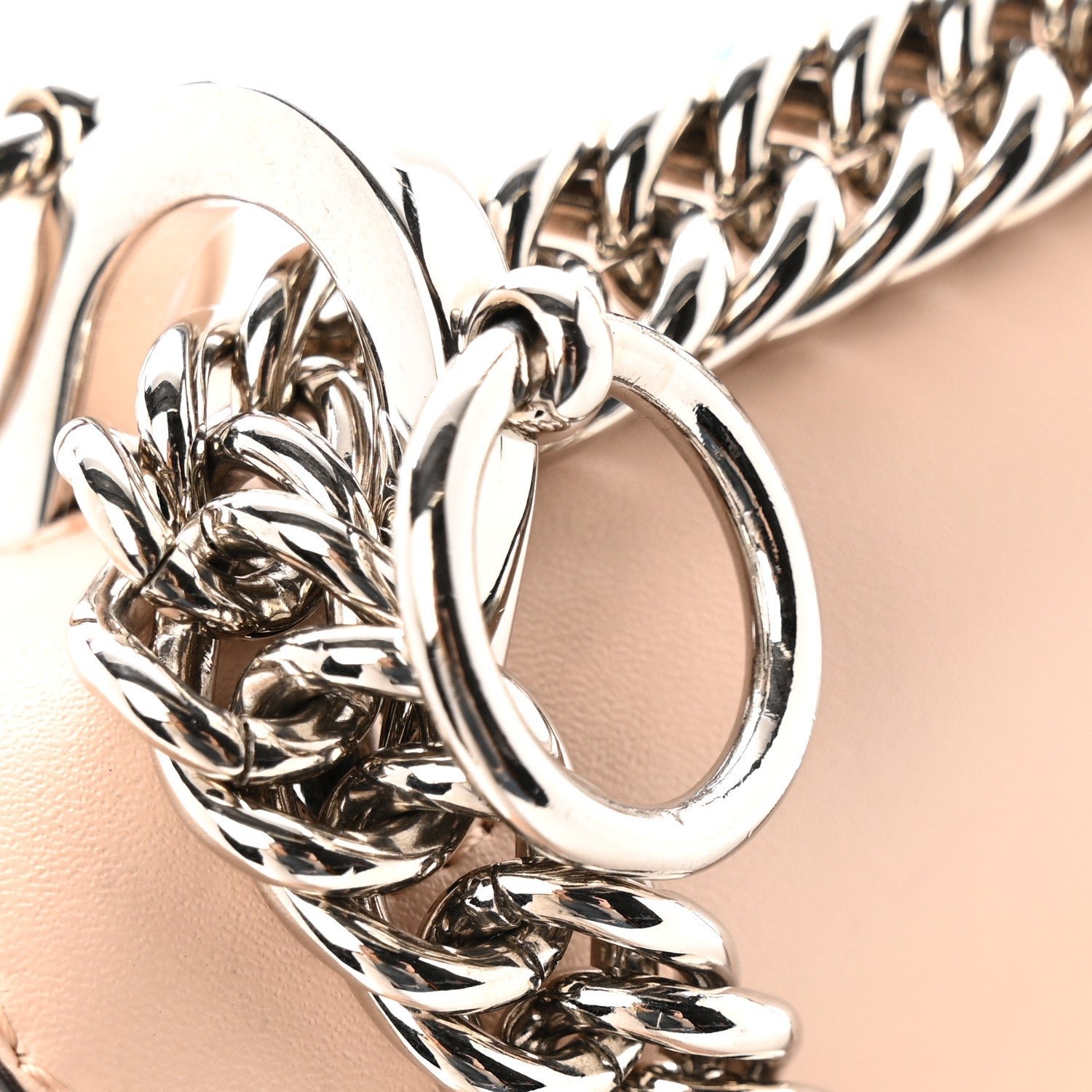 Handle/Strap: Sliding chain shoulder strap with a leather shoulder pad for comfort.