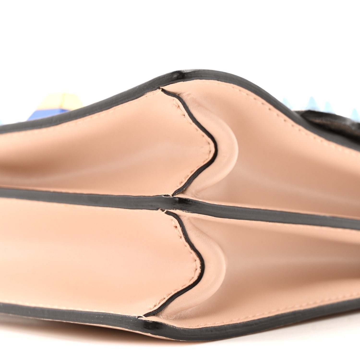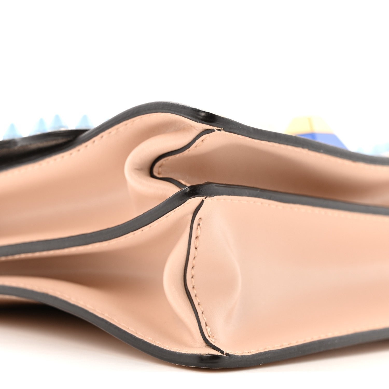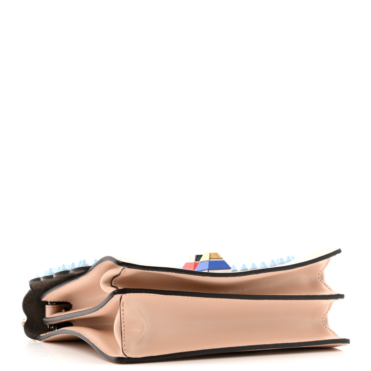 Hardware: Polished gold-finish metalware with multicolor plexiglass pyramid studs.