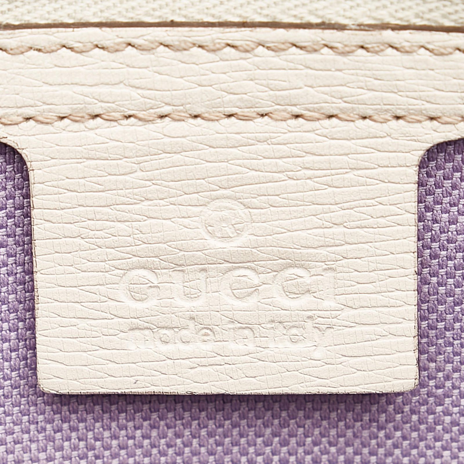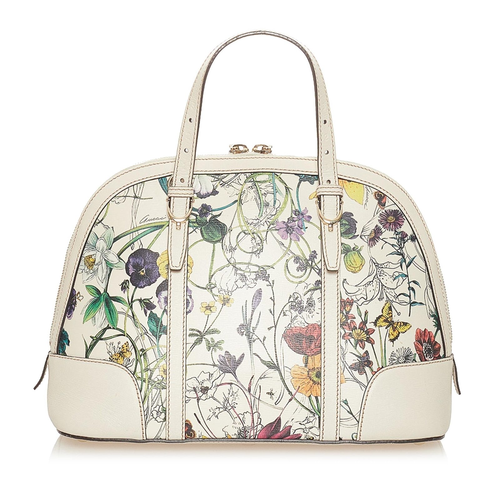The Gucci Flora Nice Coated Canvas Satchel is a vibrant and elegant accessory that combines the House’s craftsmanship with a playful floral design. Crafted from white leather with coated canvas floral print, this satchel features dual handles for comfortable handheld carry and protective metal feet at the base for durability. Polished gold-tone hardware accents the design, adding a touch of luxury.