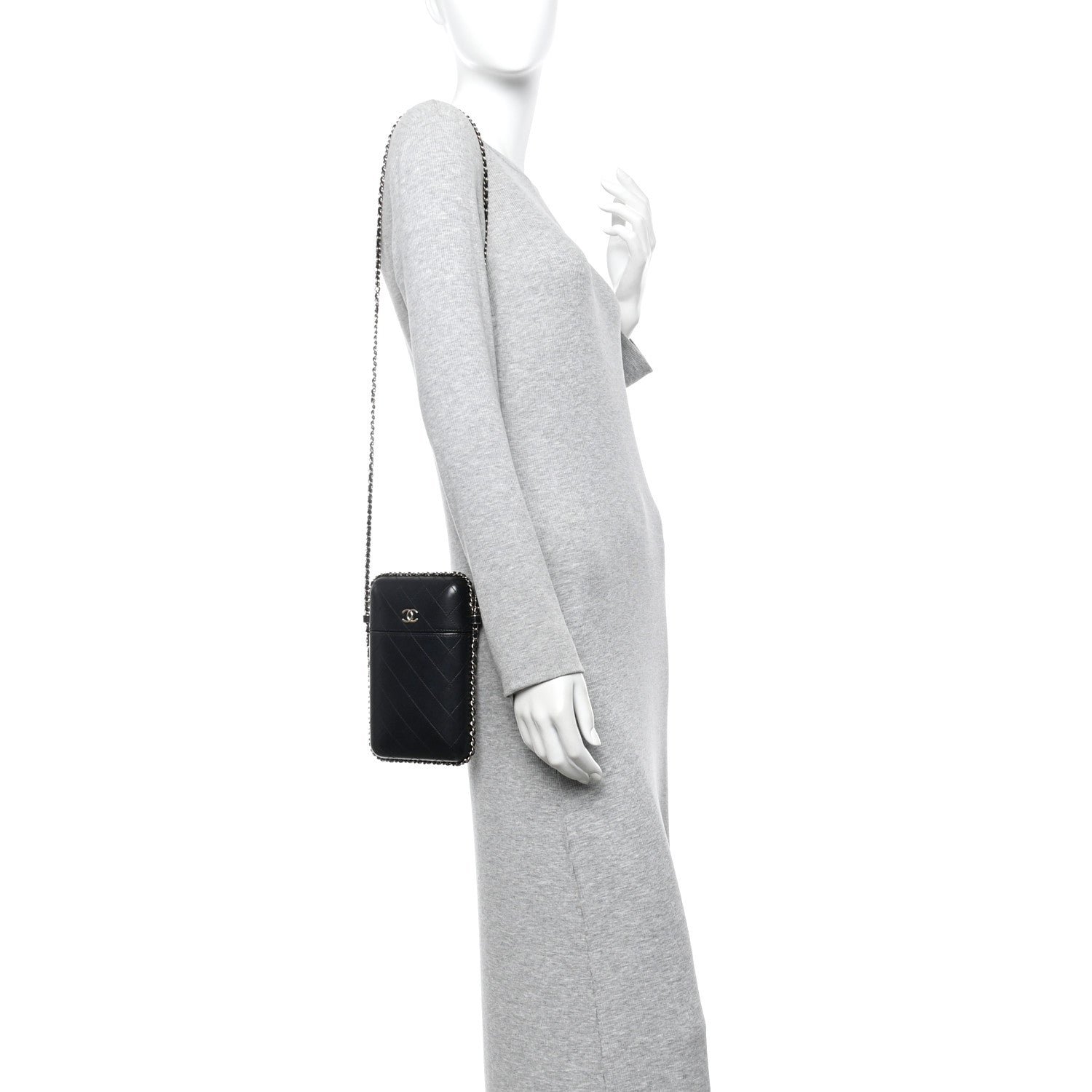 The Chanel Lambskin Quilted Chain Around Phone Holder in black with silver-tone metal is a chic, modern tech accessory designed for hands-free convenience. Part of the popular “Chain Around” line, it is characterized by the decorative metal chain that borders the edges of the bag’s silhouette.
