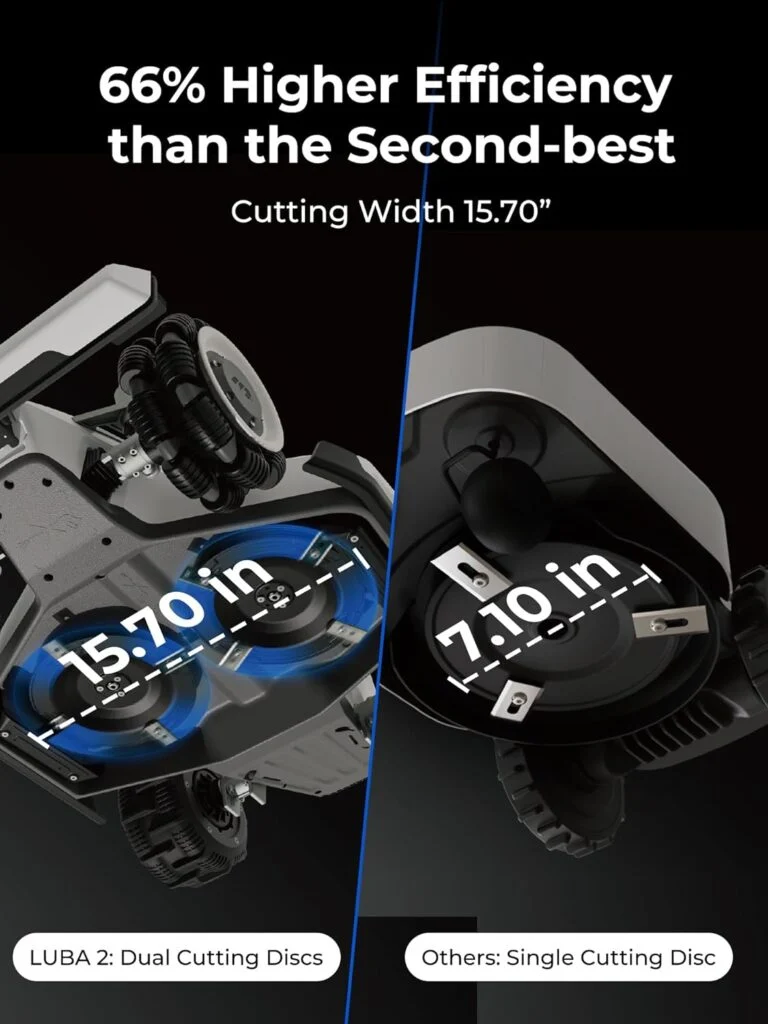 - RTK+Vision Integration, A trust Choice for Complex and Terrain: With enhanced RTK signal coverage and 3D vision positioning technology, places with weak signals or hefty trees coverage is no more a problem. LUBA 2 AWD 3000H All-Wheel Drive automatic robot lawn mower can navigate narrow passages, objects and slopes, handling slopes of up to 80%/ 38-degrees, cuts at a max height of 4 inches, and covers up to 3,767 square feet per hour, perfect for lawns that up to 0.75 acres.
