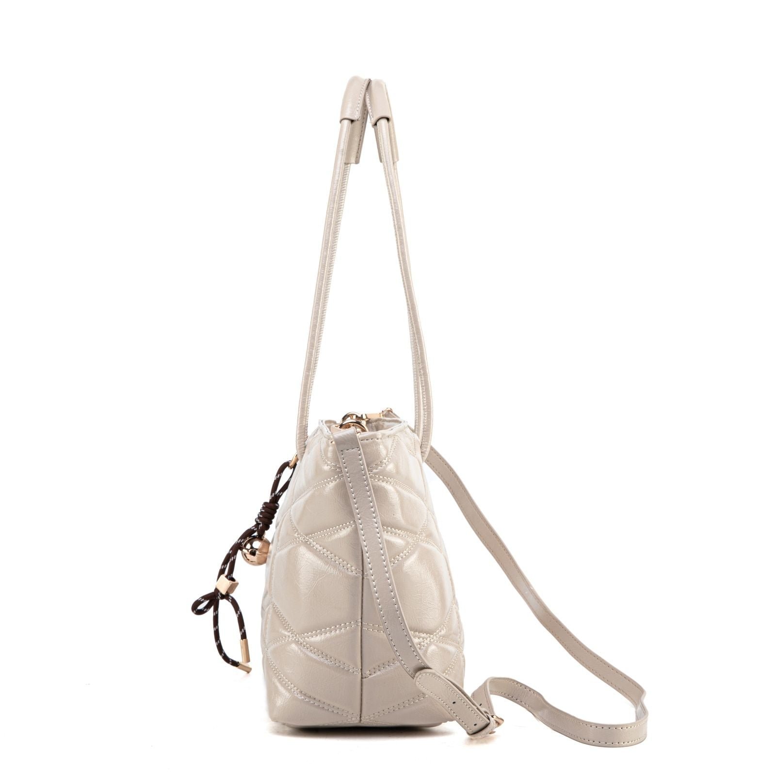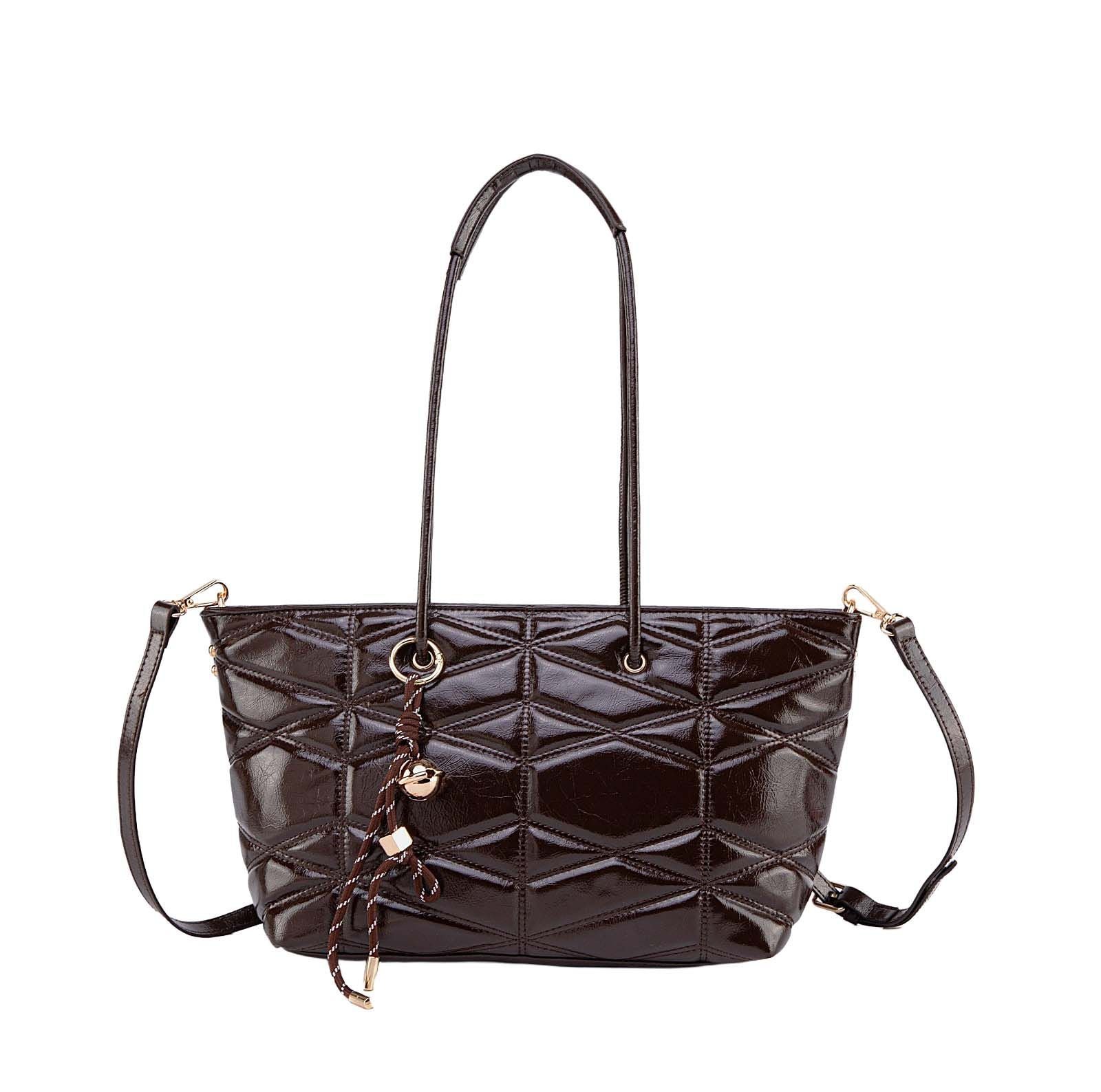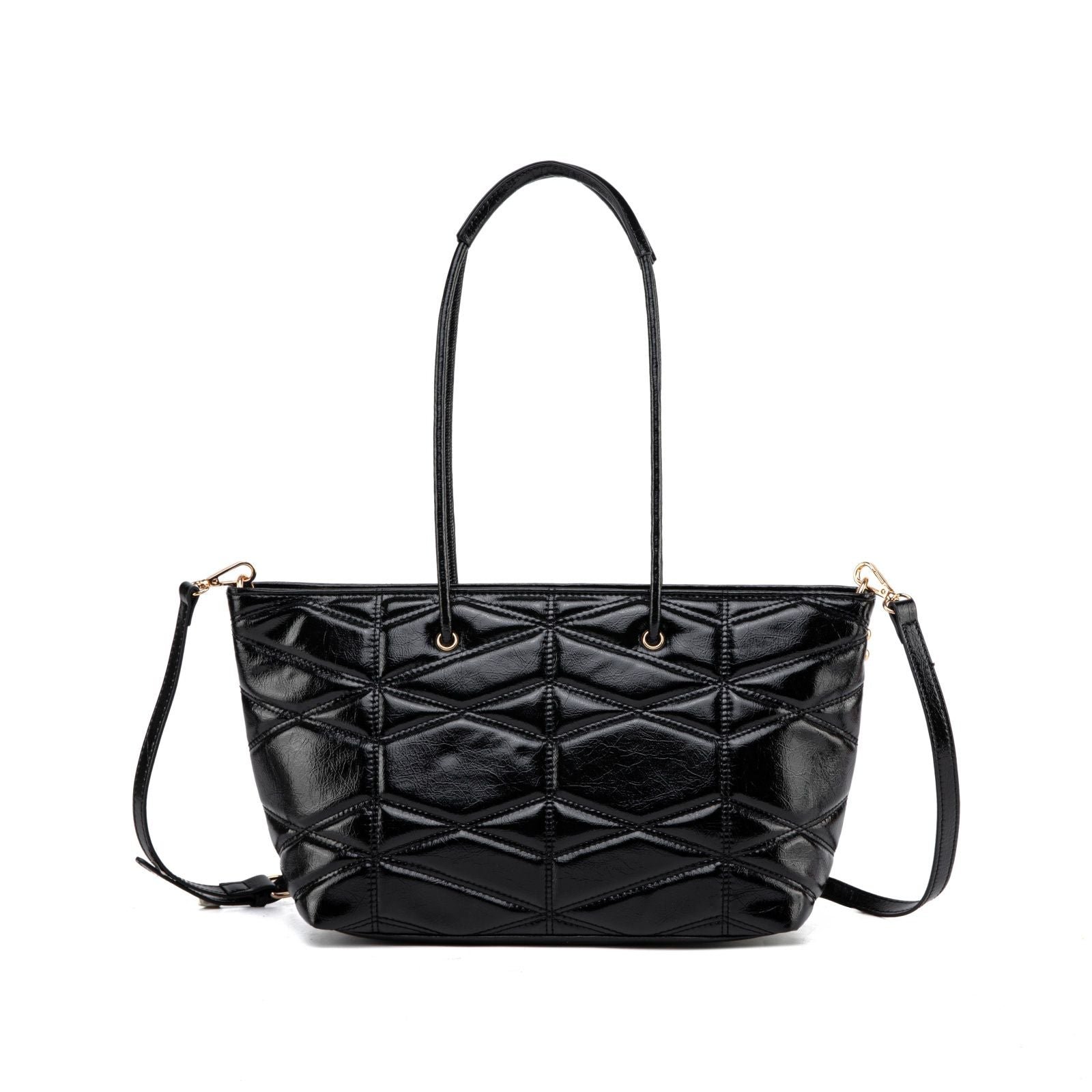 Modern, spacious, and effortlessly chic, this quilted tote is designed to elevate your everyday routine with style and practicality. Crafted from glossy faux leather with a bold geometric quilt pattern, it offers a sophisticated texture that catches the light beautifully. The elongated shoulder handles provide comfortable all-day wear, while the removable crossbody strap gives you a hands-free option whenever you need it.