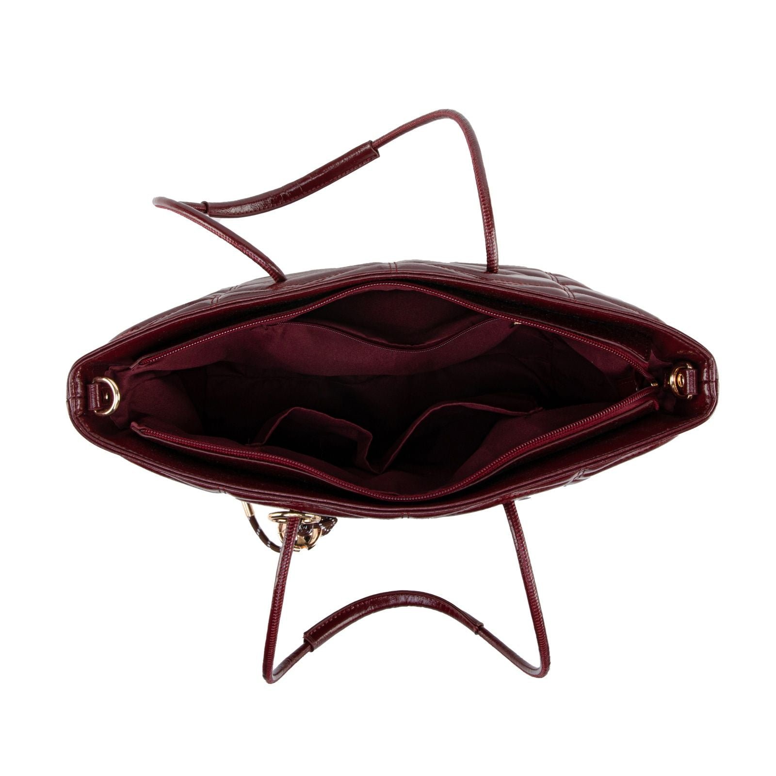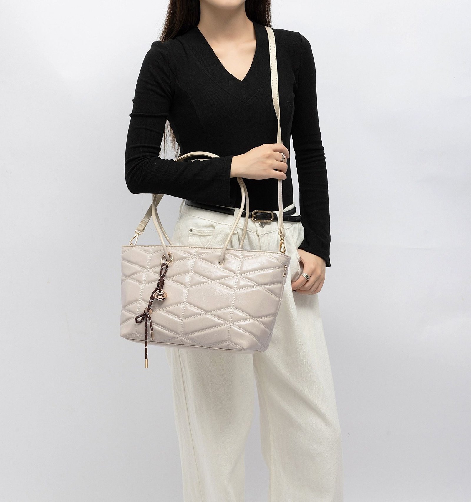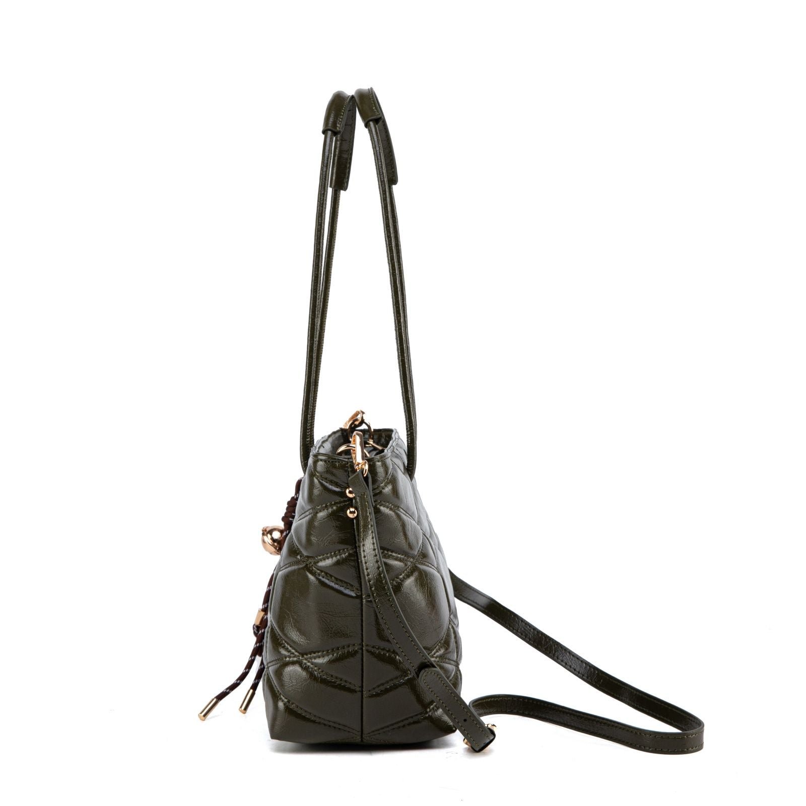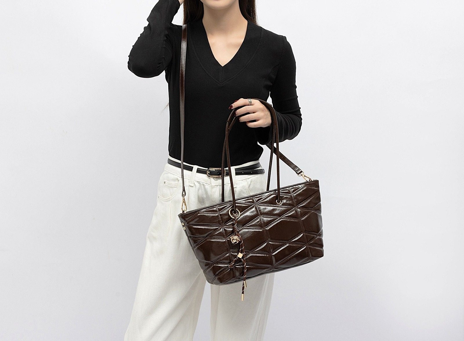 Modern, spacious, and effortlessly chic, this quilted tote is designed to elevate your everyday routine with style and practicality. Crafted from glossy faux leather with a bold geometric quilt pattern, it offers a sophisticated texture that catches the light beautifully. The elongated shoulder handles provide comfortable all-day wear, while the removable crossbody strap gives you a hands-free option whenever you need it.