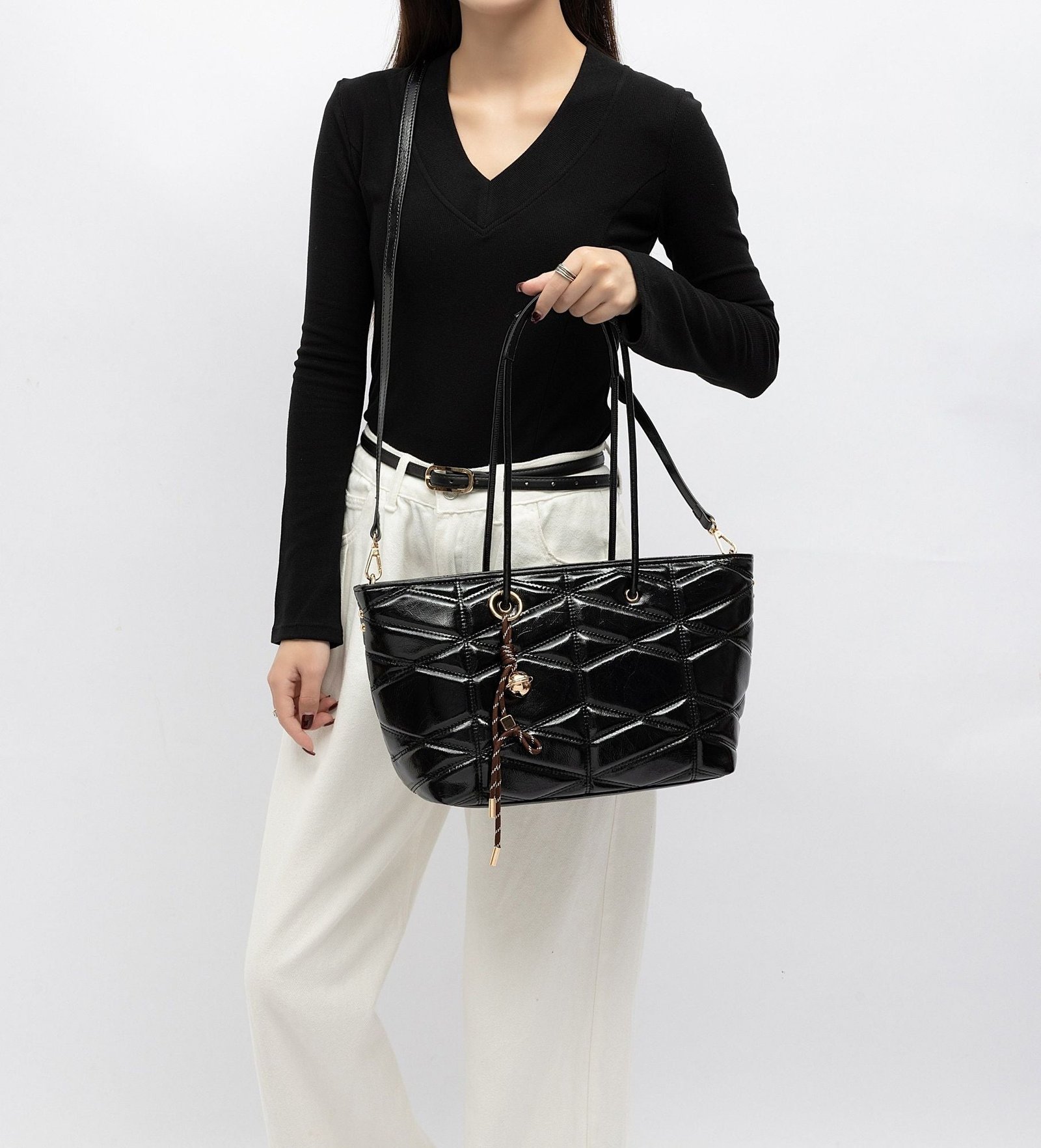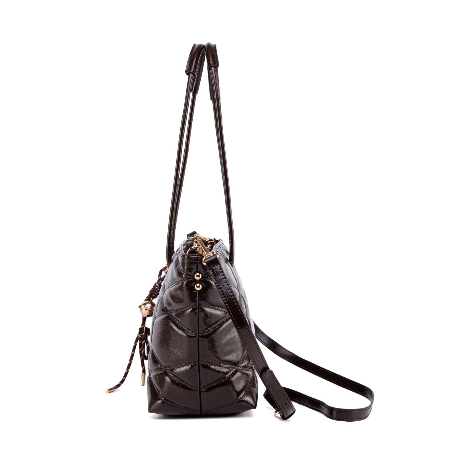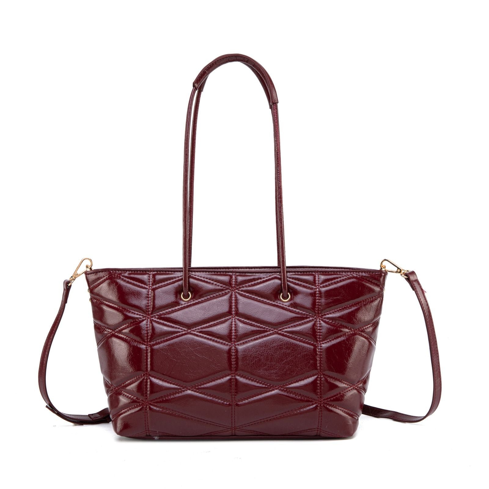 Modern, spacious, and effortlessly chic, this quilted tote is designed to elevate your everyday routine with style and practicality. Crafted from glossy faux leather with a bold geometric quilt pattern, it offers a sophisticated texture that catches the light beautifully. The elongated shoulder handles provide comfortable all-day wear, while the removable crossbody strap gives you a hands-free option whenever you need it.