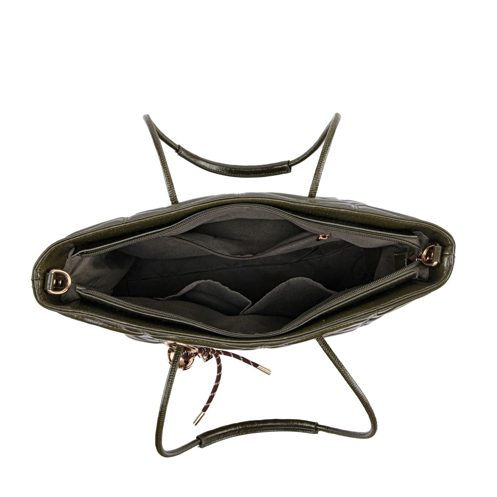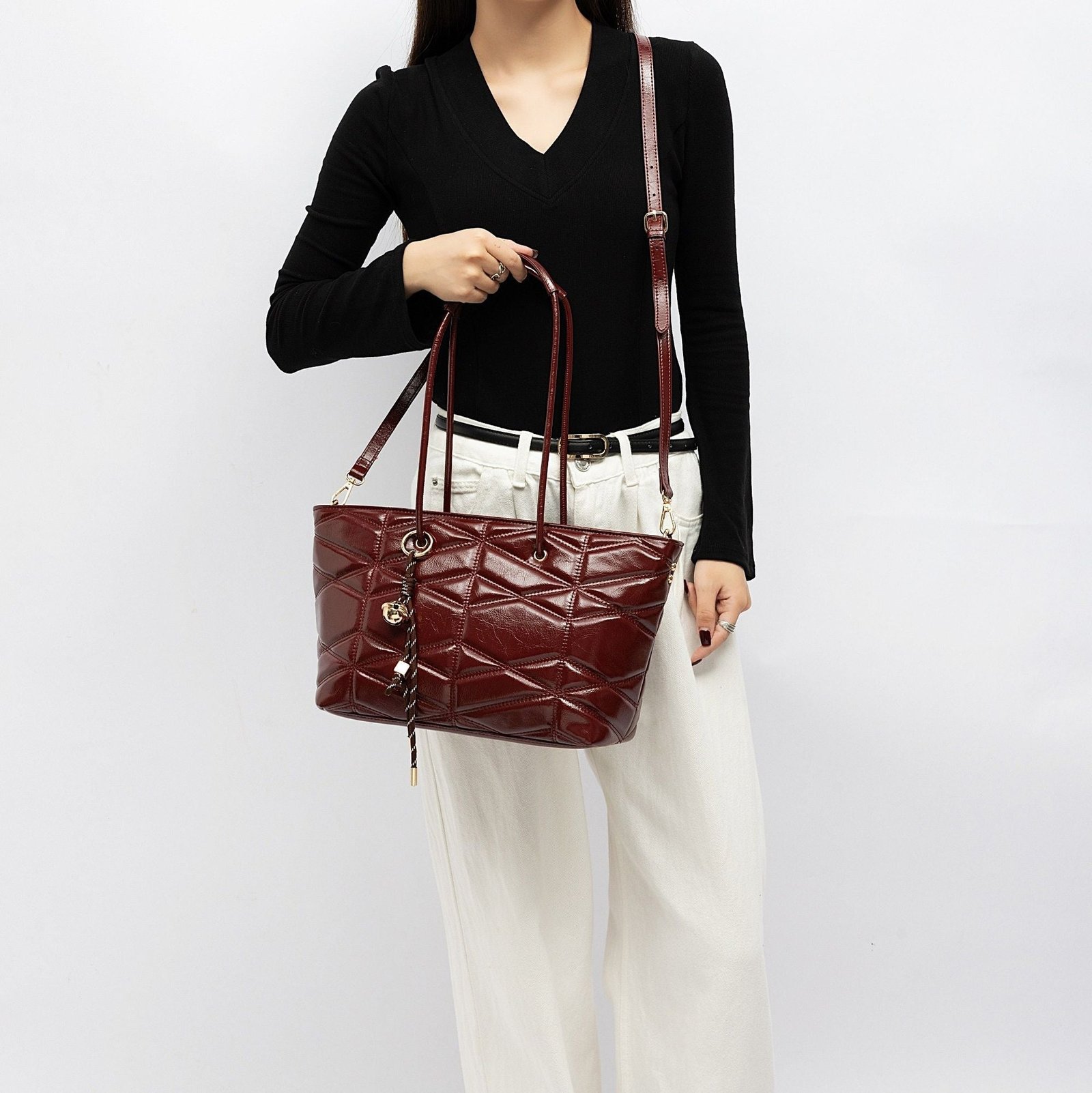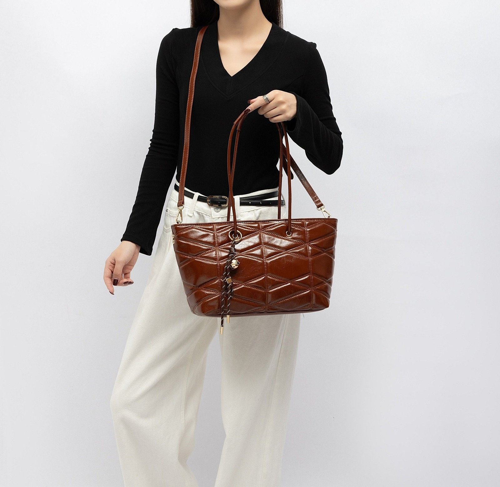 Modern, spacious, and effortlessly chic, this quilted tote is designed to elevate your everyday routine with style and practicality. Crafted from glossy faux leather with a bold geometric quilt pattern, it offers a sophisticated texture that catches the light beautifully. The elongated shoulder handles provide comfortable all-day wear, while the removable crossbody strap gives you a hands-free option whenever you need it.