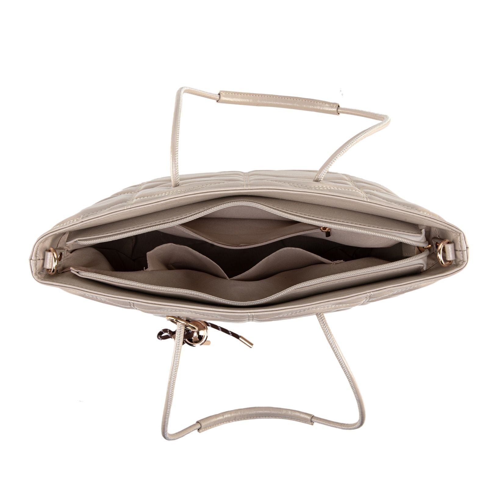 The open interior is secured with a top zipper and offers generous space for all your essentials, making it perfect for work, errands, or day-to-day outings. Inside, you’ll find multiple pockets that help keep everything organized, from your phone and keys to small personal items. A subtle gold-tone detachable charm detail adds a playful, polished touch without overwhelming the clean silhouette.