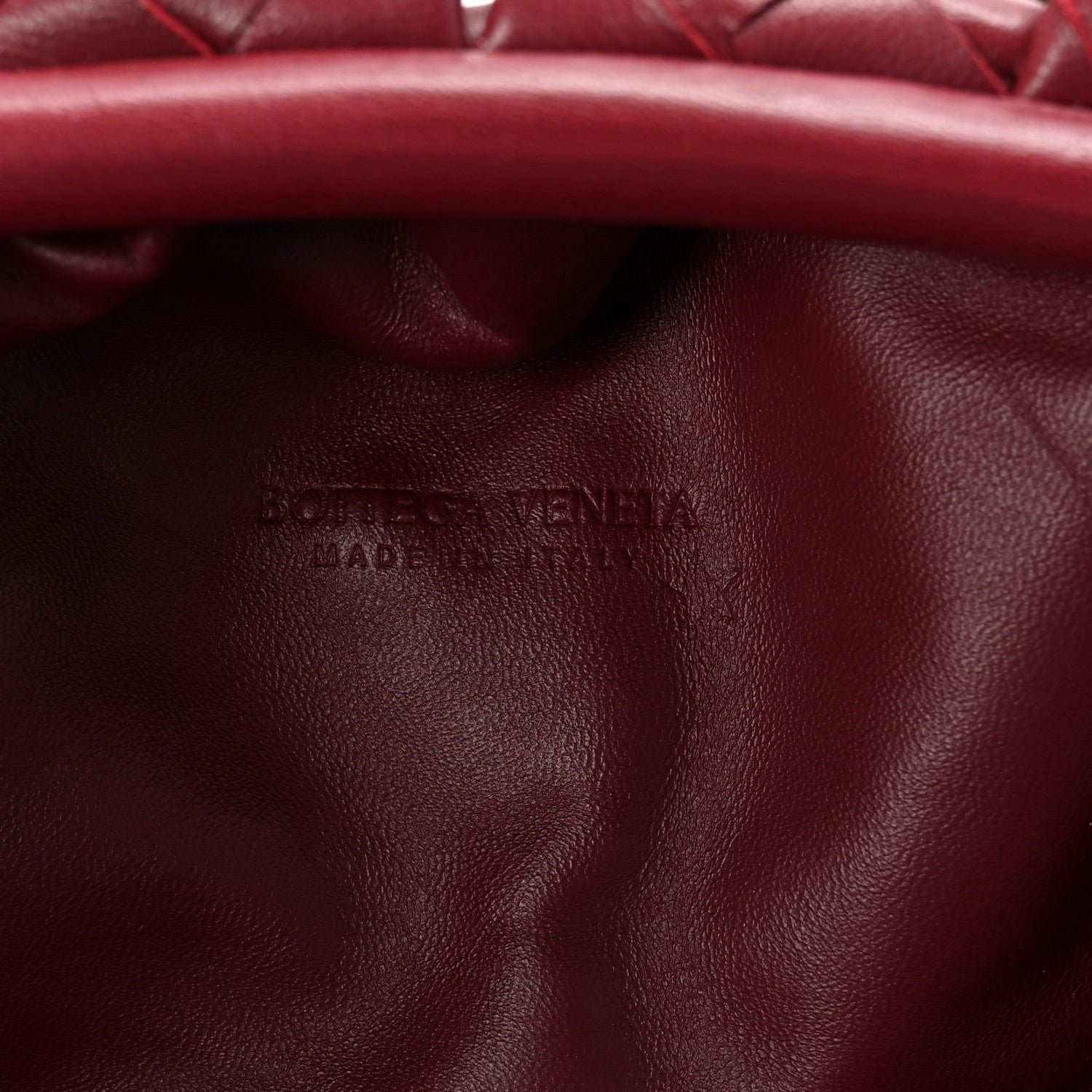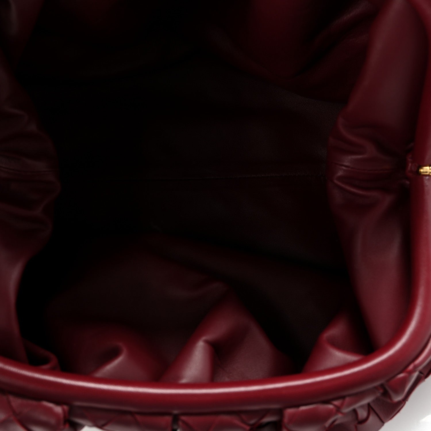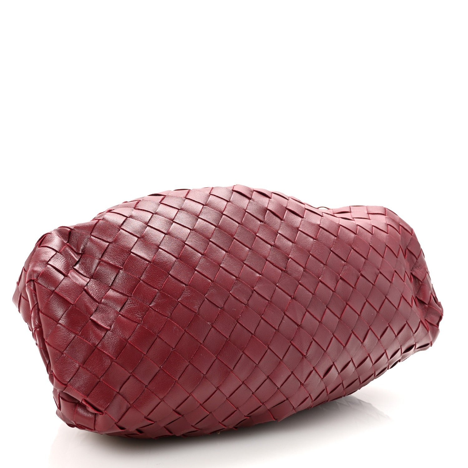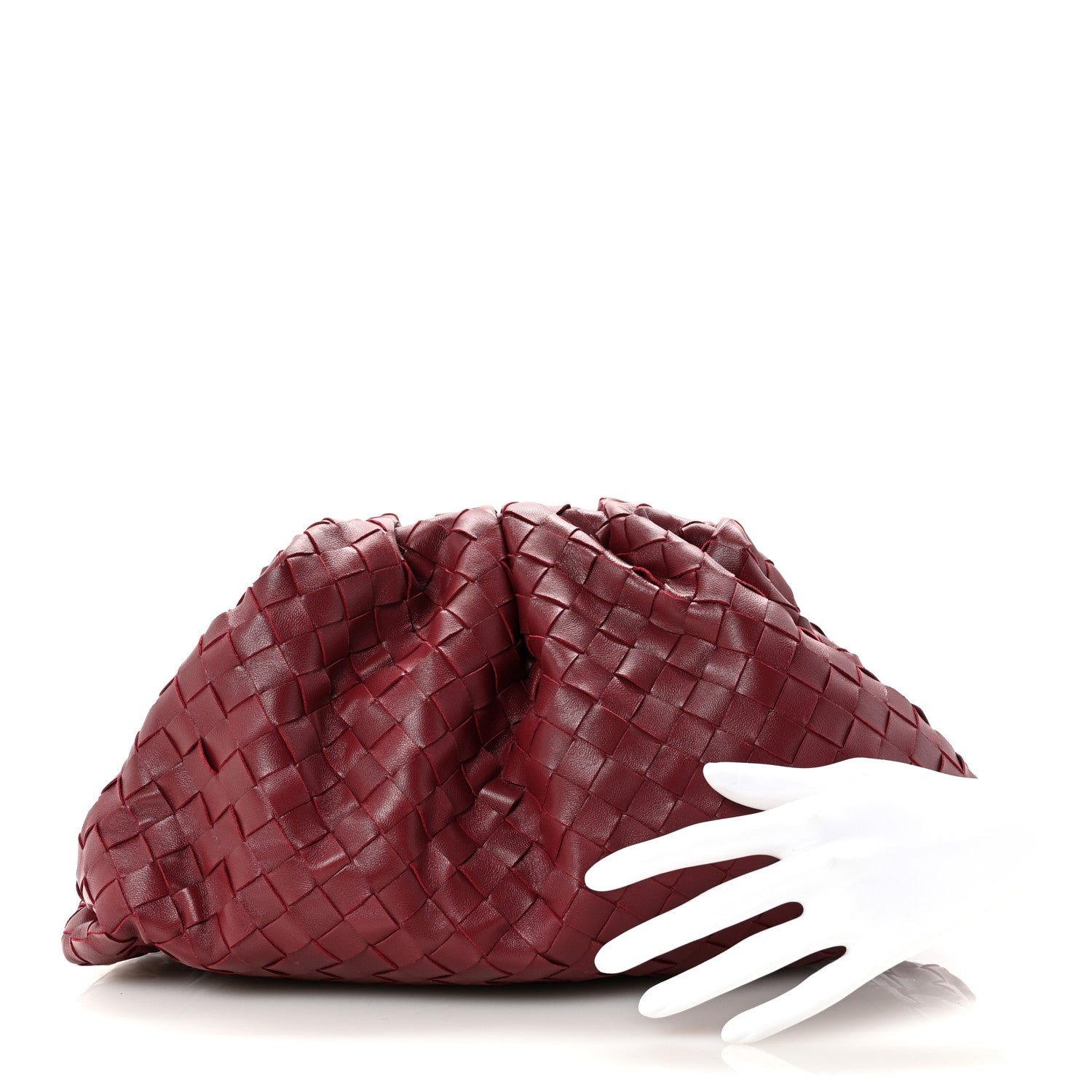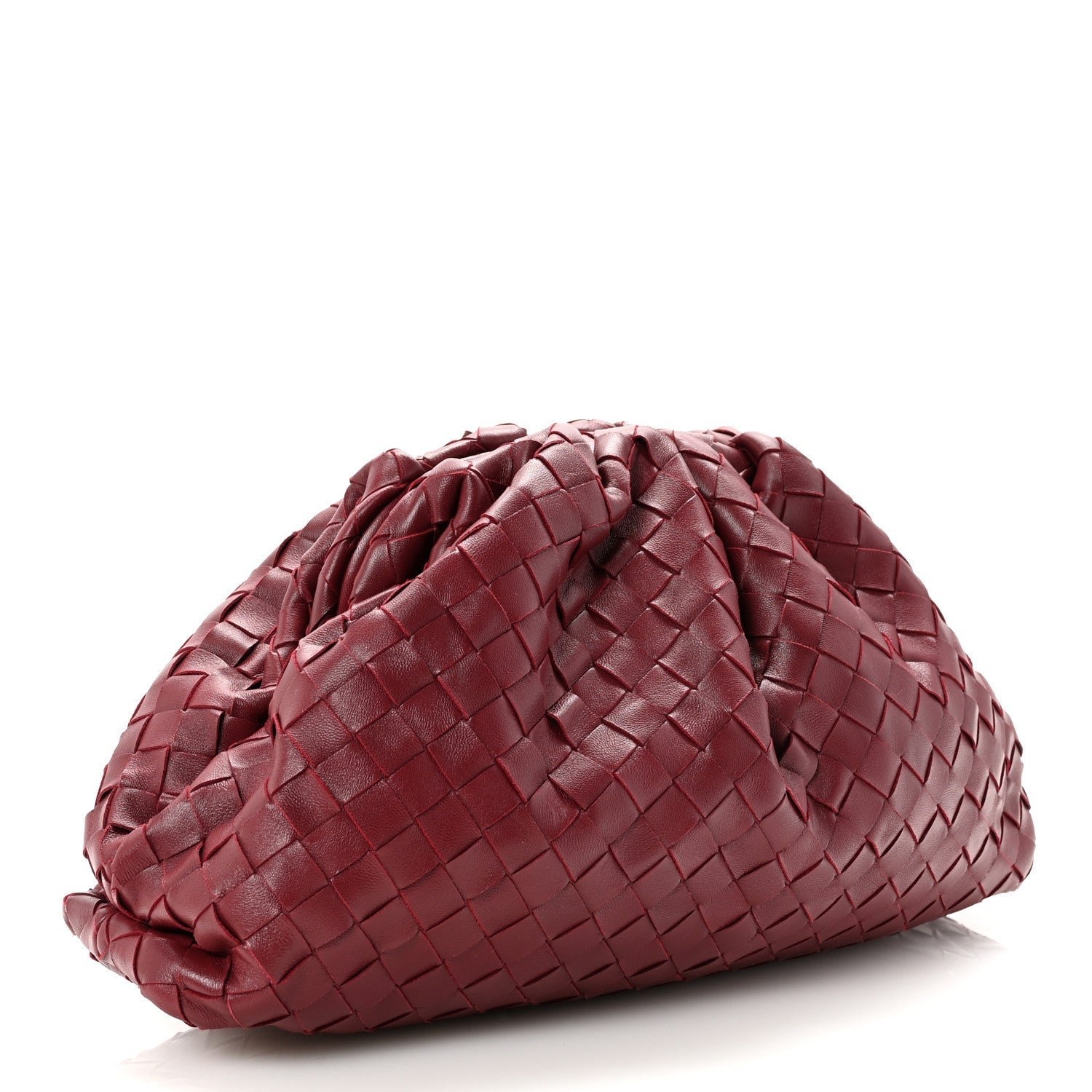 The Bottega Veneta Nappa Maxi Intrecciato The Pouch Oversized Clutch in Bordeaux is a statement piece that reinterprets the house’s iconic “cloud” silhouette through the lens of bold, oversized weaving. This “Maxi” version provides a modern, graphic texture to the voluminous shape that first debuted under Daniel Lee.