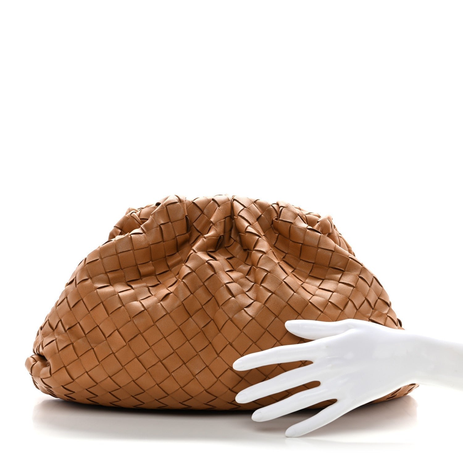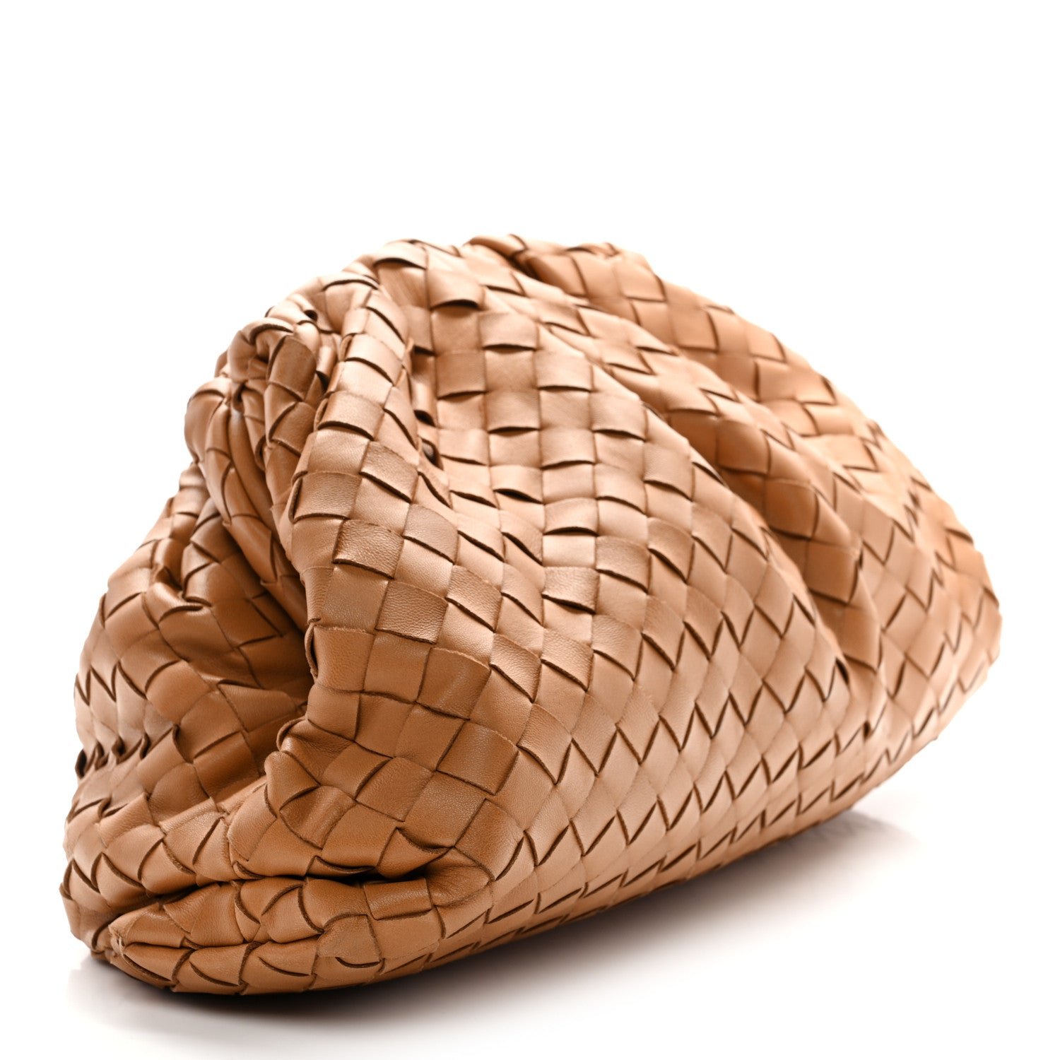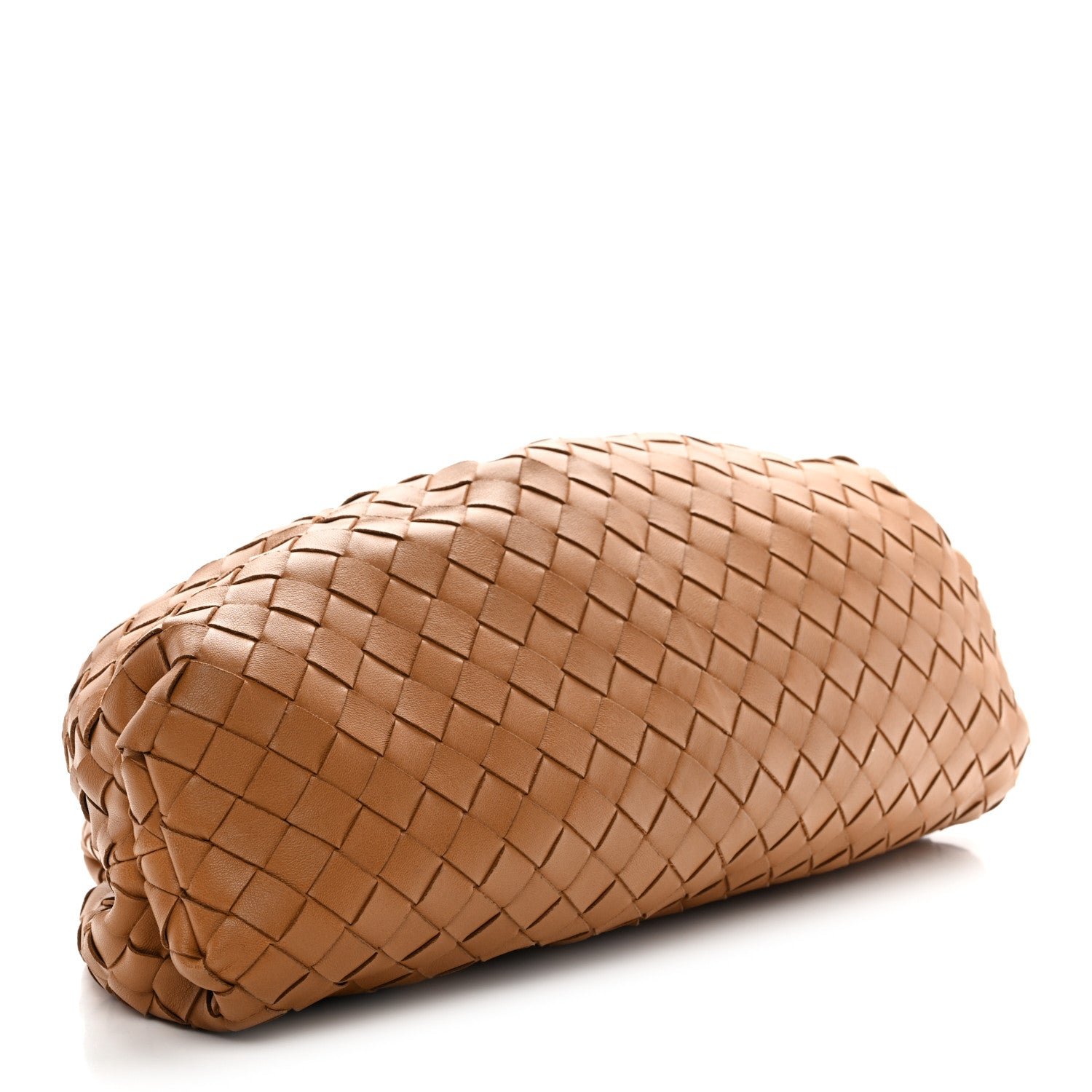 The Bottega Veneta Nappa Maxi Intrecciato The Pouch Oversized Clutch in Caramel is a contemporary house icon that fuses the brand’s traditional craftsmanship with a bold, oversized weave and a voluminous “cloud” silhouette.