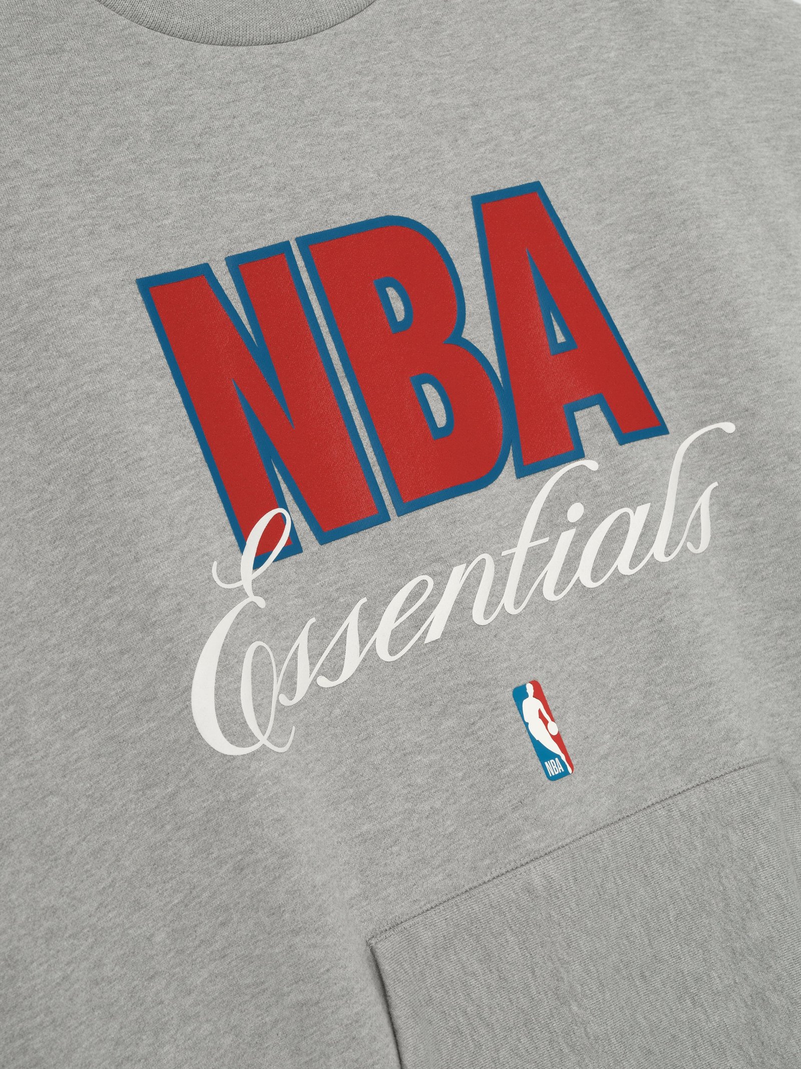 The NBA 90s Crewneck Sweatshirt is crafted from a heavy 480GSM fleece and designed in a relaxed, 90s-inspired fit. The front showcases a bold puff-print “NBA ESSENTIALS” graphic, complemented by an official NBA logo detail. Additional features include a kangaroo pocket, rib-knit collar, cuffs and hem, and a signature rubberized Fear of God Essentials label accenting the back collar.