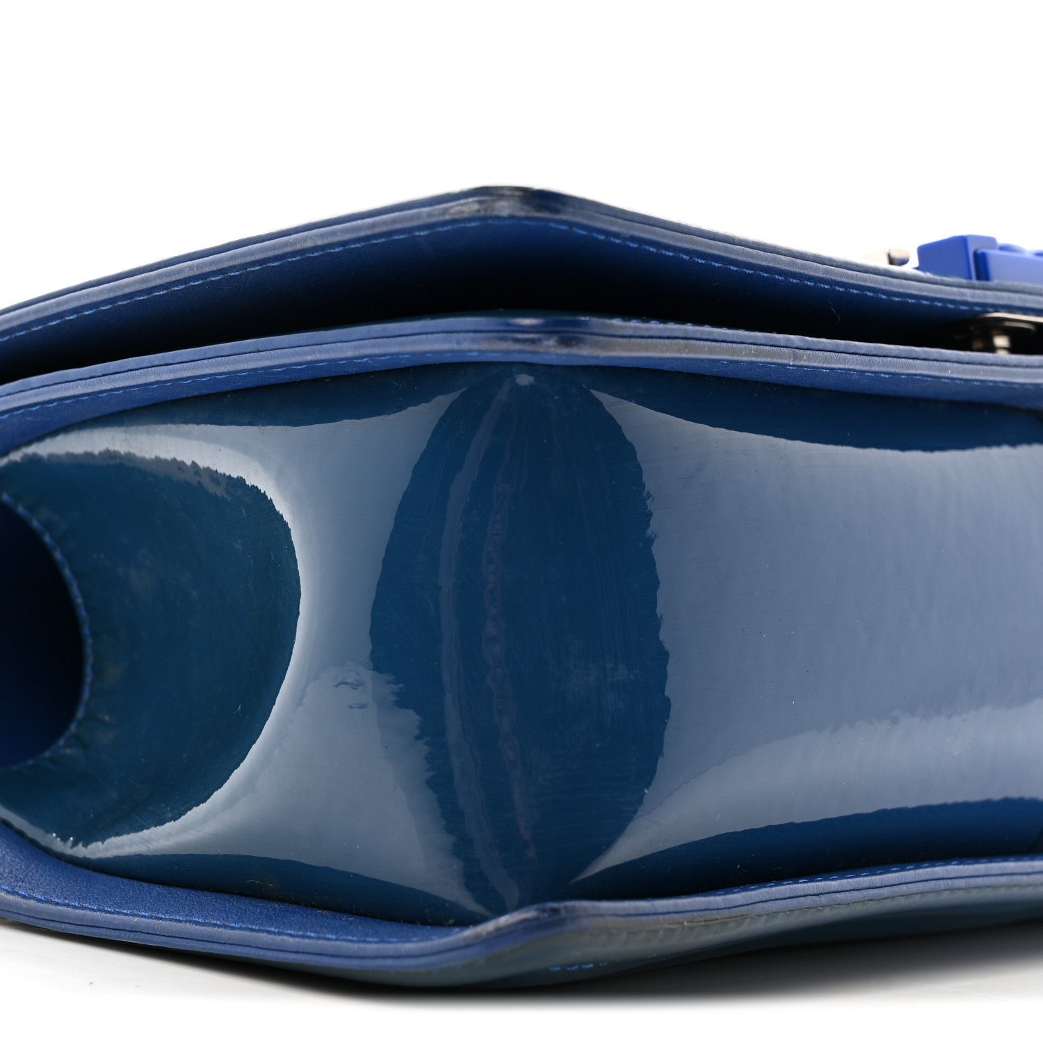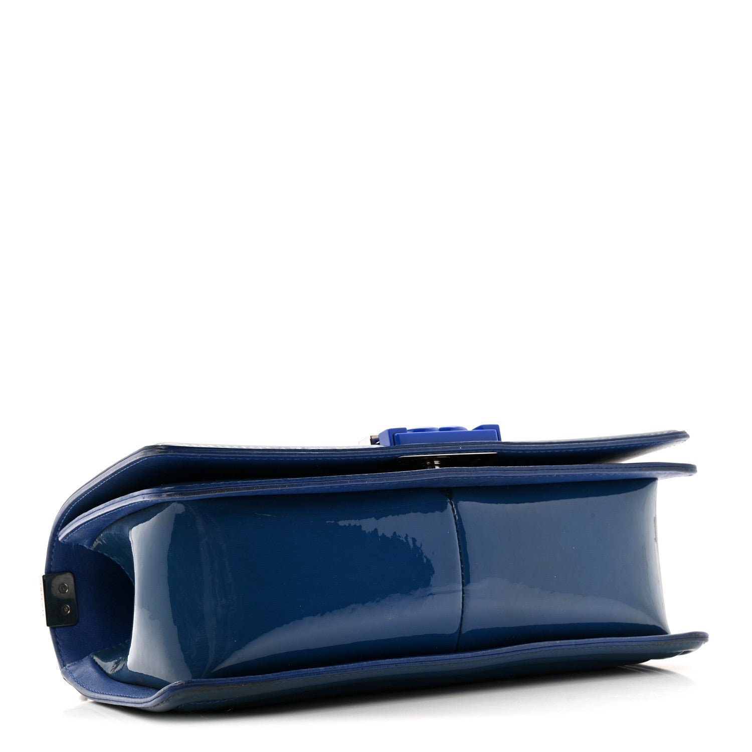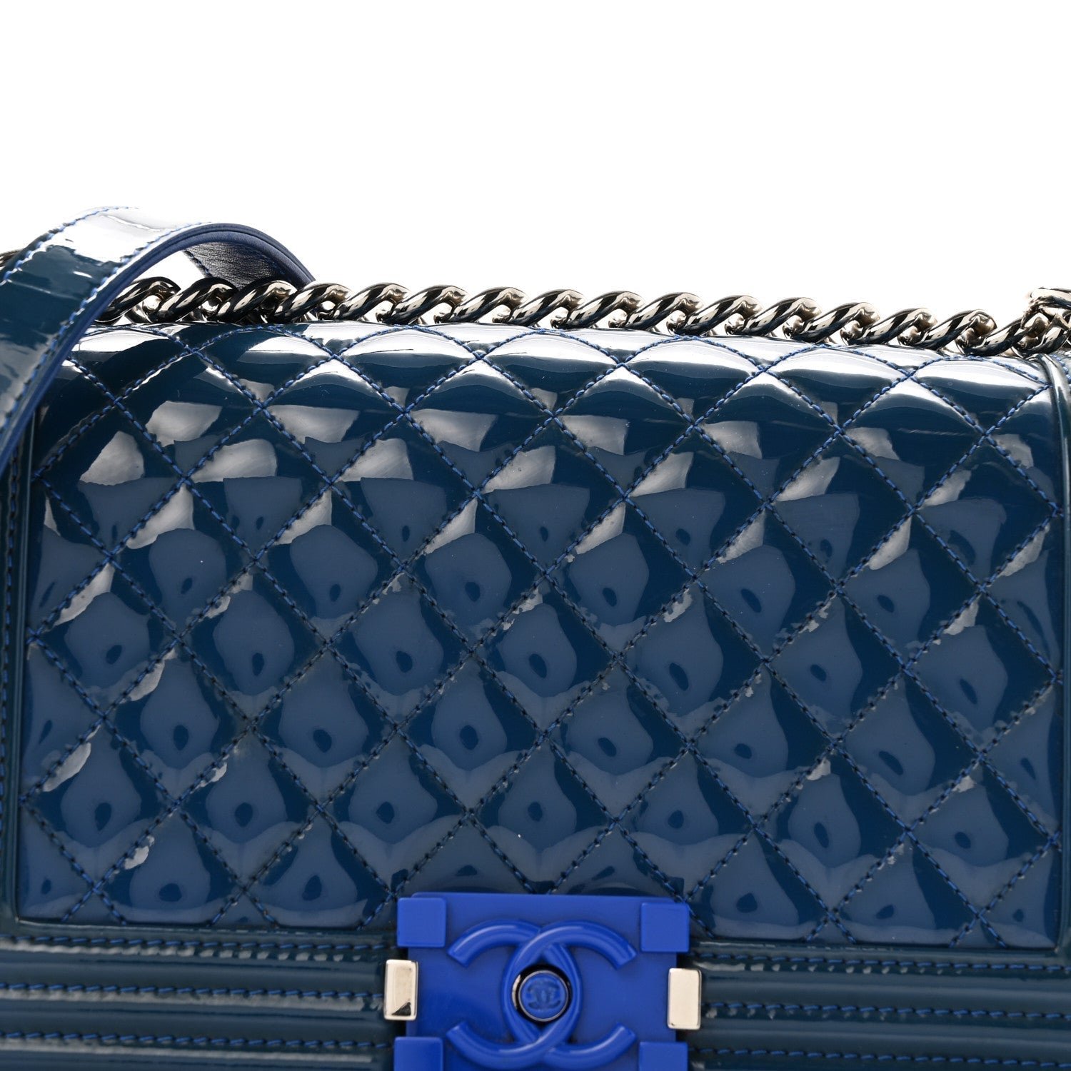 The Chanel Patent Calfskin Quilted Medium Boy Flap in blue with the Plexiglass CC lock is a high-gloss, limited-edition release, originally part of collections circa 2014–2015. This model is particularly noted for its “Plexiglass” or “Lego-style” clasp, a unique decorative variation of the standard Boy push-lock.