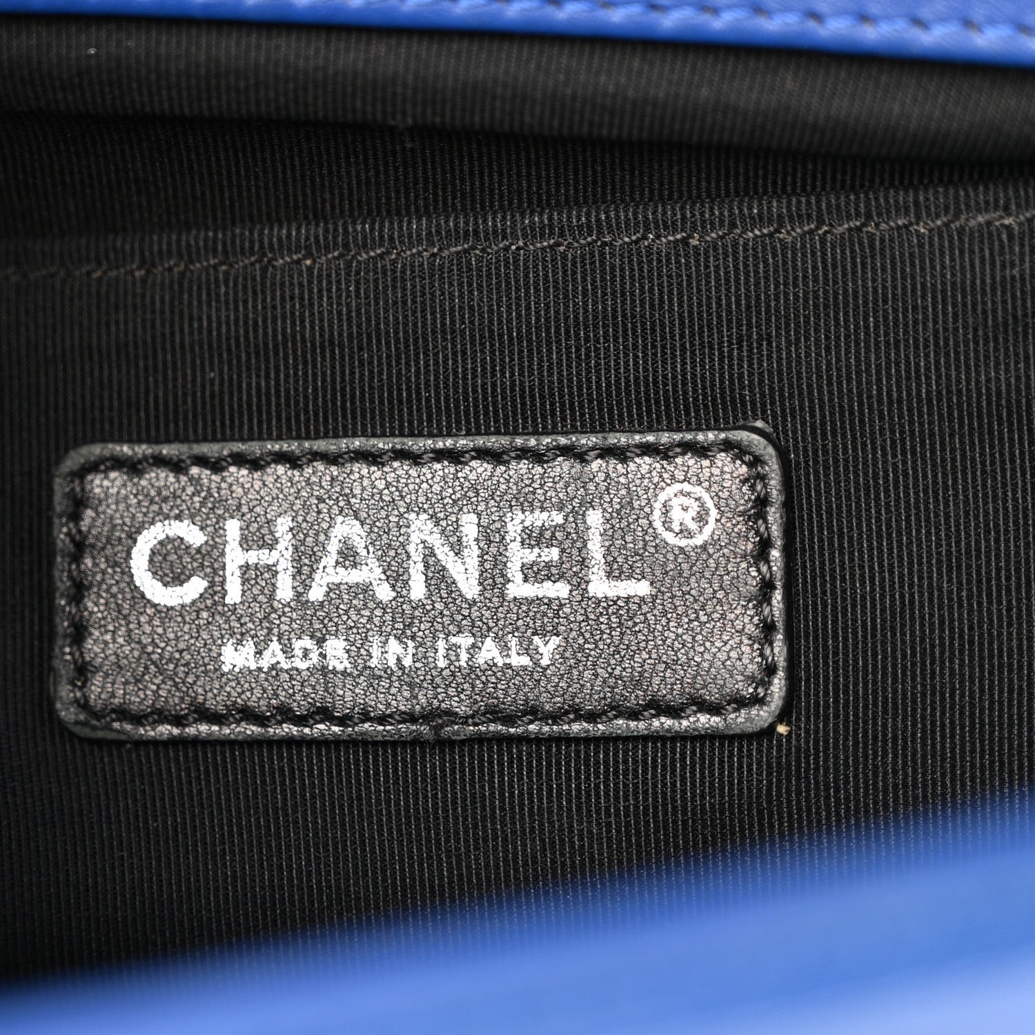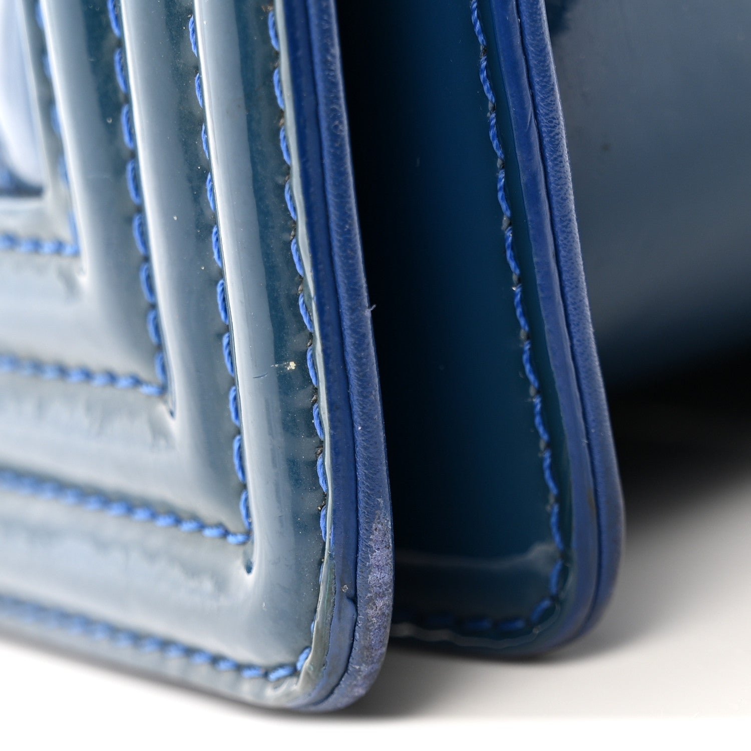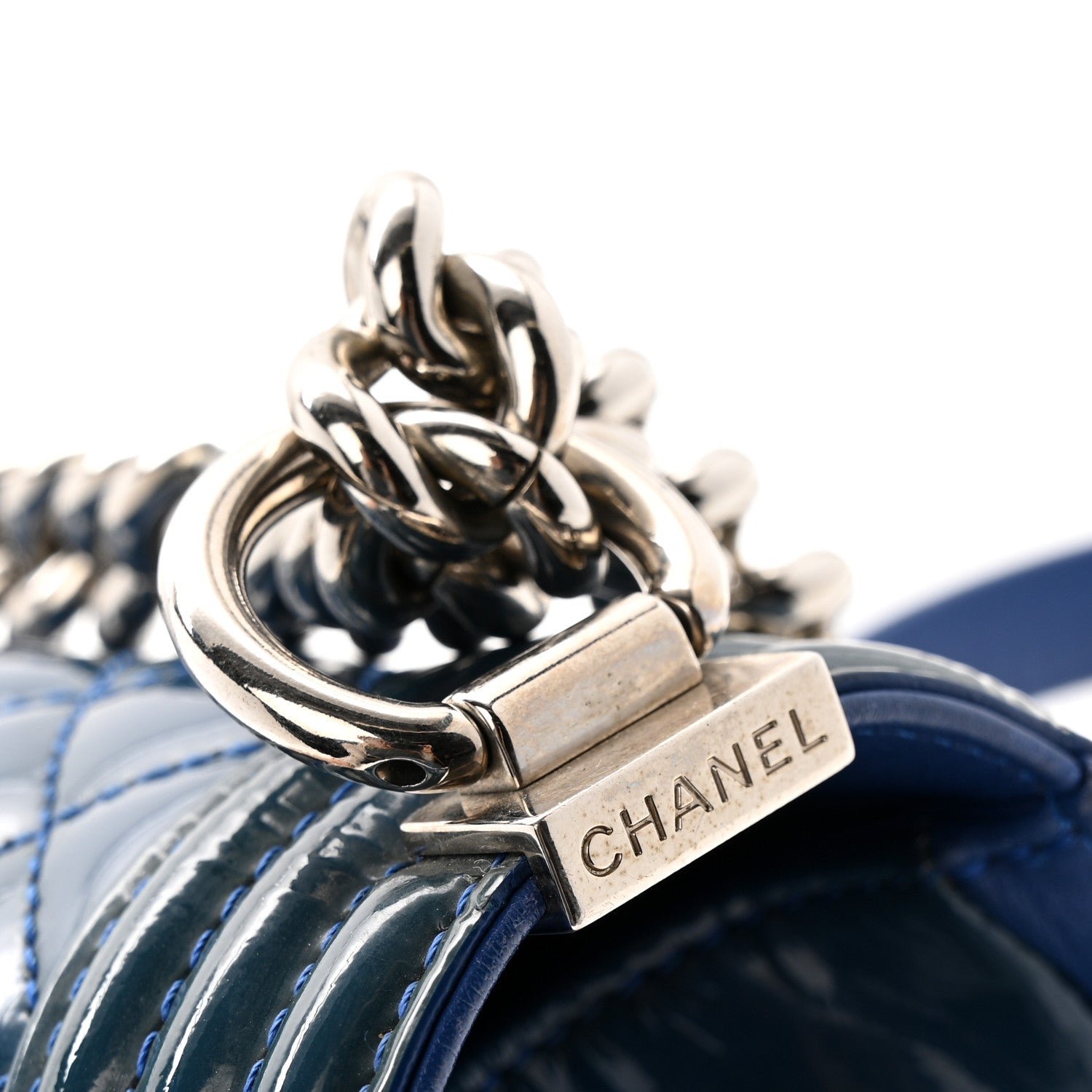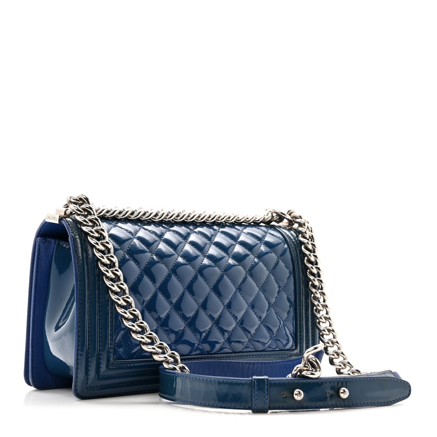 The Chanel Patent Calfskin Quilted Medium Boy Flap in blue with the Plexiglass CC lock is a high-gloss, limited-edition release, originally part of collections circa 2014–2015. This model is particularly noted for its “Plexiglass” or “Lego-style” clasp, a unique decorative variation of the standard Boy push-lock.