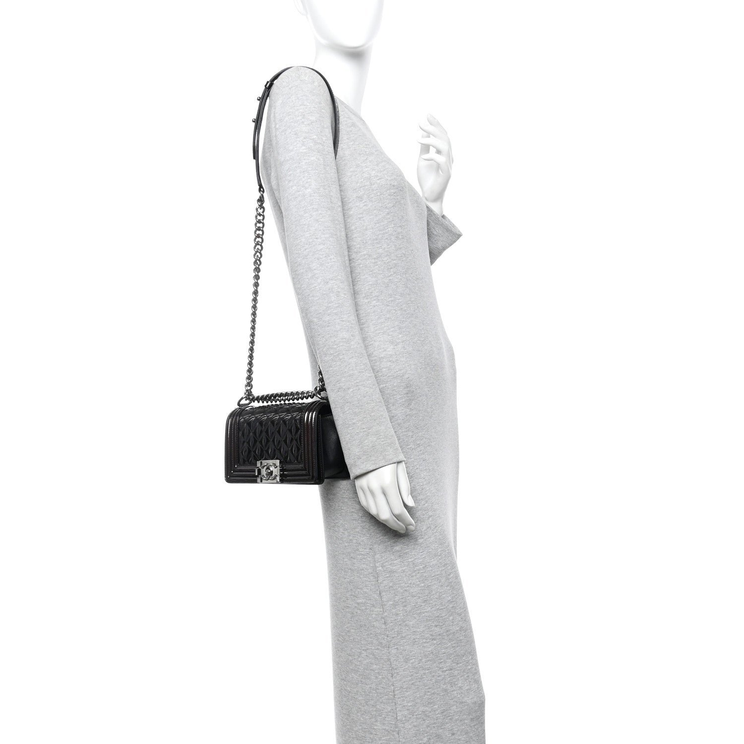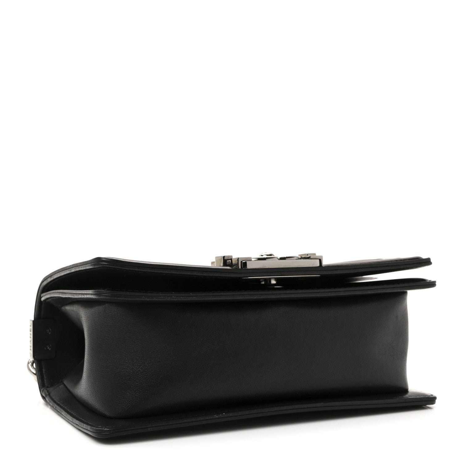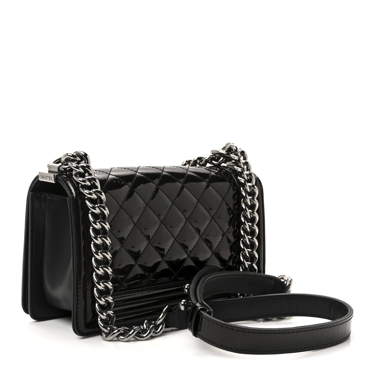 The Chanel Patent Calfskin Quilted Small Boy Flap in black with silver-tone metal is a high-gloss, edgy variation of the classic Boy silhouette. Introduced as a “mainstay” of the house, this model is defined by its boxy shape and architectural hardware, reflecting a more masculine aesthetic than traditional flap bags.