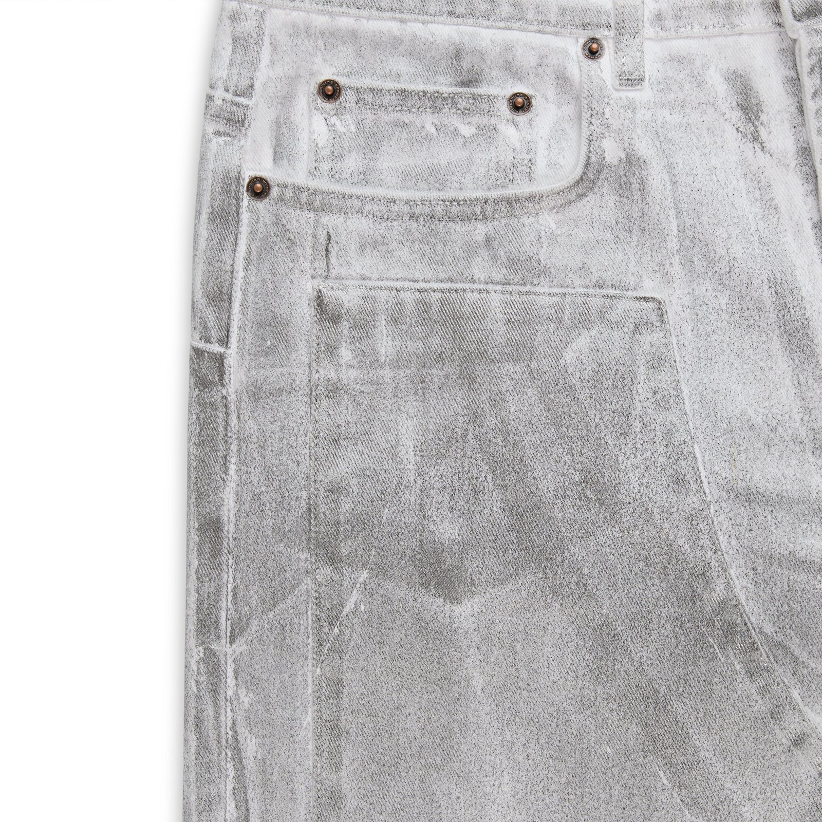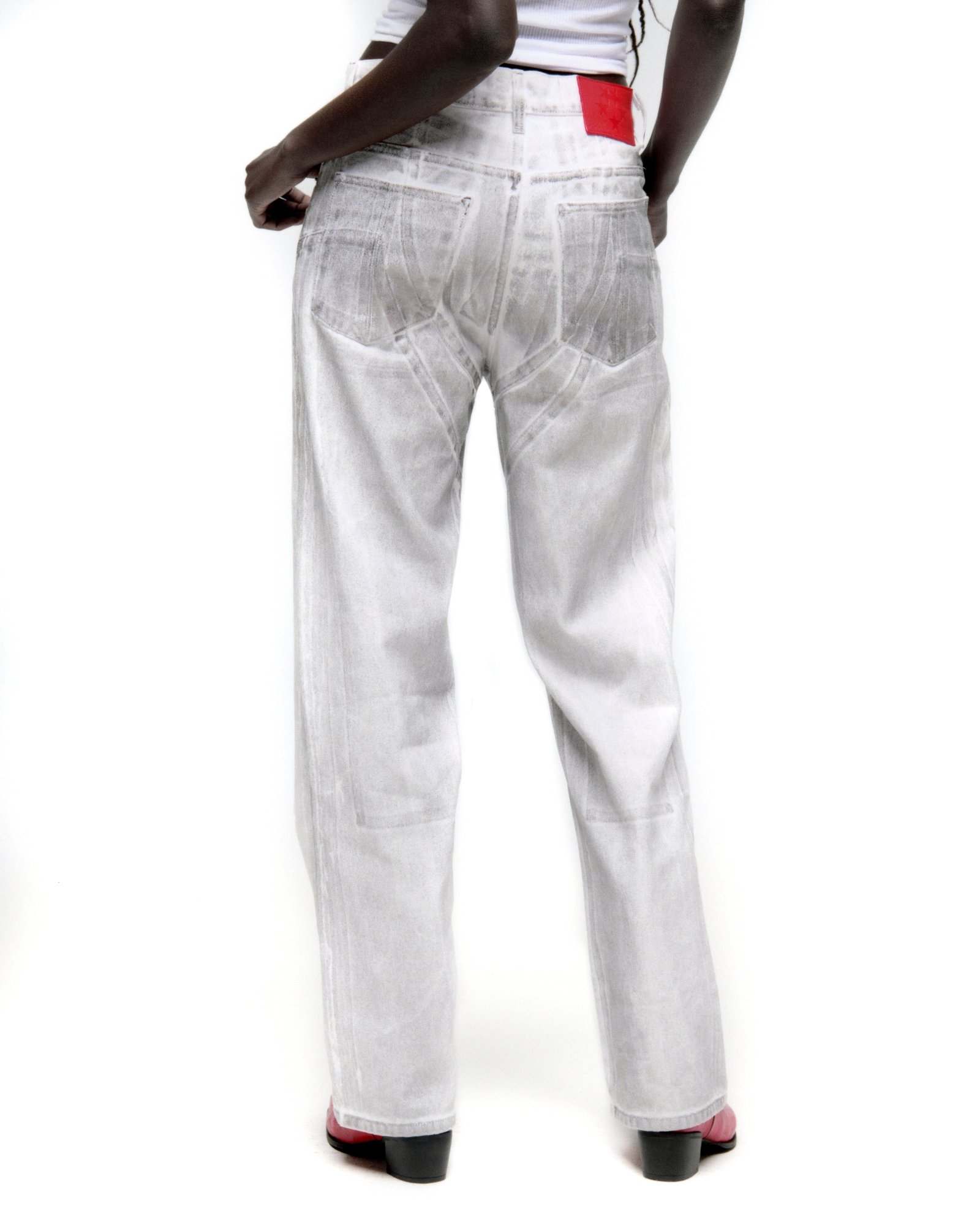 Spray-effect denim pant. Panels on front. Custom branded hardware. Belt loops. Five-pocket styling. Branded leather back patch. Wide leg fit.