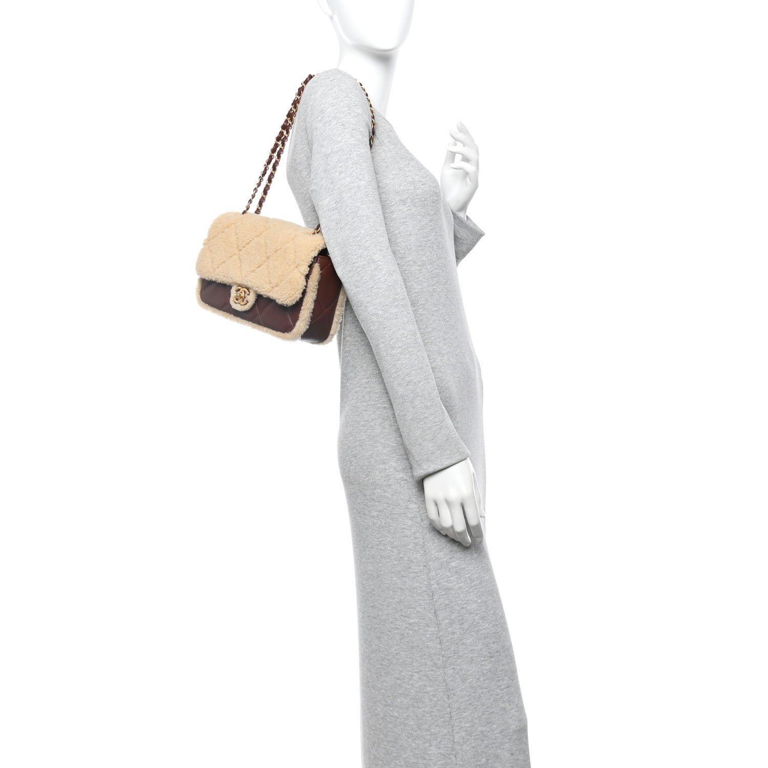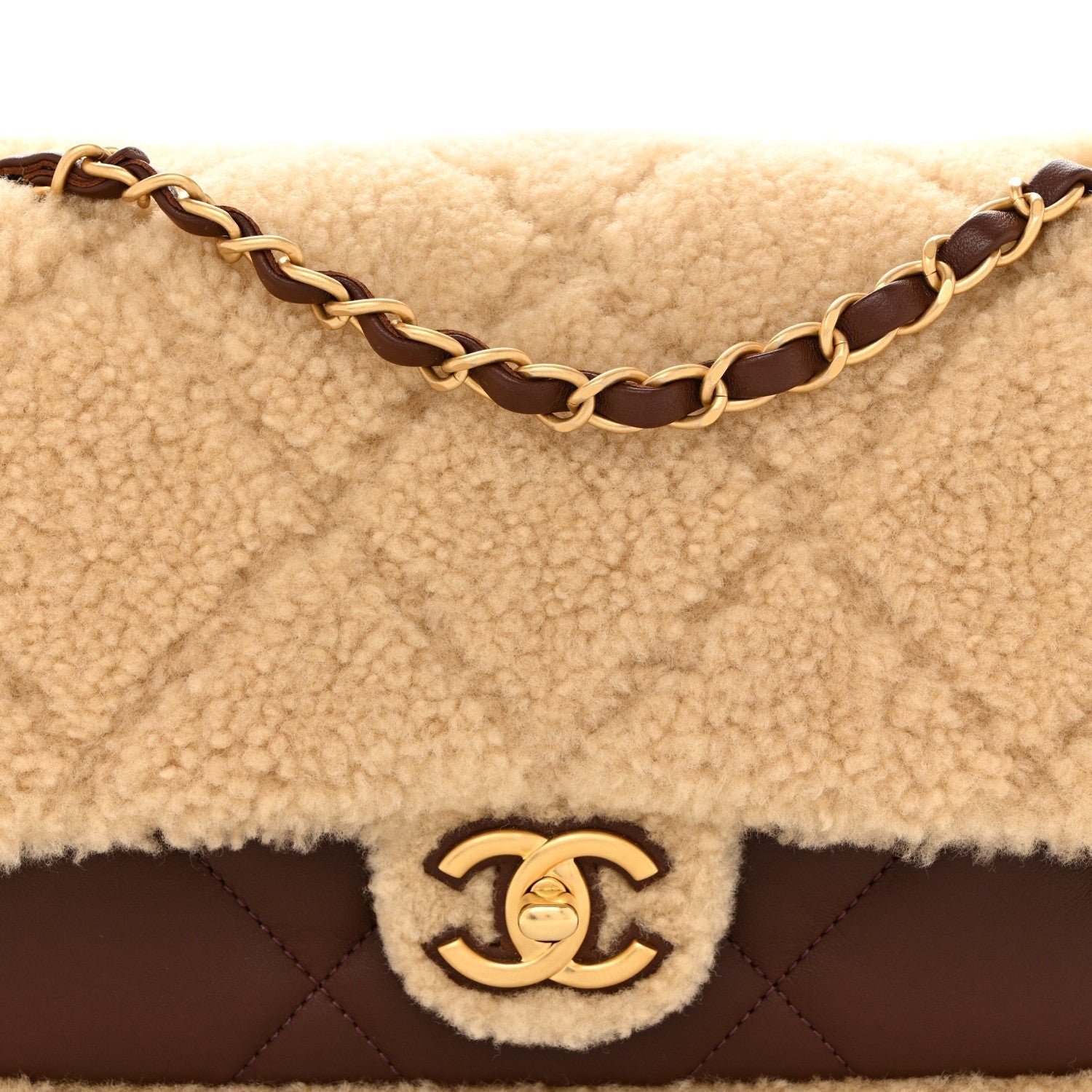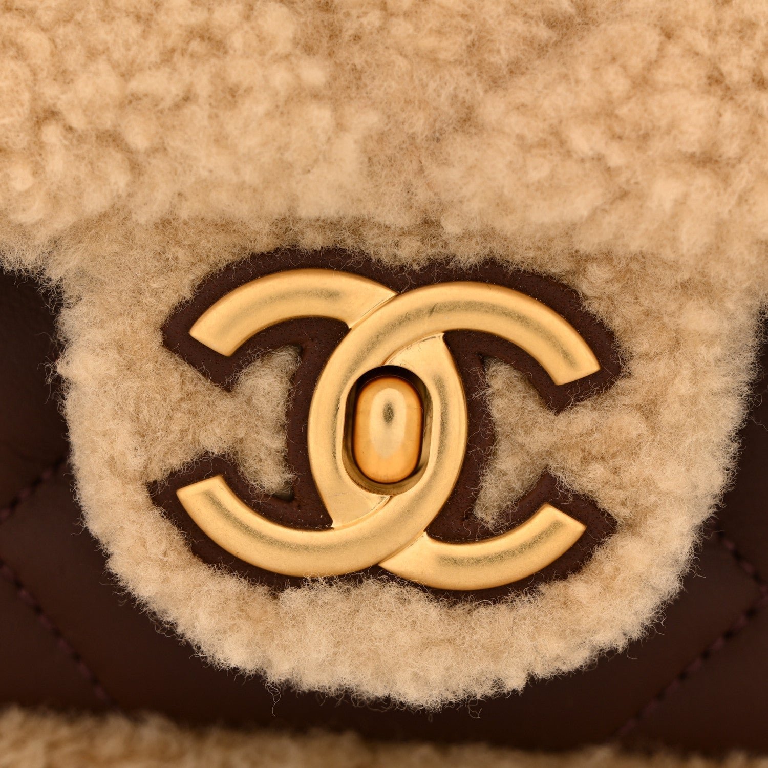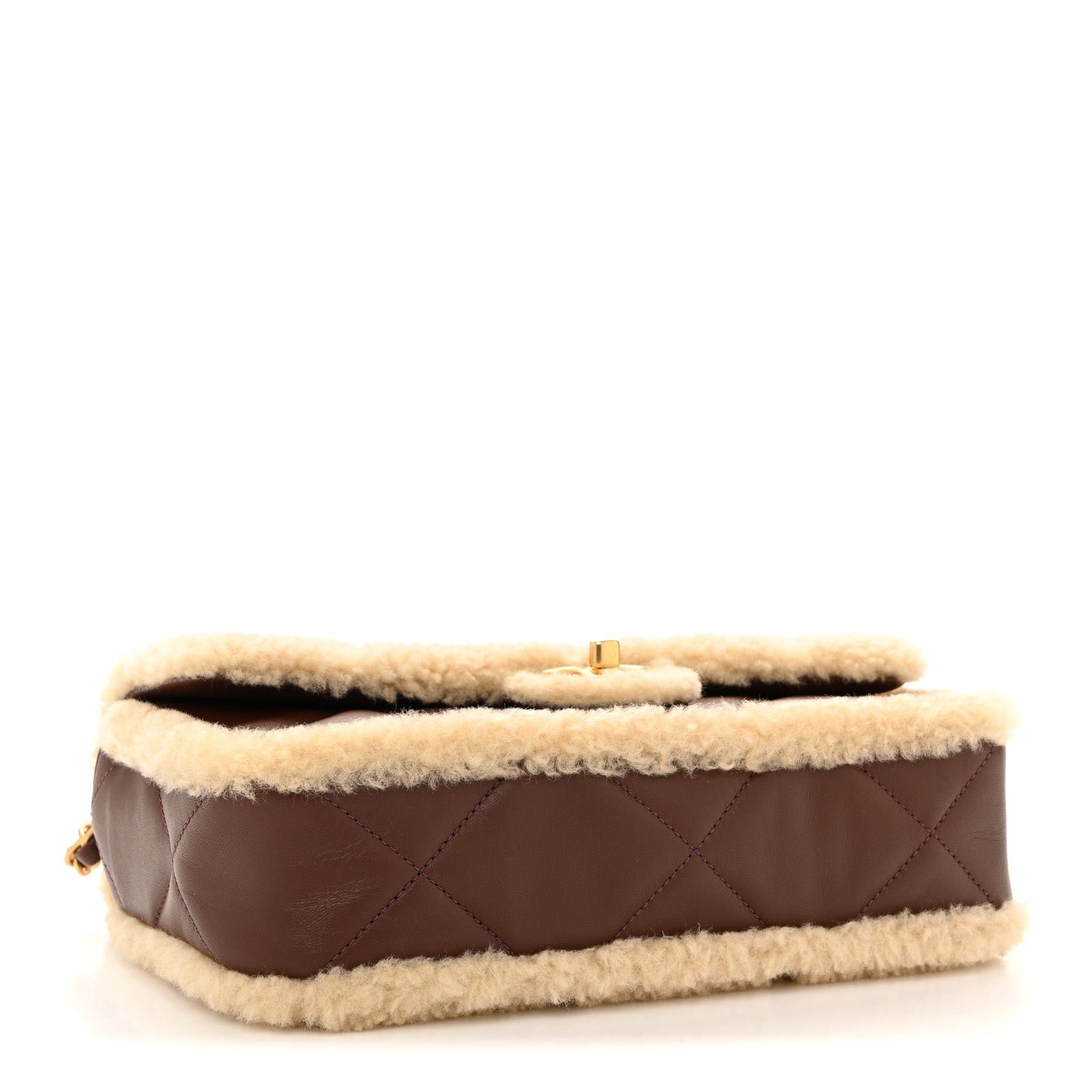 Material: Constructed from ultra-soft beige shearling fur across the main body and flap, with dark brown diamond-quilted lambskin leather finishing the base and interior trim.