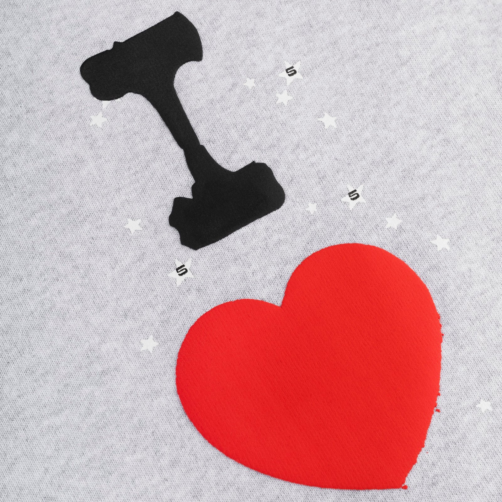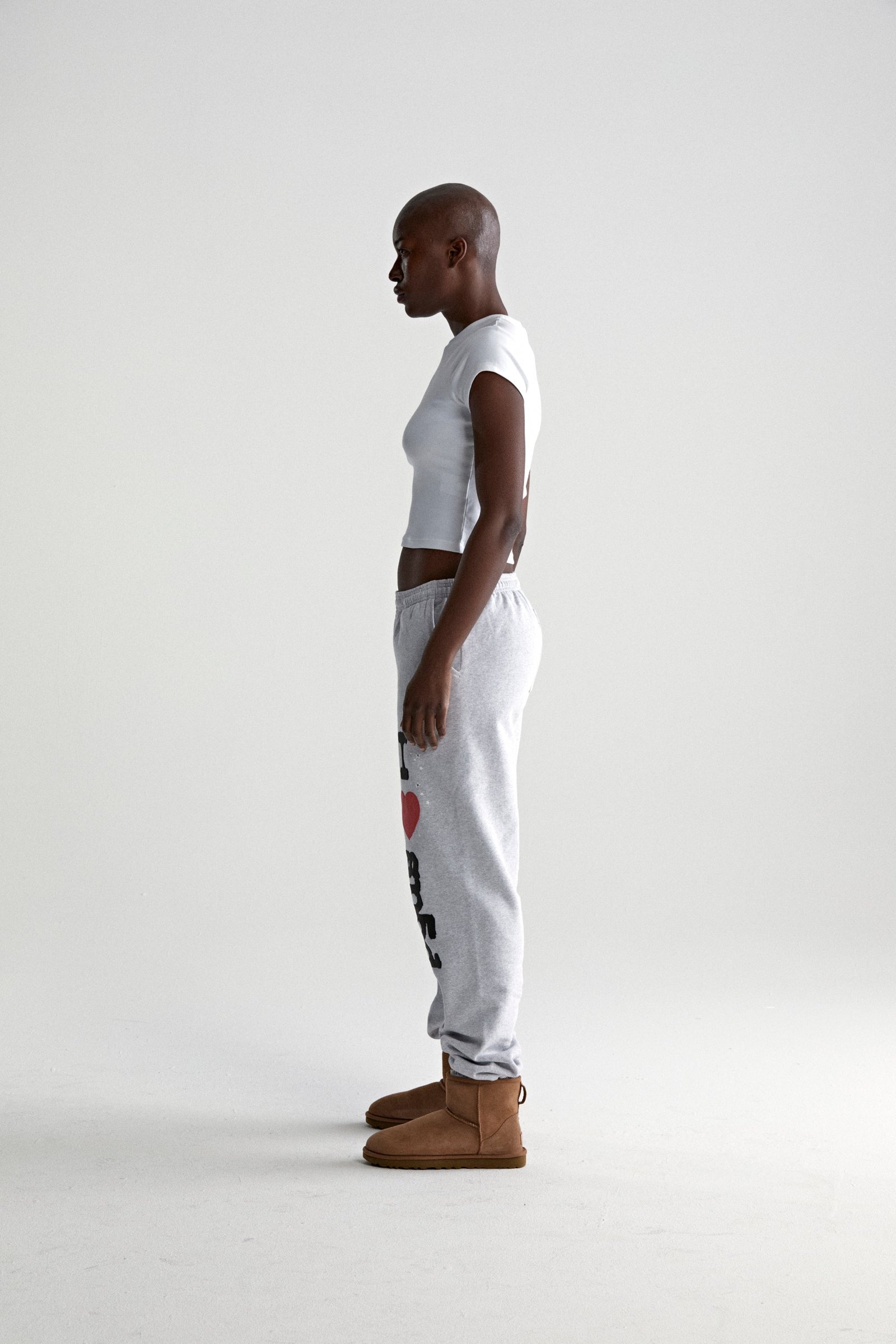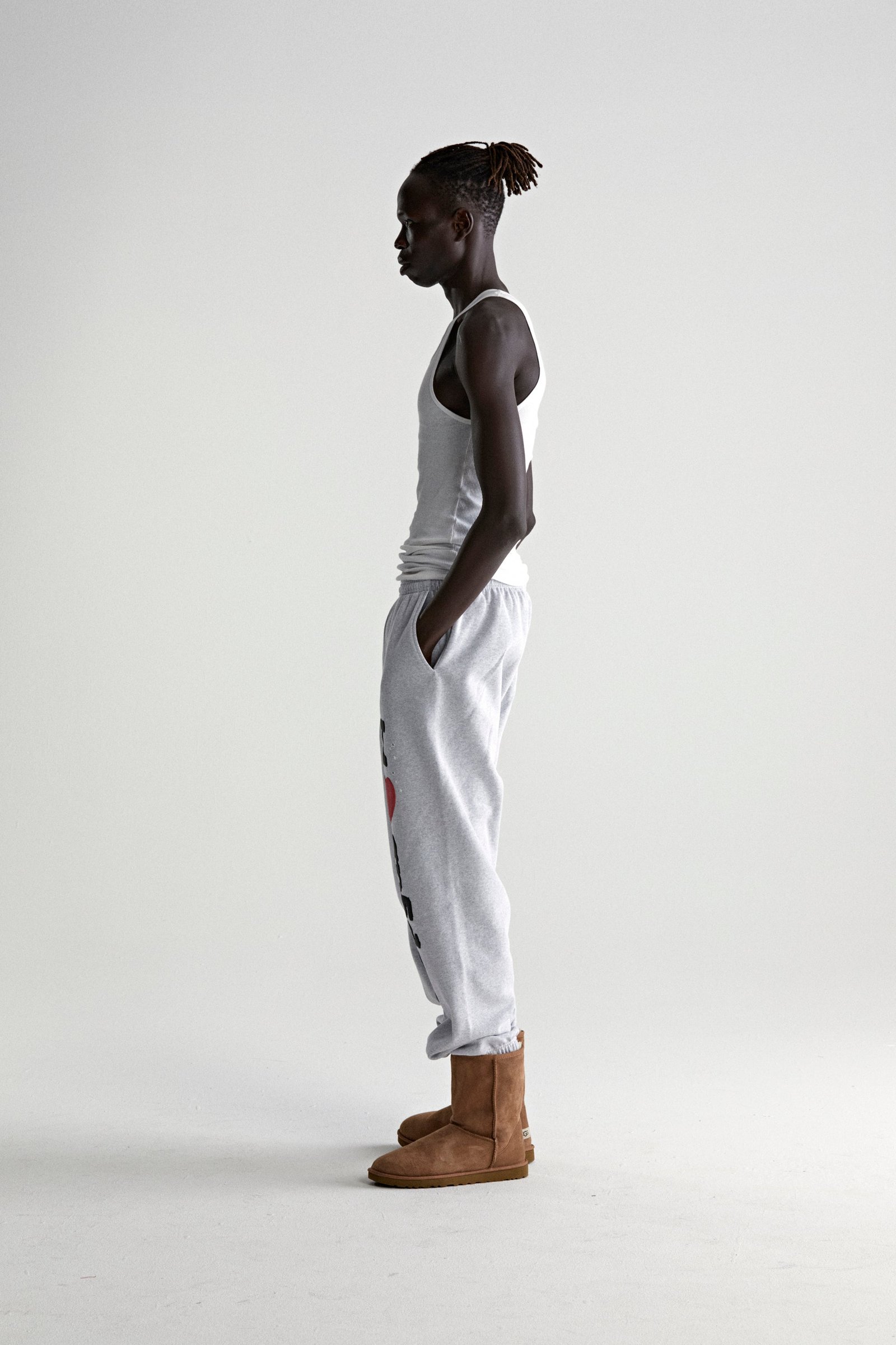 13oz, 100% cotton fleece. Puff print / discharge print combination. Souvenir graphic down leg. Drawstring at elasticized waistband. Three-pocket styling. Elasticized cuffs.