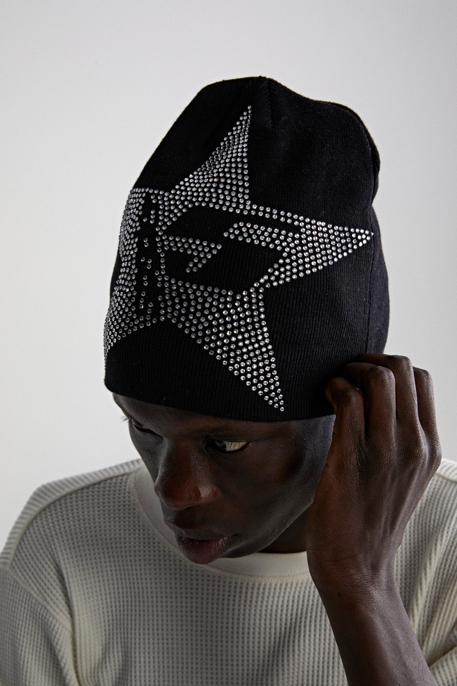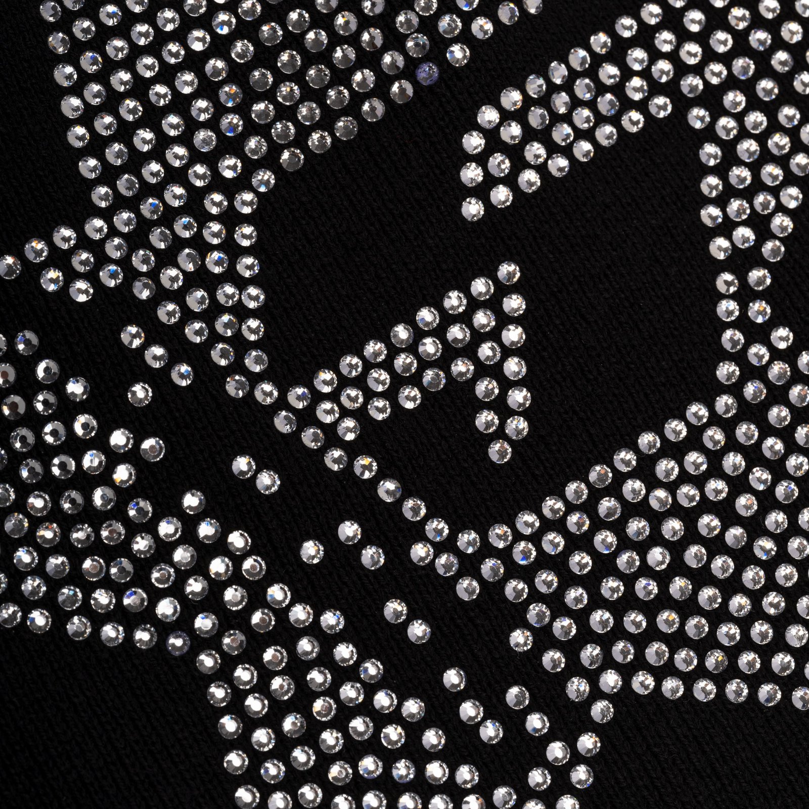100% acrylic. Rhinestone embellished 5 star design. Hand wash in cold water/air dry.