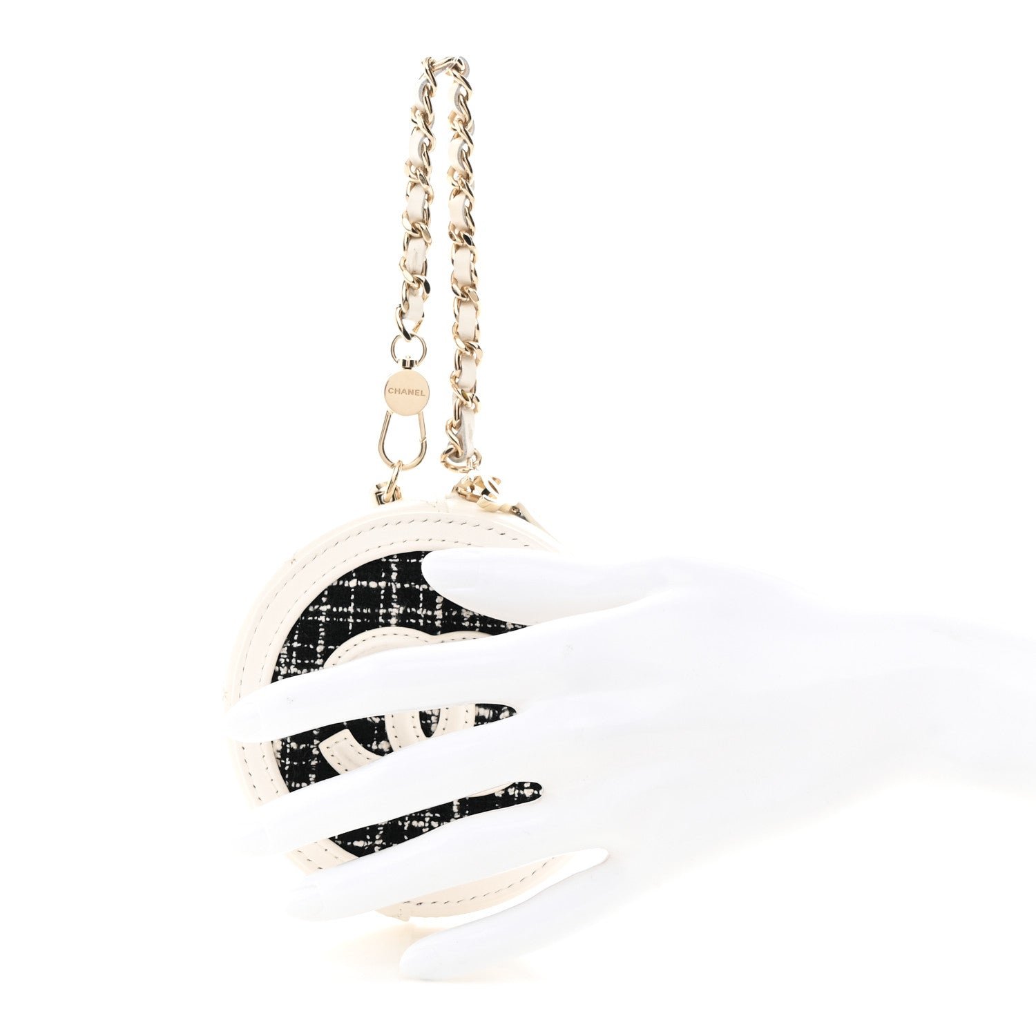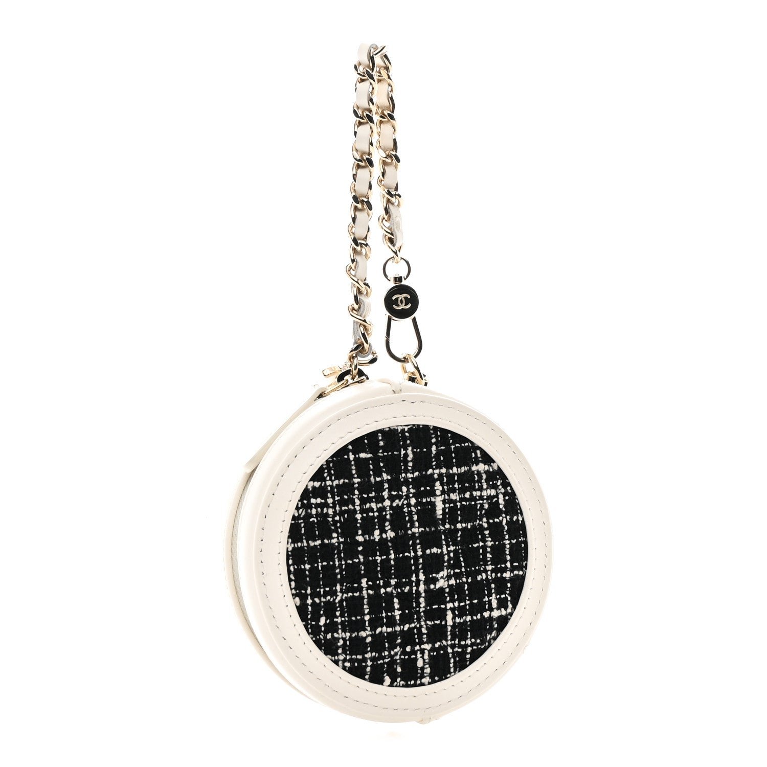 The Chanel Tweed Quilted Round Filigree Pouch with Chain in white and black is a compact, circular accessory that debuted as part of the Spring/Summer 2019 collection by Karl Lagerfeld. This piece is part of the “CC Filigree” line, known for its focus on travel-inspired aesthetics and the prominent interlocking CC logo.