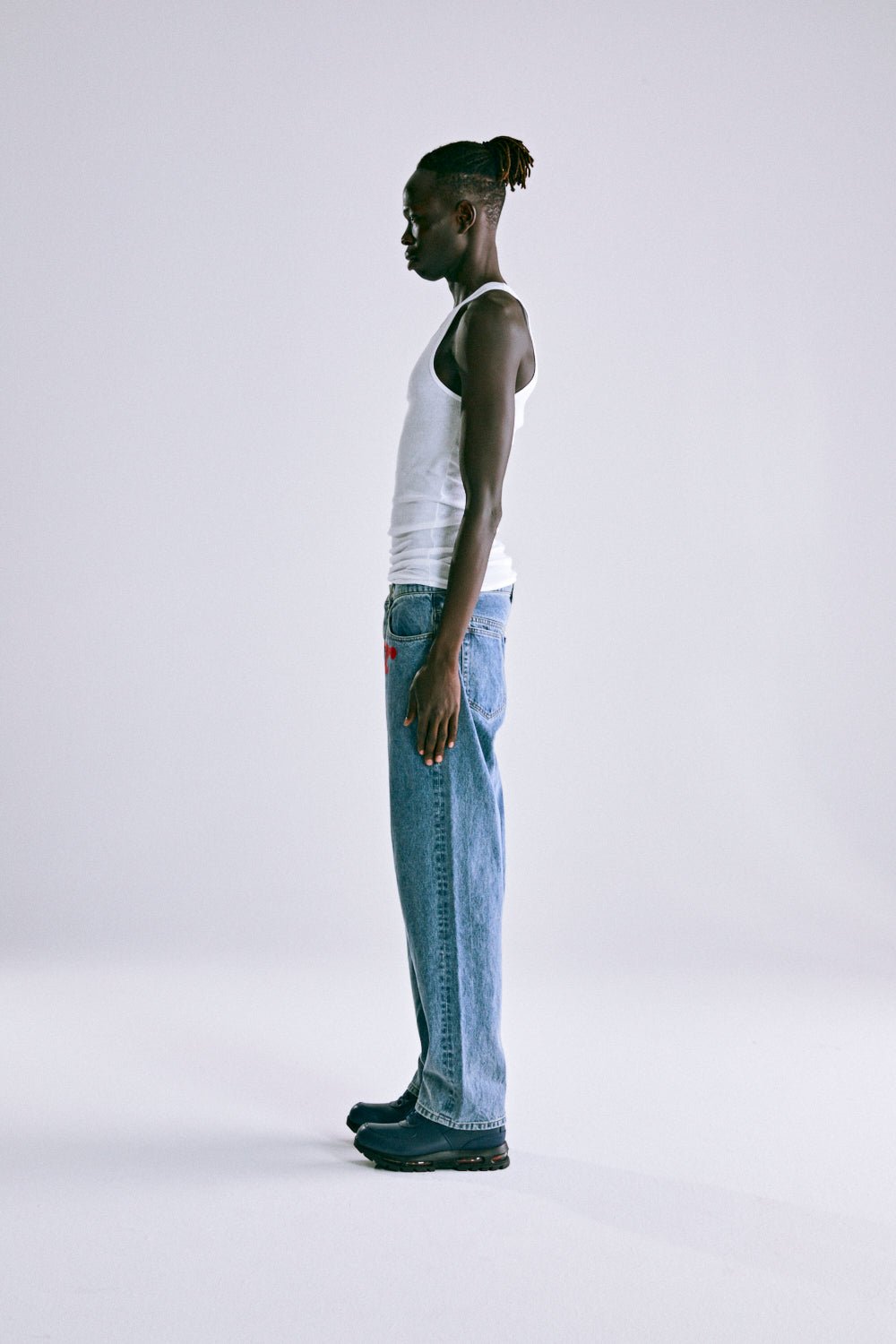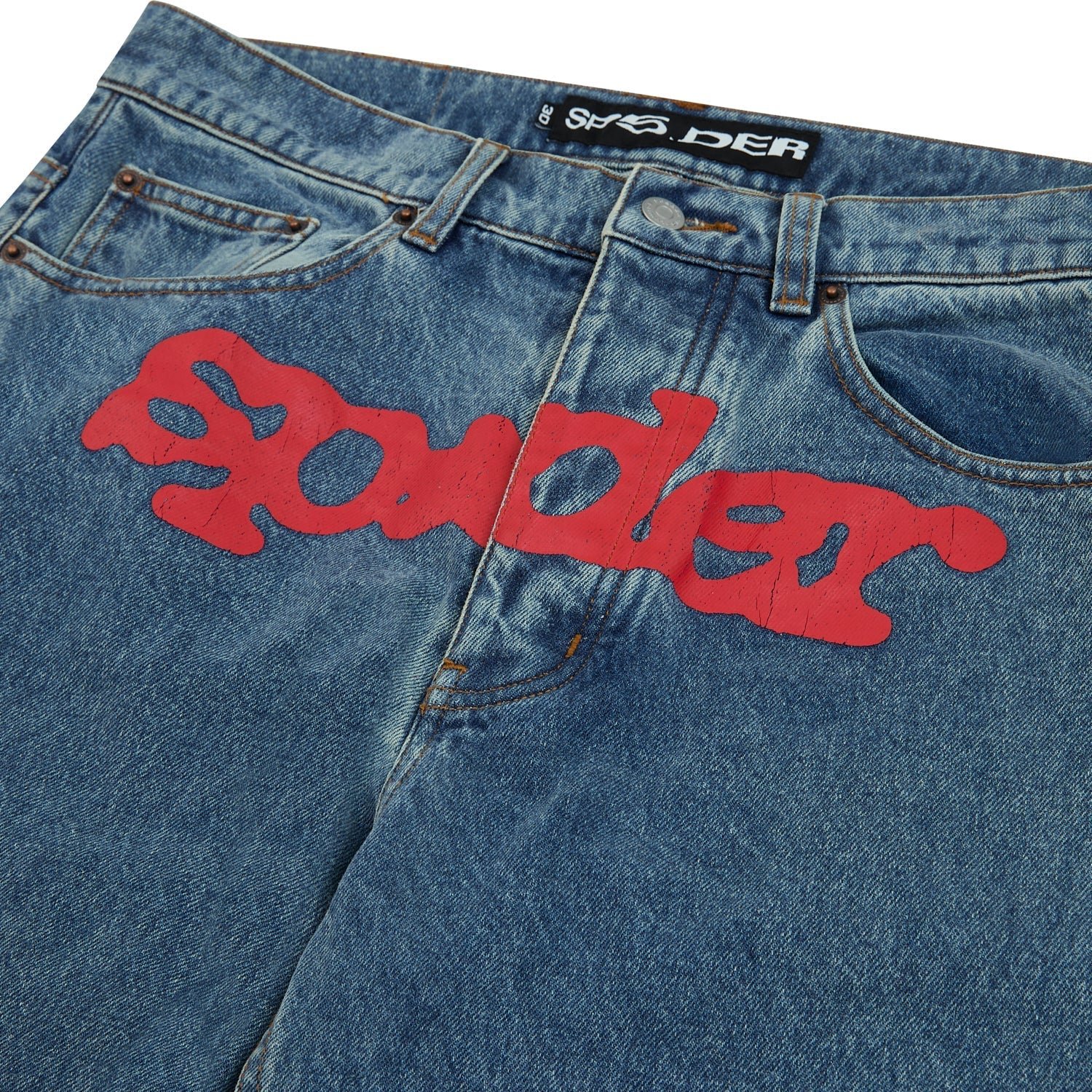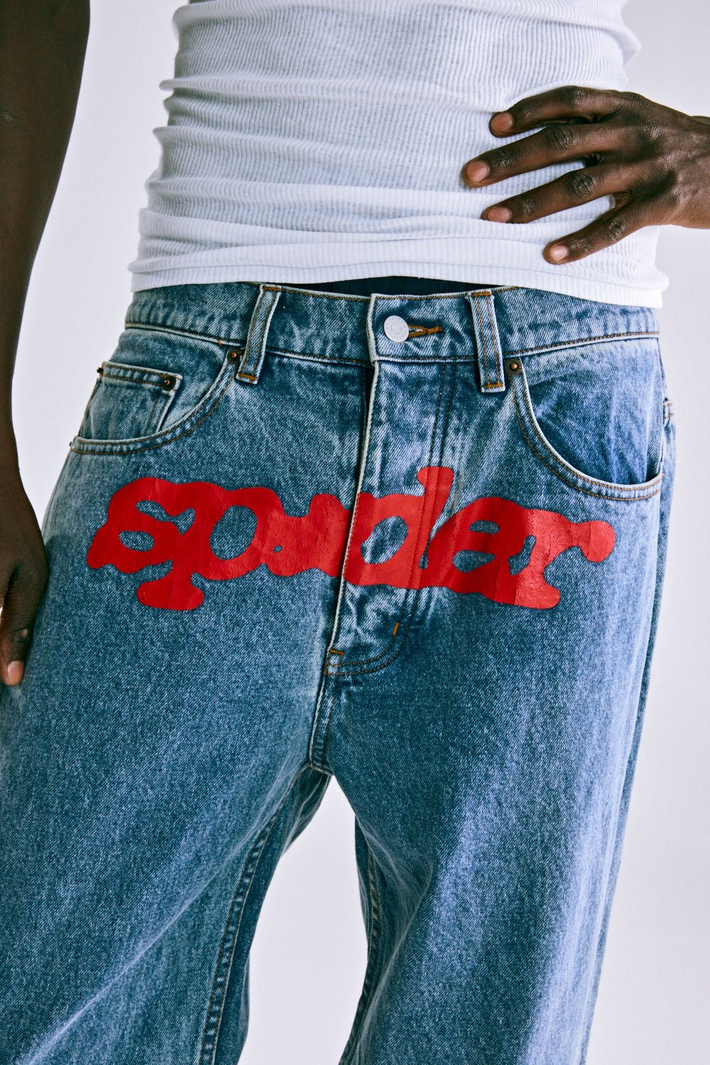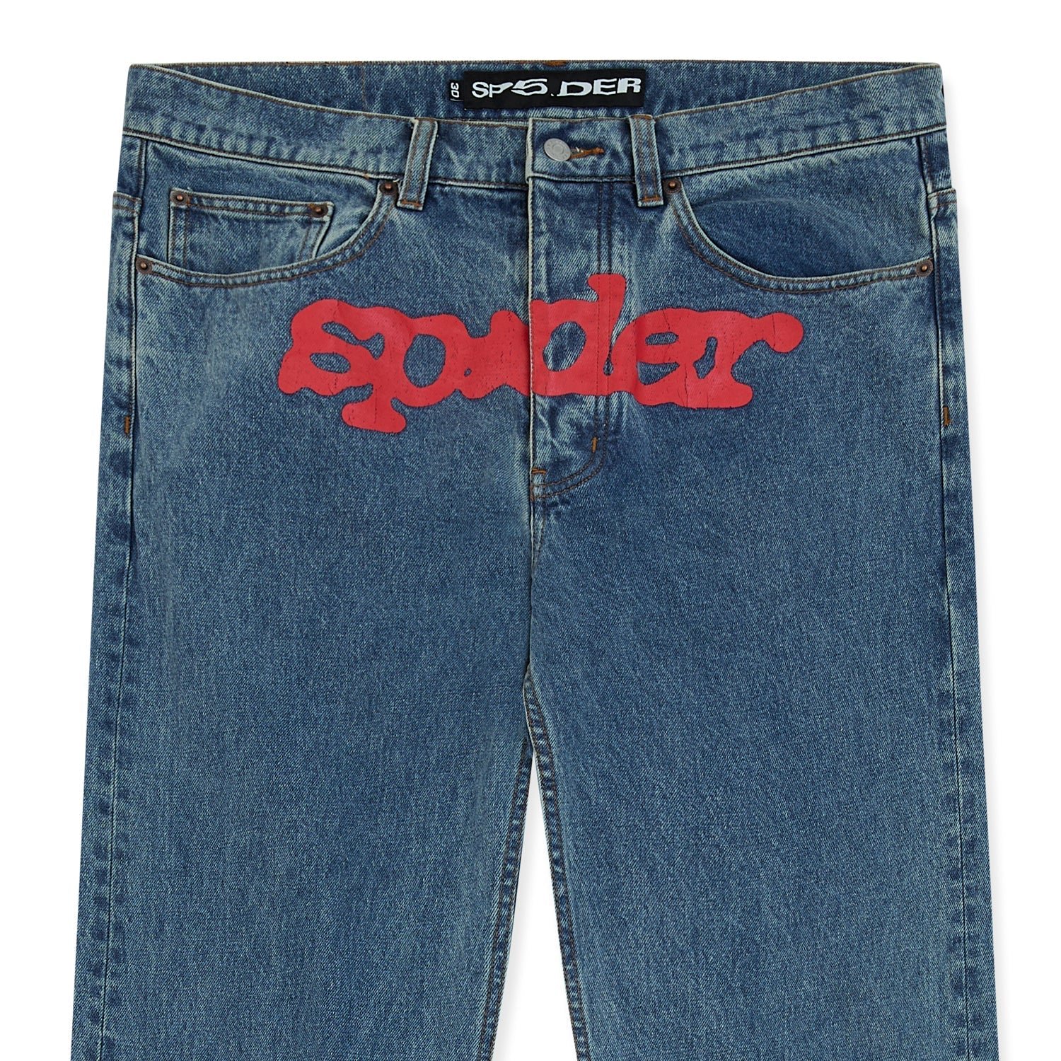 14oz rinse washed denim. Belt loops. Five-pocket styling. Branded shank buttons. Leather branded patch at back waistband. SP5DER printed and distressed on crotch. Straight leg fit.