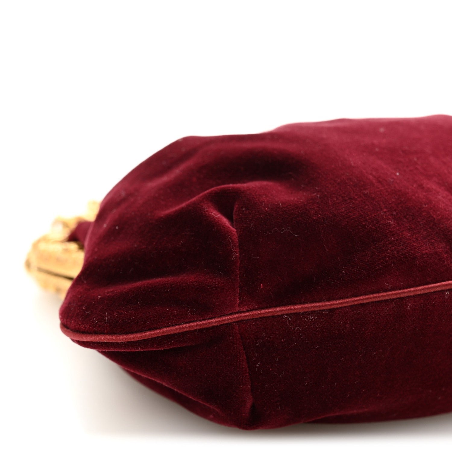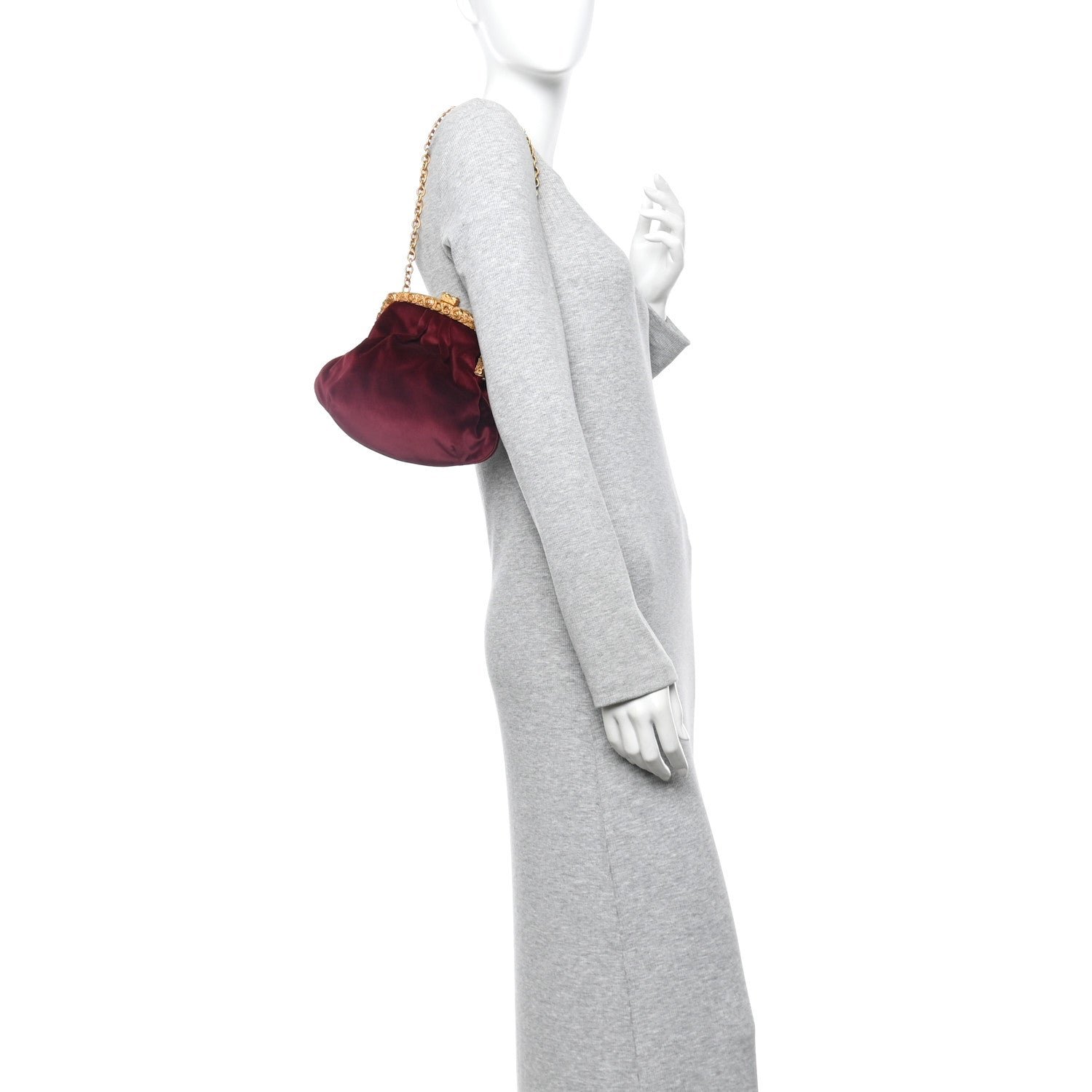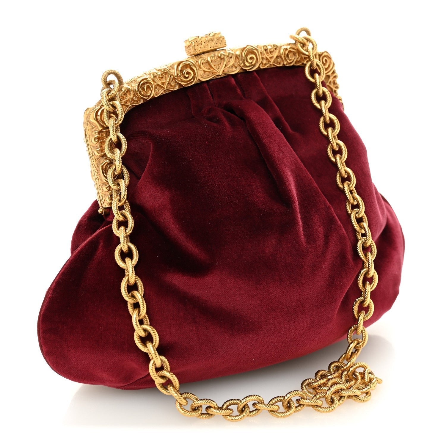 The Dolce & Gabbana Velvet Chain Clutch in Burgundy is an opulent evening accessory that features an ornate, vintage-inspired frame and a lush, tactile finish. This bag is distinguished by its intricate gold-tone metalwork and rich jewel-toned fabric.
