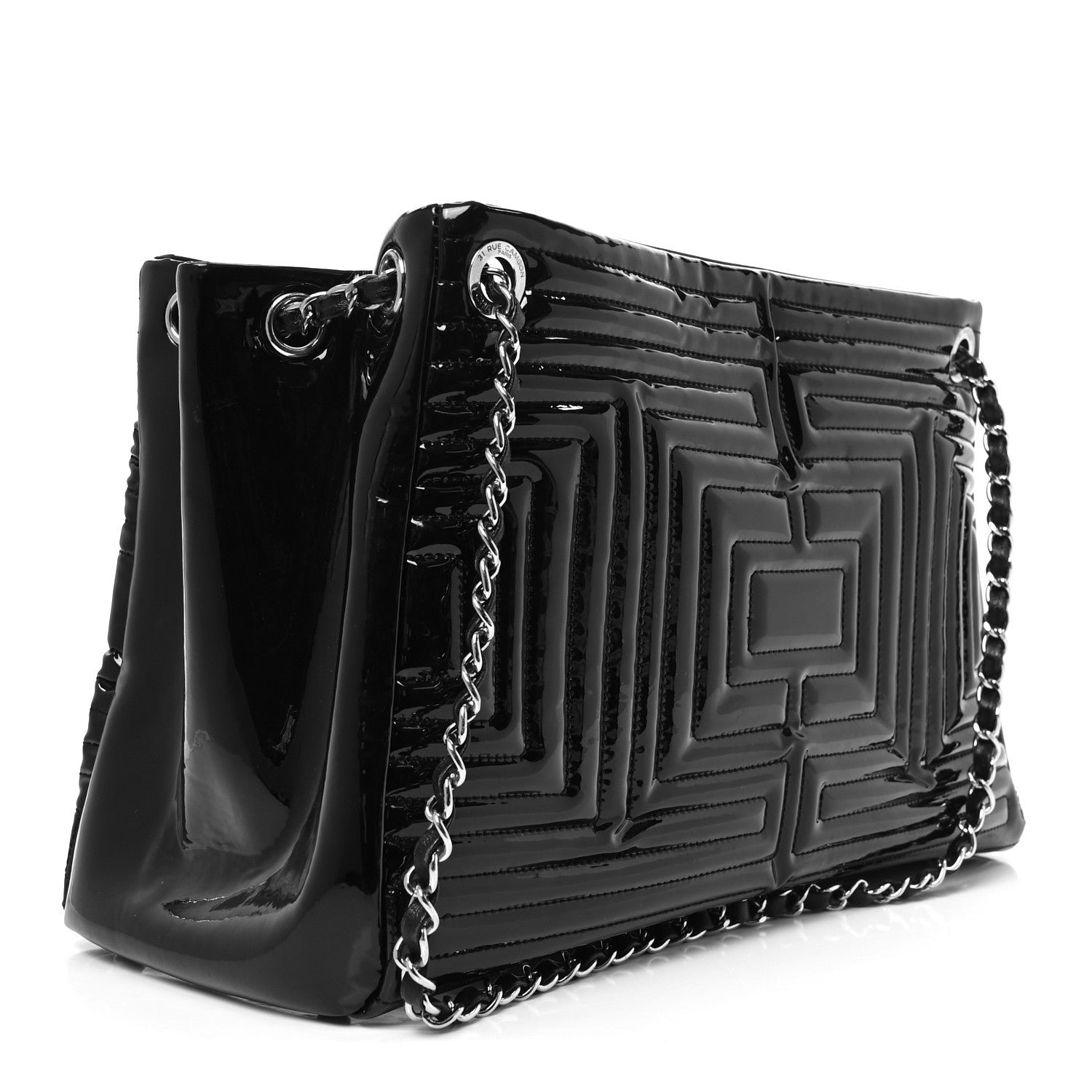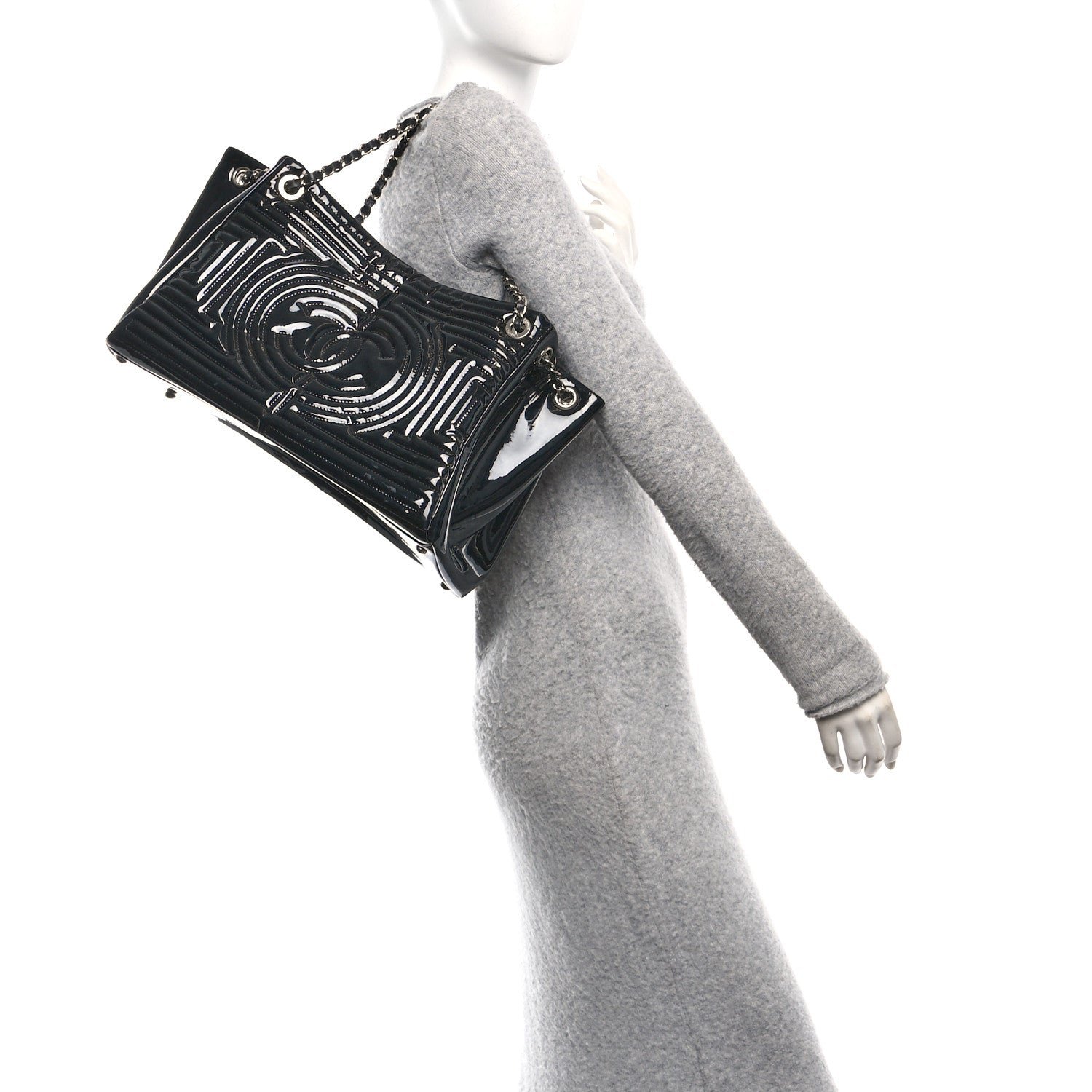 The Chanel Vinyl Coco Ming Tote in Black is a high-shine, architectural accessory from the house’s seasonal collections, recognized for its bold branding and modern, weather-resistant material. This piece stands out for its “liquid” look and structured, trapezoidal silhouette.