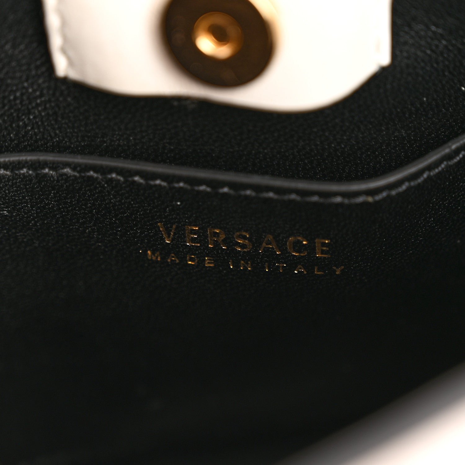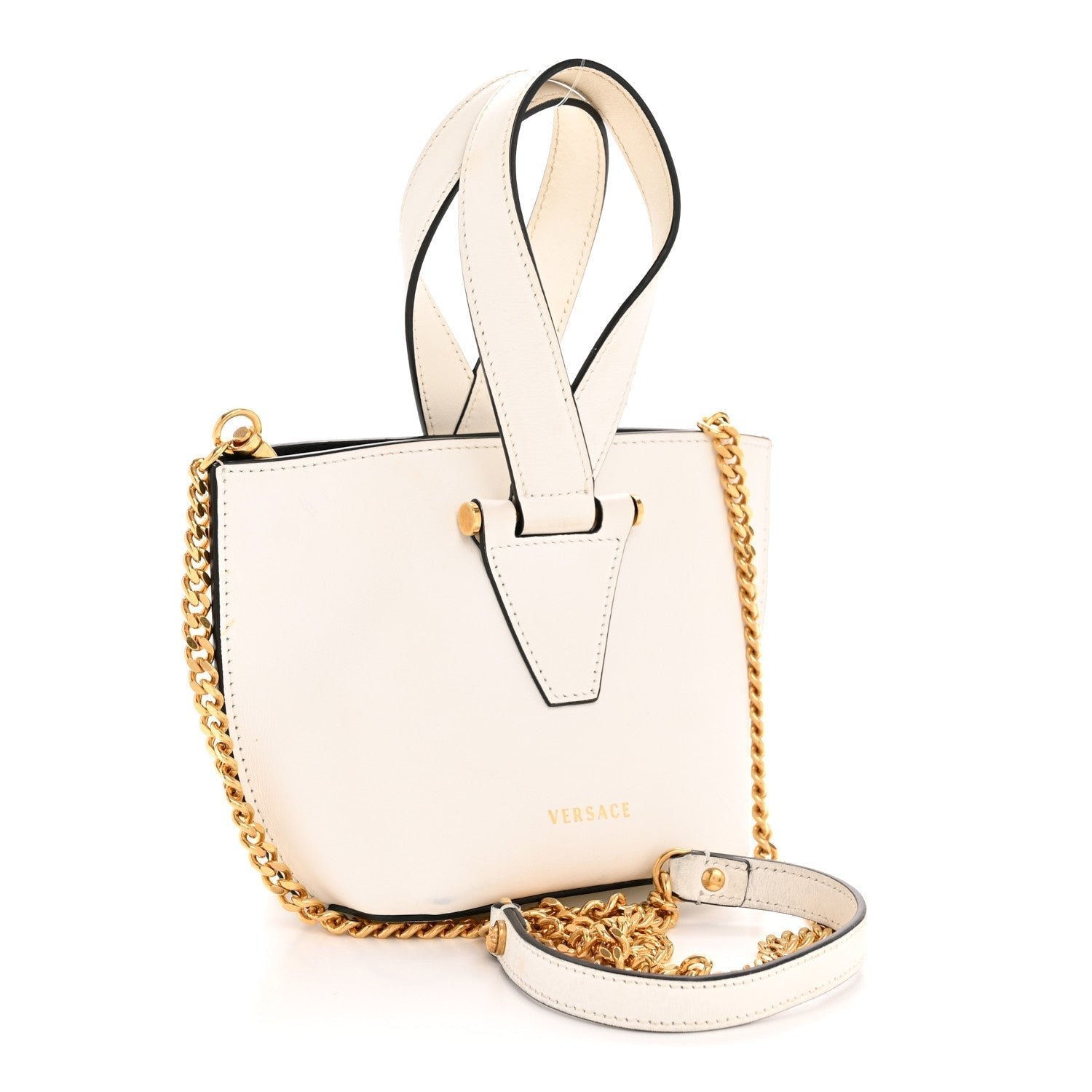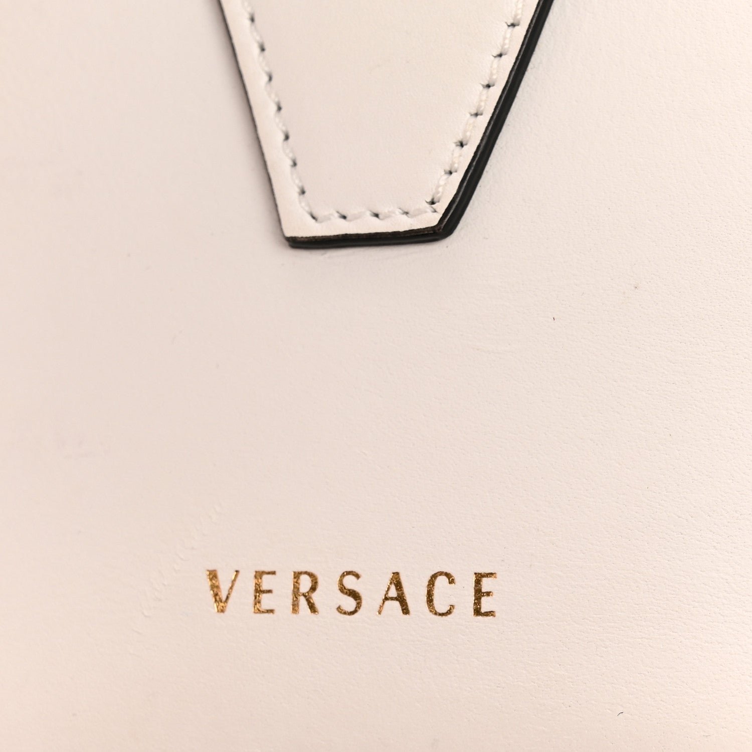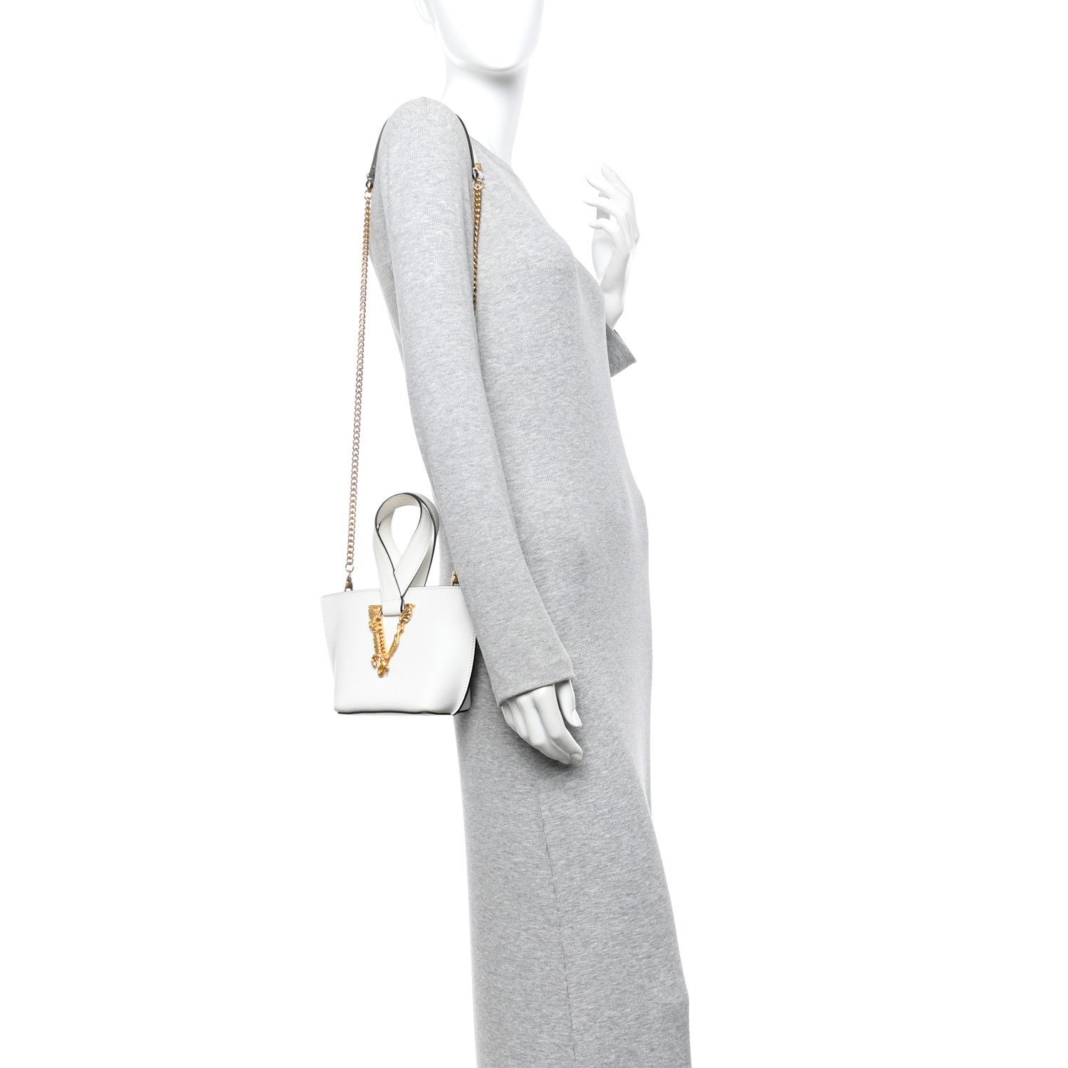 The Versace Vitello Mini Virtus Bucket Bag in White is a compact, high-fashion accessory that embodies the bold luxury of the Virtus line. Defined by the prominent Baroque V hardware, this bag transition seamlessly from day to evening.