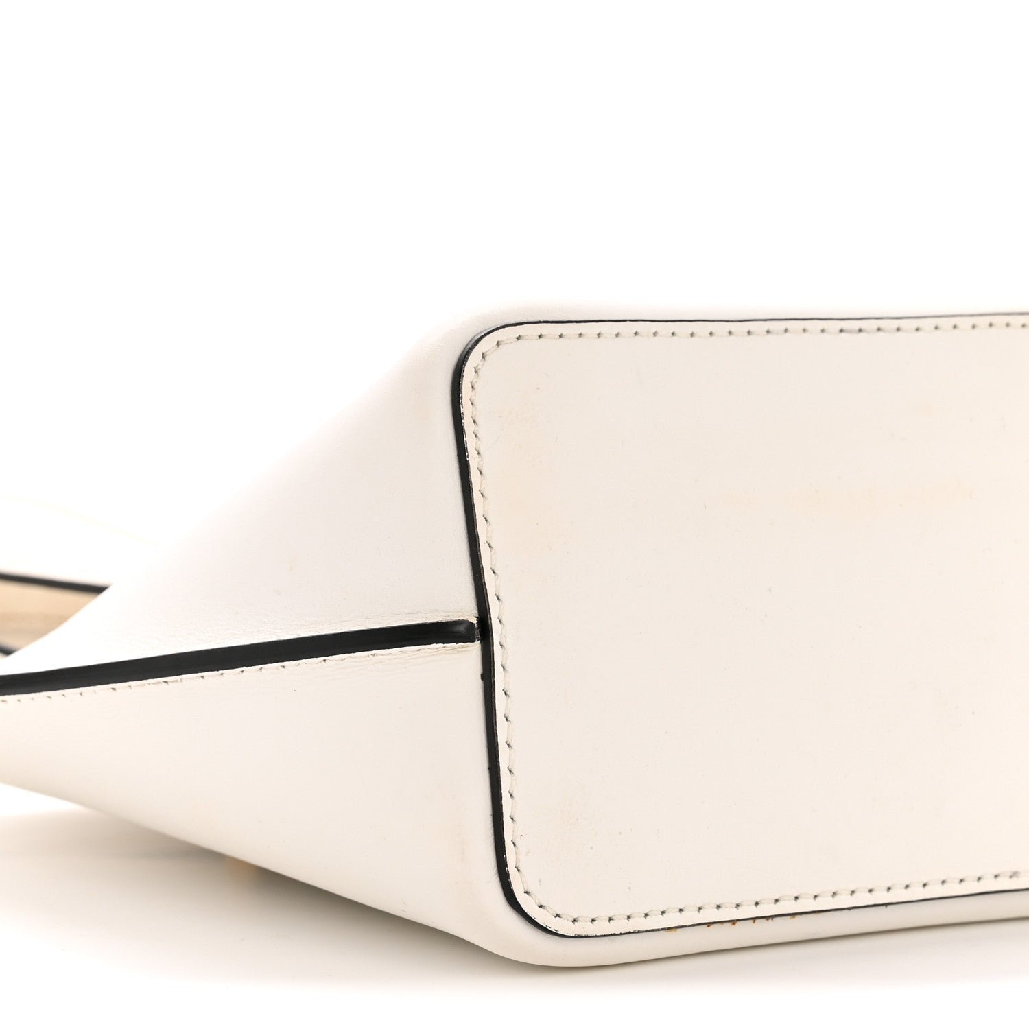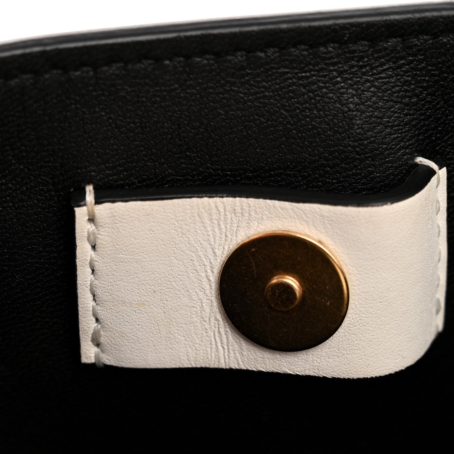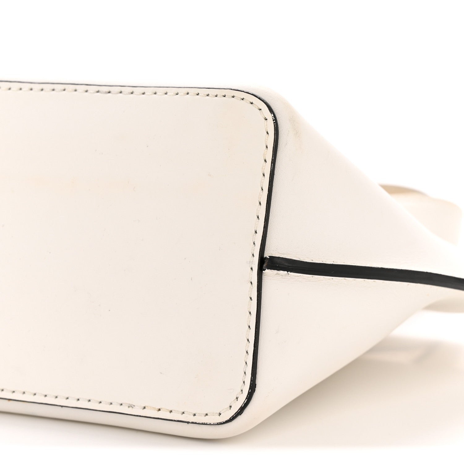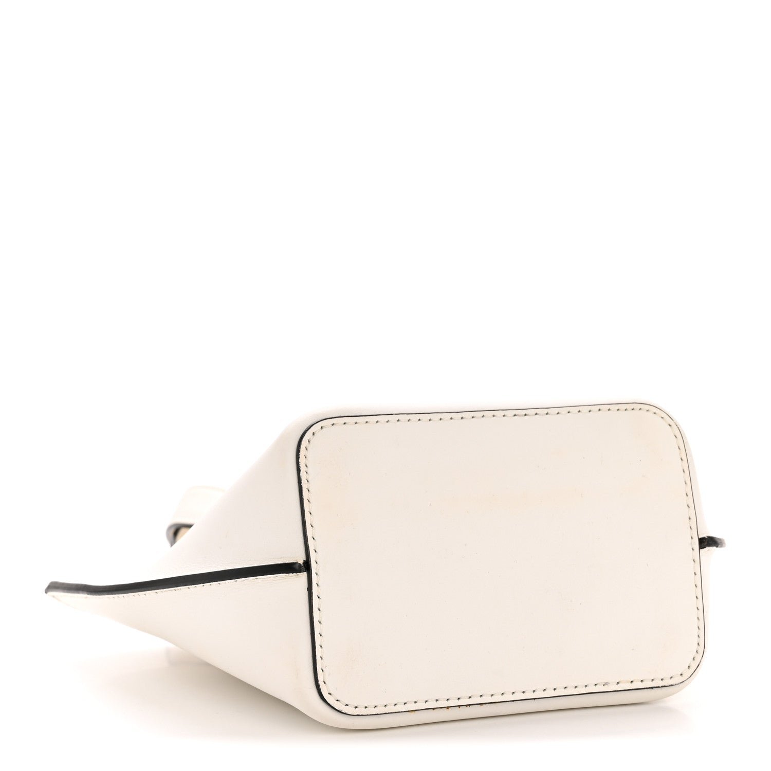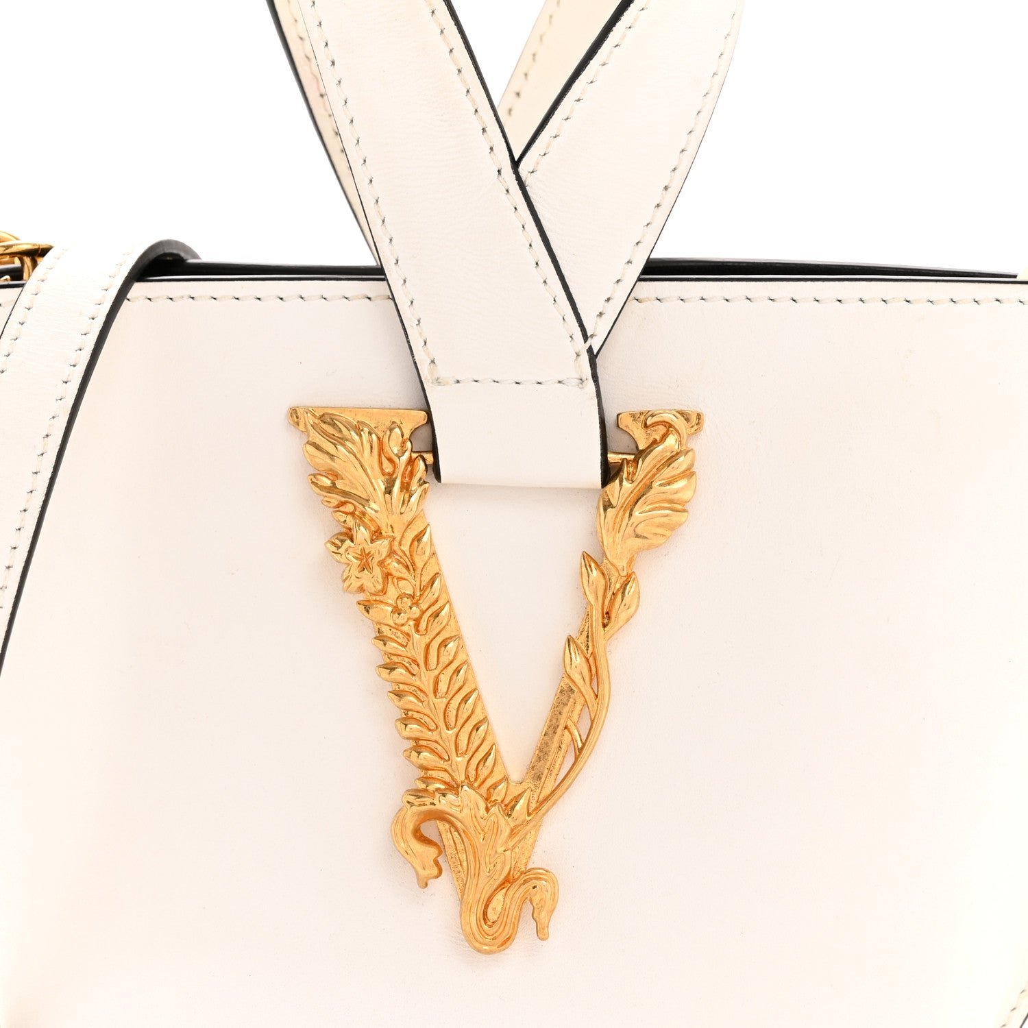 The Versace Vitello Mini Virtus Bucket Bag in White is a compact, high-fashion accessory that embodies the bold luxury of the Virtus line. Defined by the prominent Baroque V hardware, this bag transition seamlessly from day to evening.