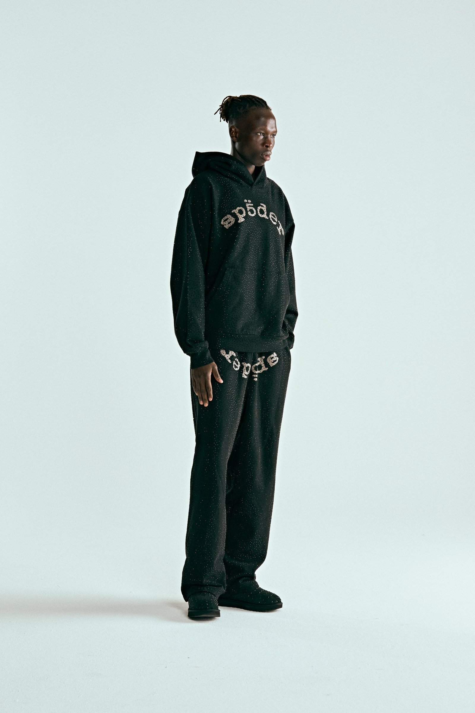 13oz, 100% cotton fleece. All over tonal rhinestone application. SP5DER text print across chest. Kangaroo pocket. Rib knit hem and cuffs.