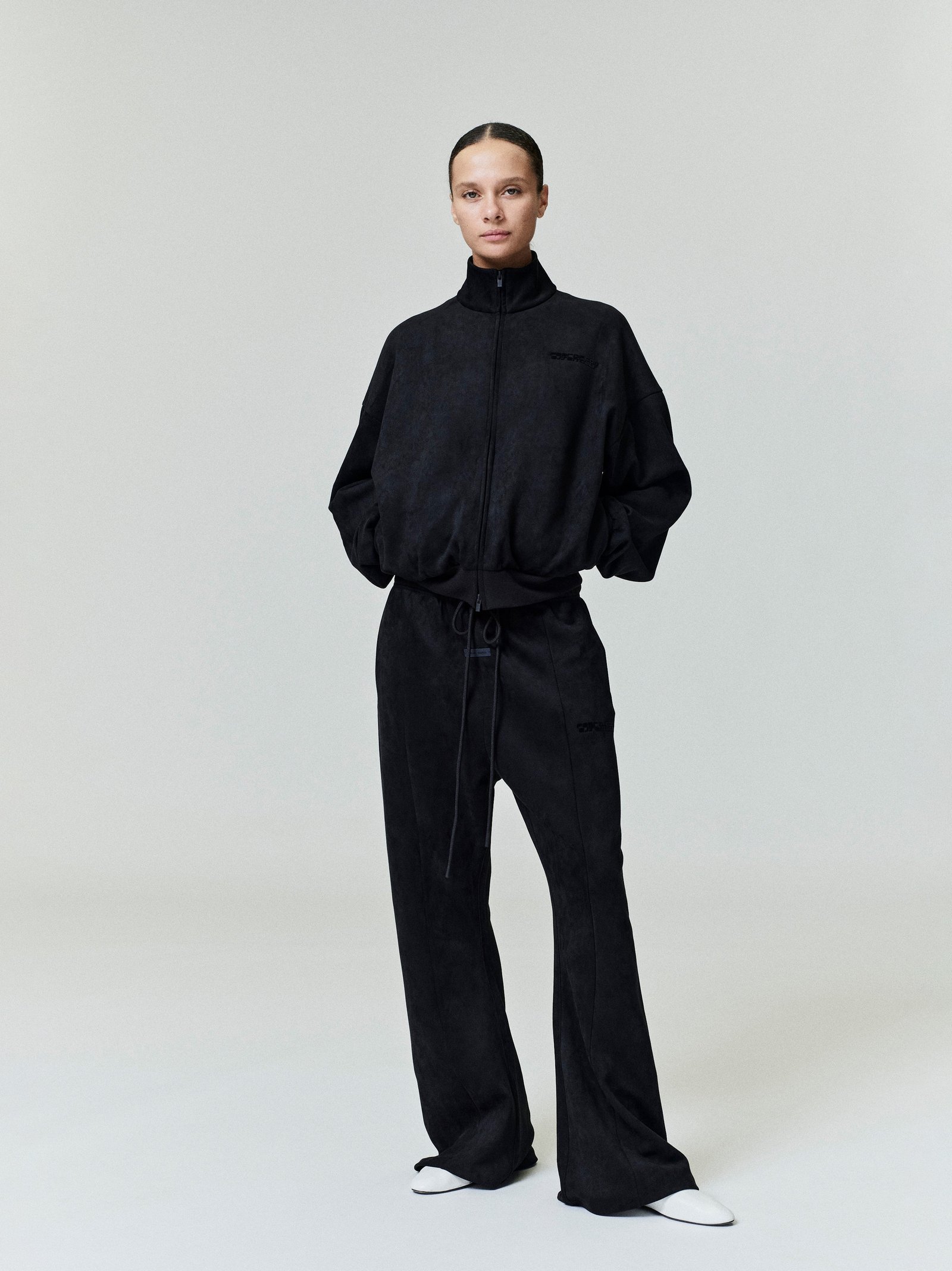 The Women’s Flare Sweatpant is crafted from bonded suede fleece, offering a plush, suede-like hand feel that complements its flared-leg silhouette. The pant is detailed with pintuck leg seams, encased elastic waistband with elongated drawcords, side seam pockets, and a Fear of God Essentials label stitched at the center front.