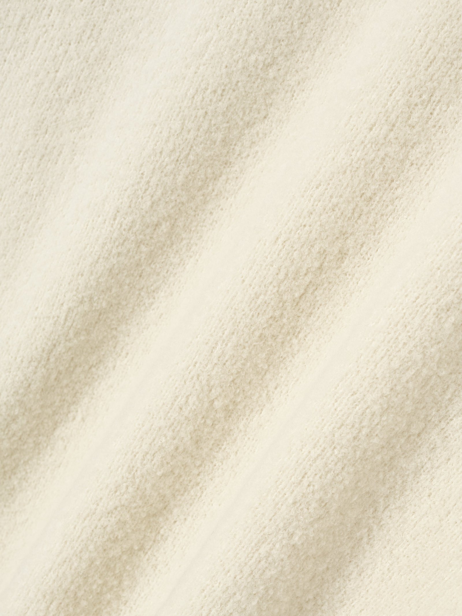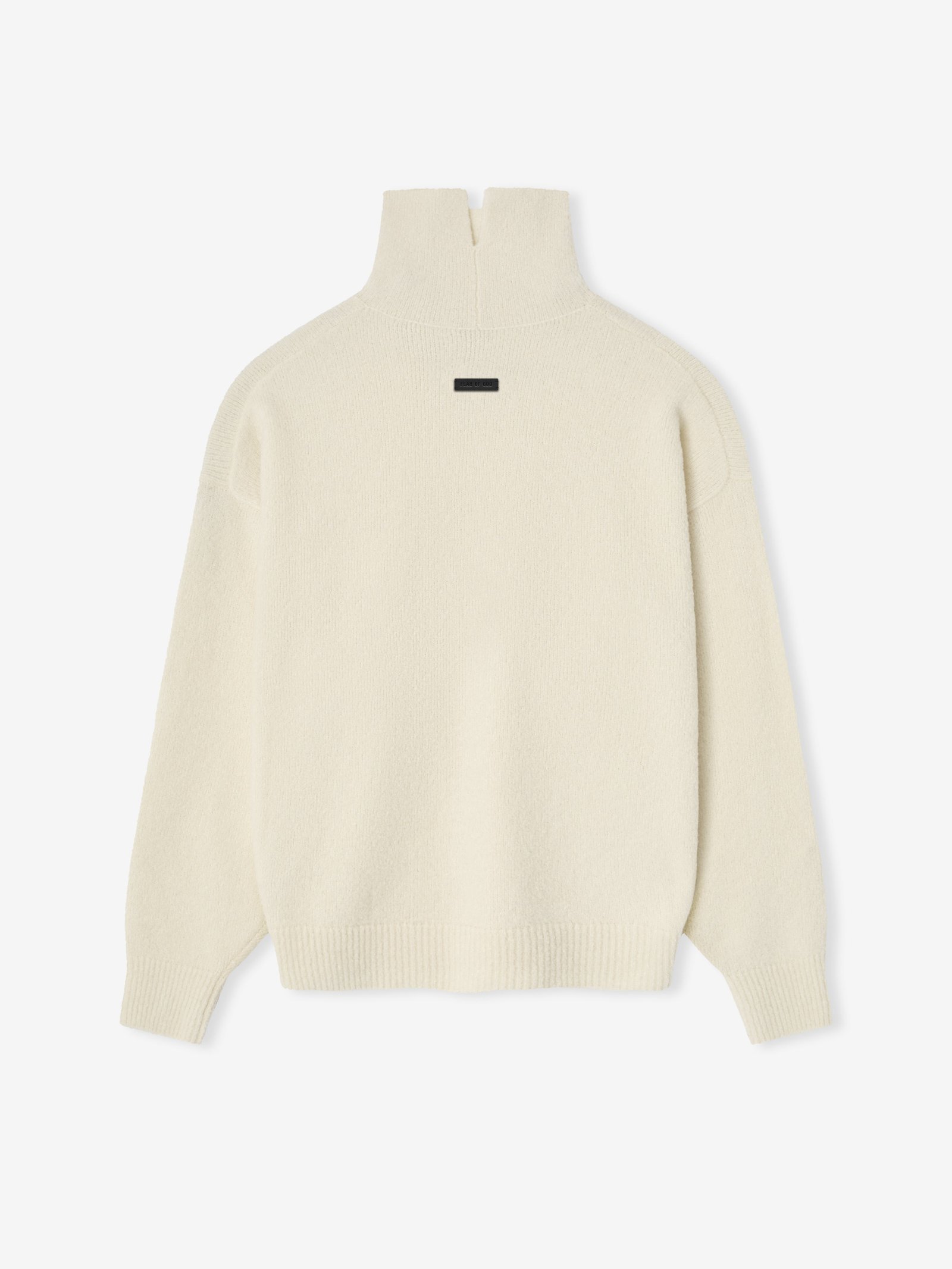 The Split Highneck Sweater is knitted in virgin wool-nylon for a warm hand with stretch comfort. The sweater has a relaxed fit, drop shoulders, knitted split high neck collar, cuffs and waist hem. A Fear of God label is stitched at the back collar.