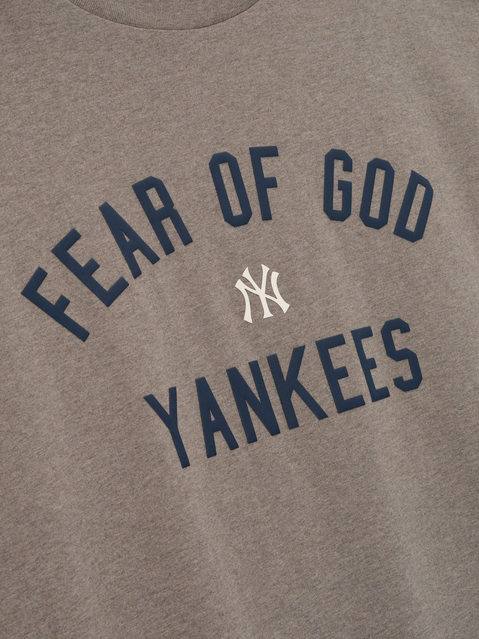 The Yankees 90s Tee is cut from 100% cotton jersey, offering a soft yet substantial hand feel. Designed in an oversized 90s-inspired silhouette, it features exaggerated proportions with dropped shoulders for a relaxed drape. The front is defined by a bold puffer-print application of the “Fear of God Yankees” lockup, alongside the MLB insignia on the sleeve. Across the back, an official New York logo anchors the piece with the signature rubberized Fear of God Essentials label at the collar.